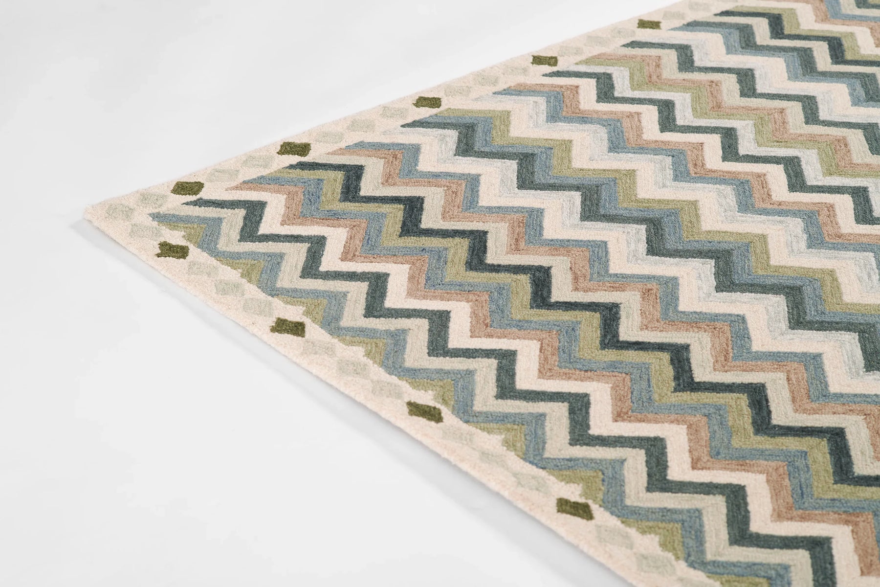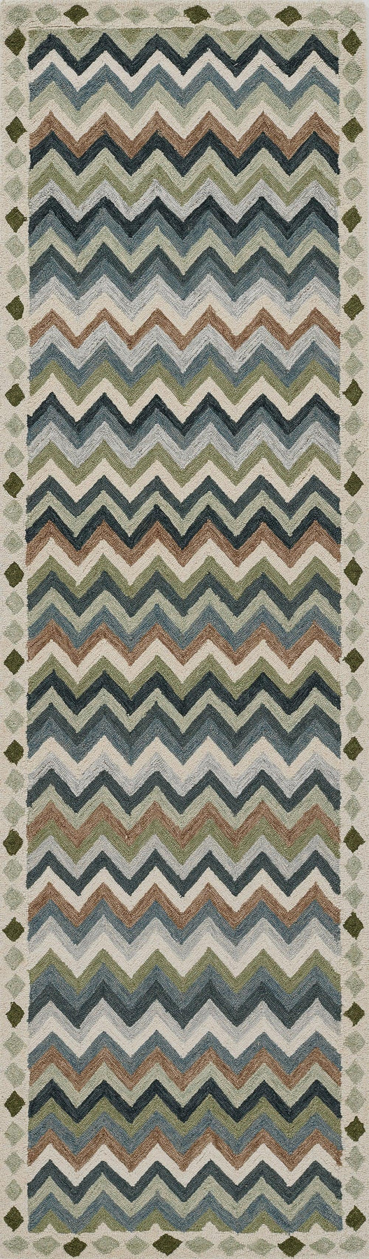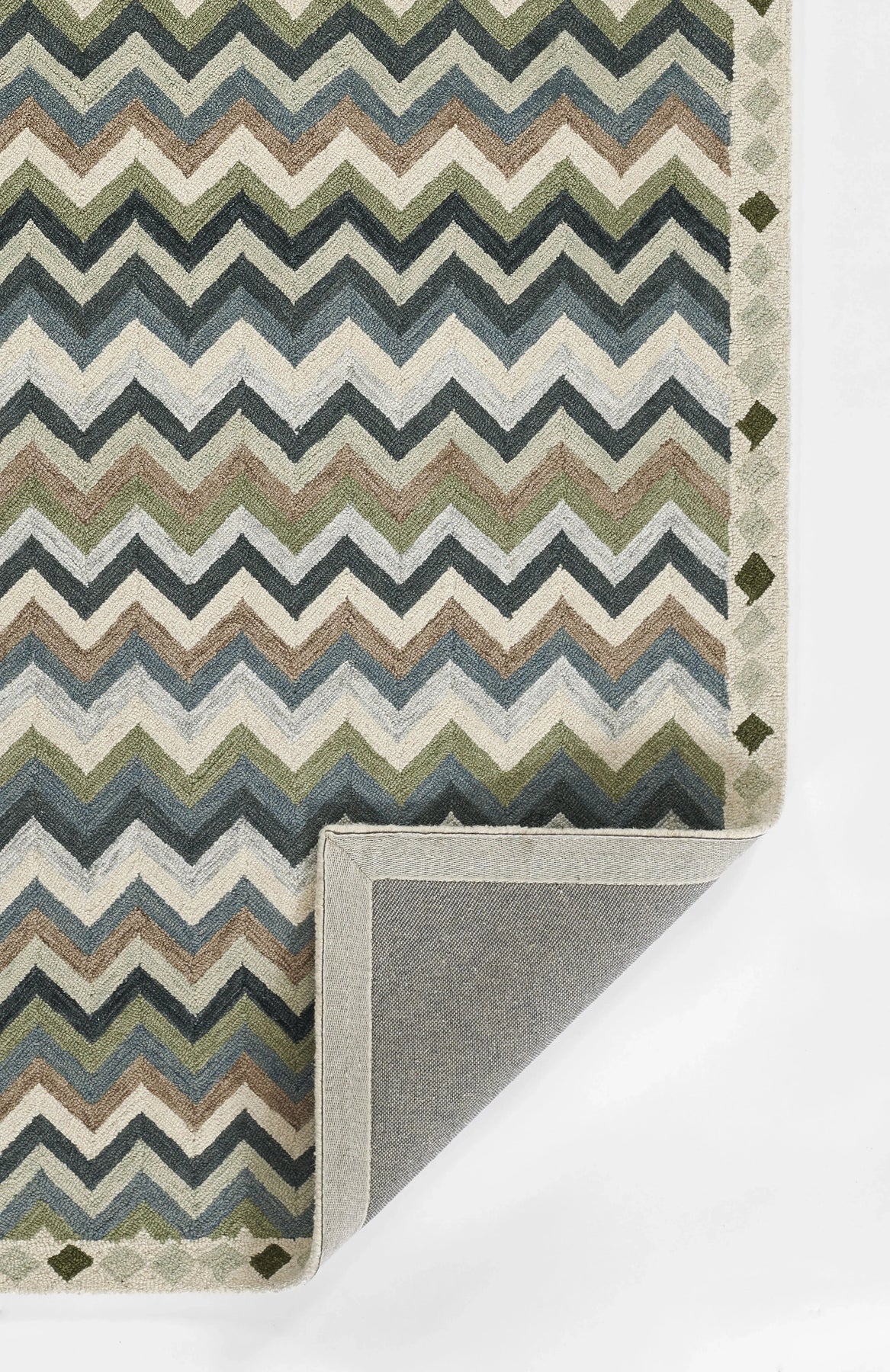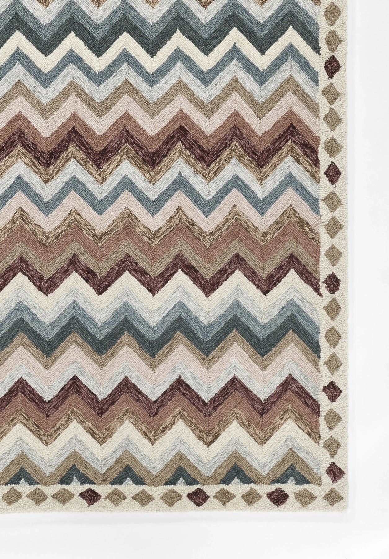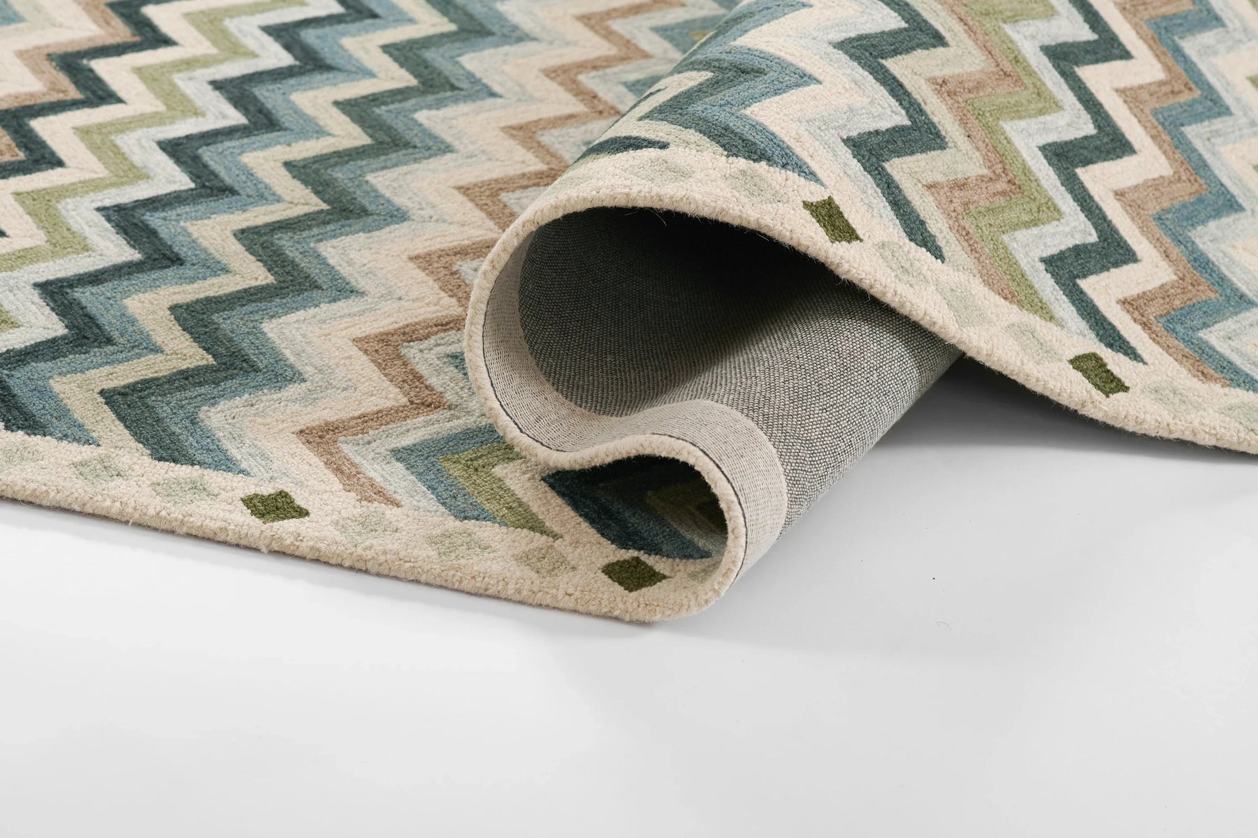 Infuse your space with vibrant heritage and modern flair with this multicolor blue geometric rug from the Abbot Collection. Inspired by the bold geometry of vintage Turkish Kilims, this rug features a dynamic chevron pattern in a curated palette of earthy greens, denim blues, warm taupes, and soft blush tones—blending tradition with a distinctly contemporary aesthetic. Crafted from 100% wool and hand-tufted by skilled artisans in India, this rug offers a soft, durable surface designed to resist shedding. The zigzag design introduces movement and texture to your space, while the clean symmetry keeps the overall look grounded and versatile. Perfect for living rooms, dining areas, or bedrooms, this rug is a statement piece that balances heritage patterning with modern color sensibility.
