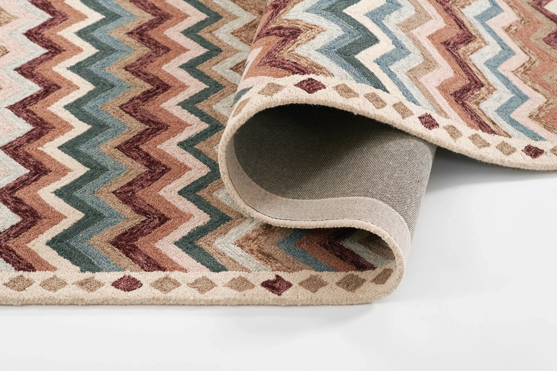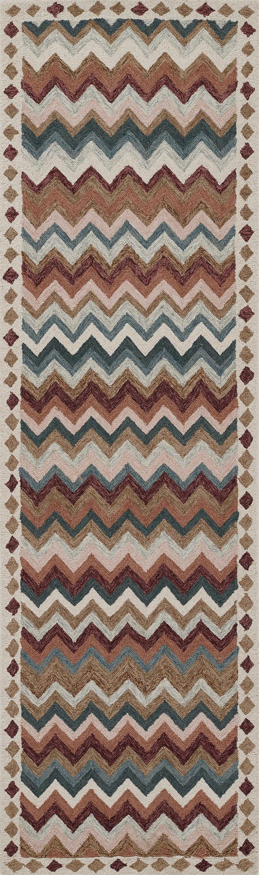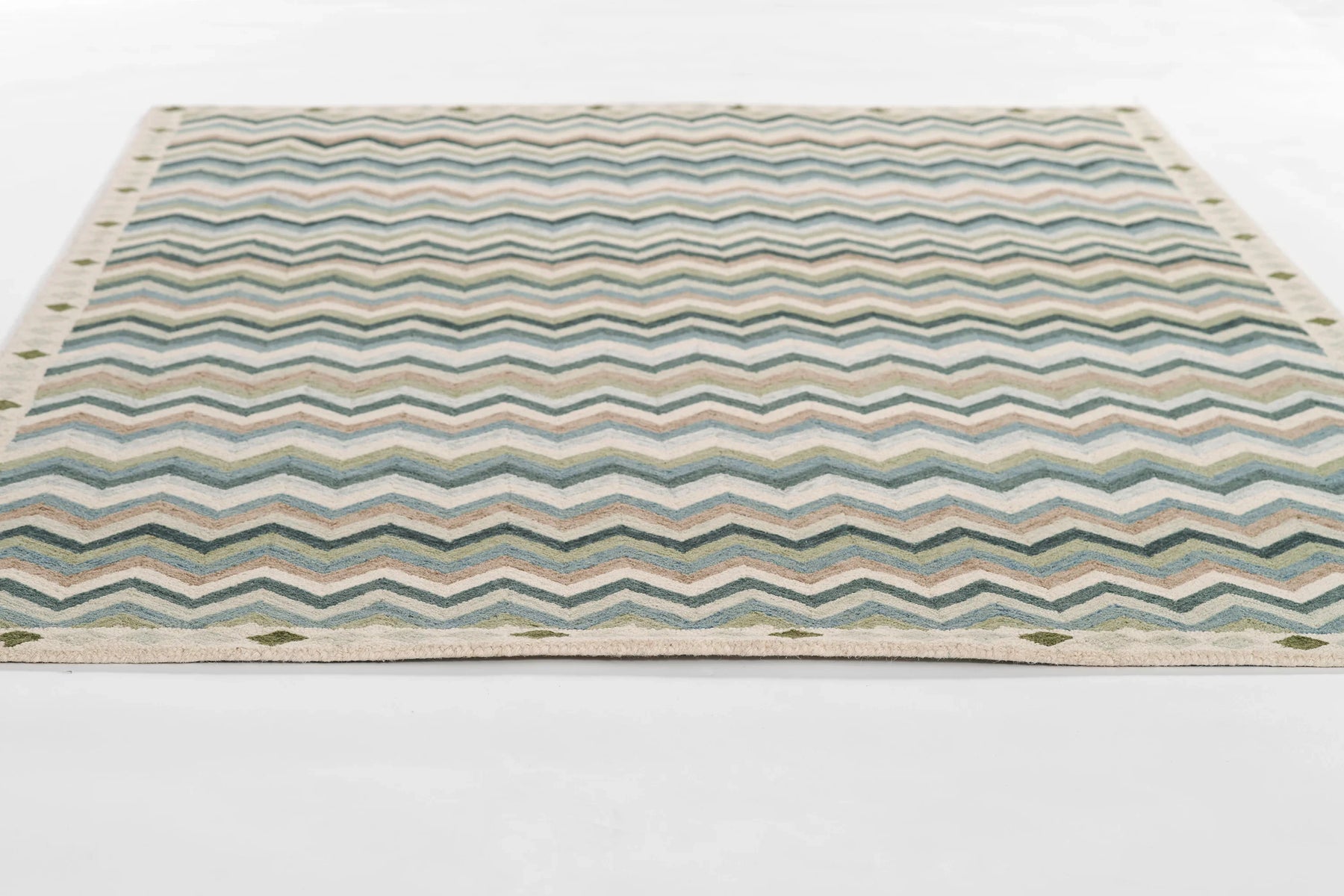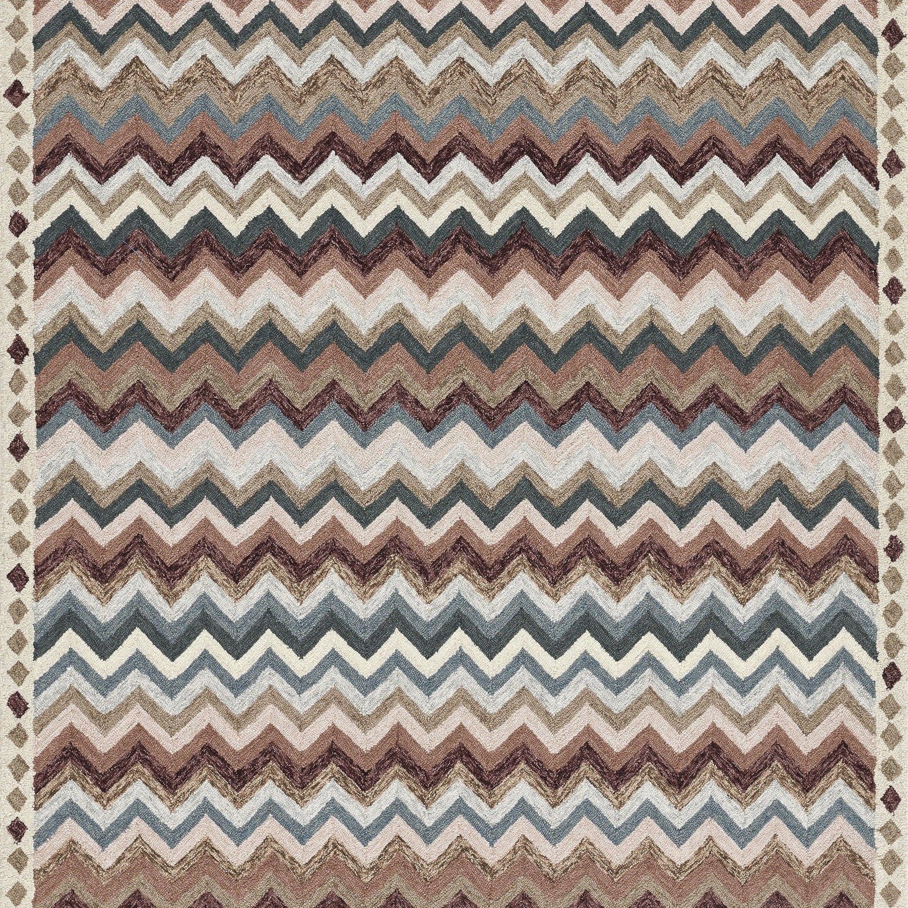 Infuse your space with vibrant heritage and modern flair with this multicolor blue geometric rug from the Abbot Collection. Inspired by the bold geometry of vintage Turkish Kilims, this rug features a dynamic chevron pattern in a curated palette of earthy greens, denim blues, warm taupes, and soft blush tones—blending tradition with a distinctly contemporary aesthetic. Crafted from 100% wool and hand-tufted by skilled artisans in India, this rug offers a soft, durable surface designed to resist shedding. The zigzag design introduces movement and texture to your space, while the clean symmetry keeps the overall look grounded and versatile. Perfect for living rooms, dining areas, or bedrooms, this rug is a statement piece that balances heritage patterning with modern color sensibility.