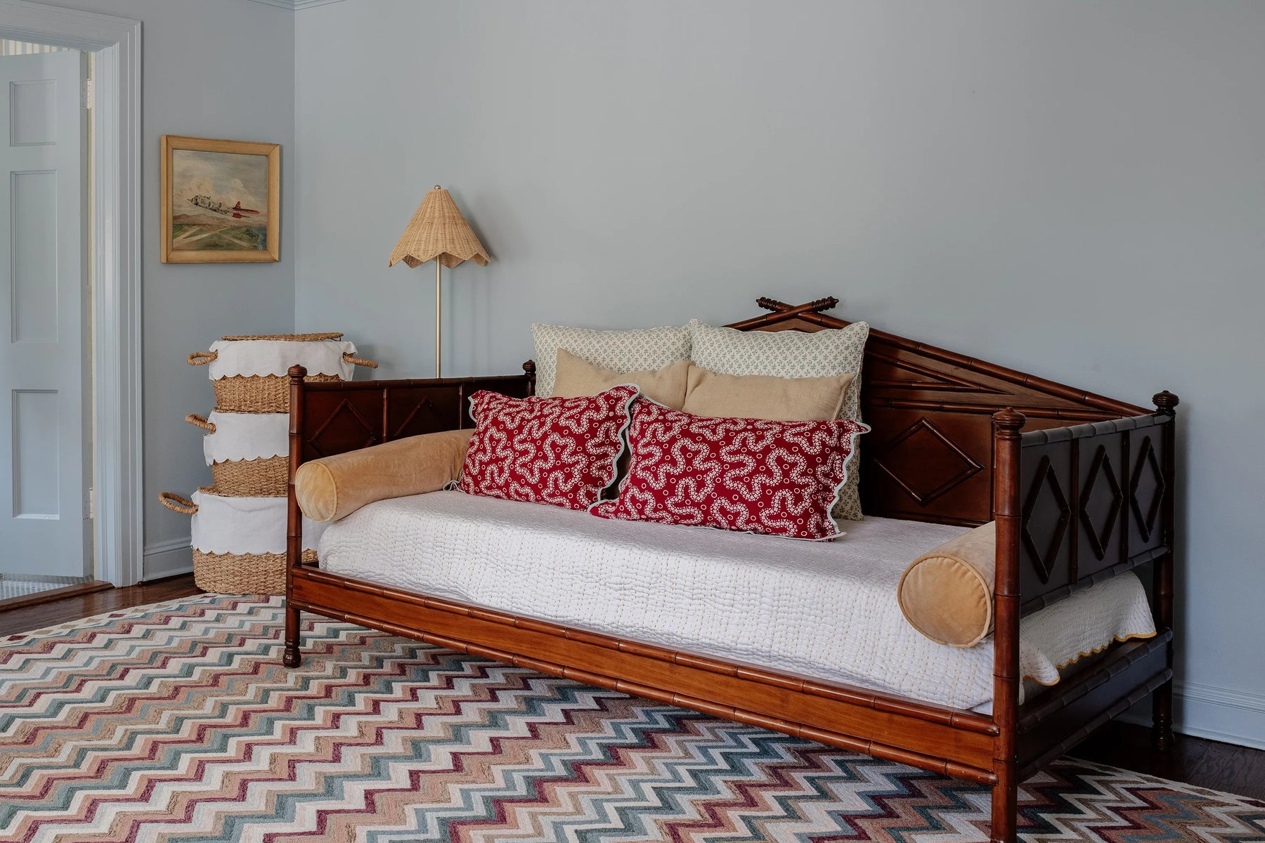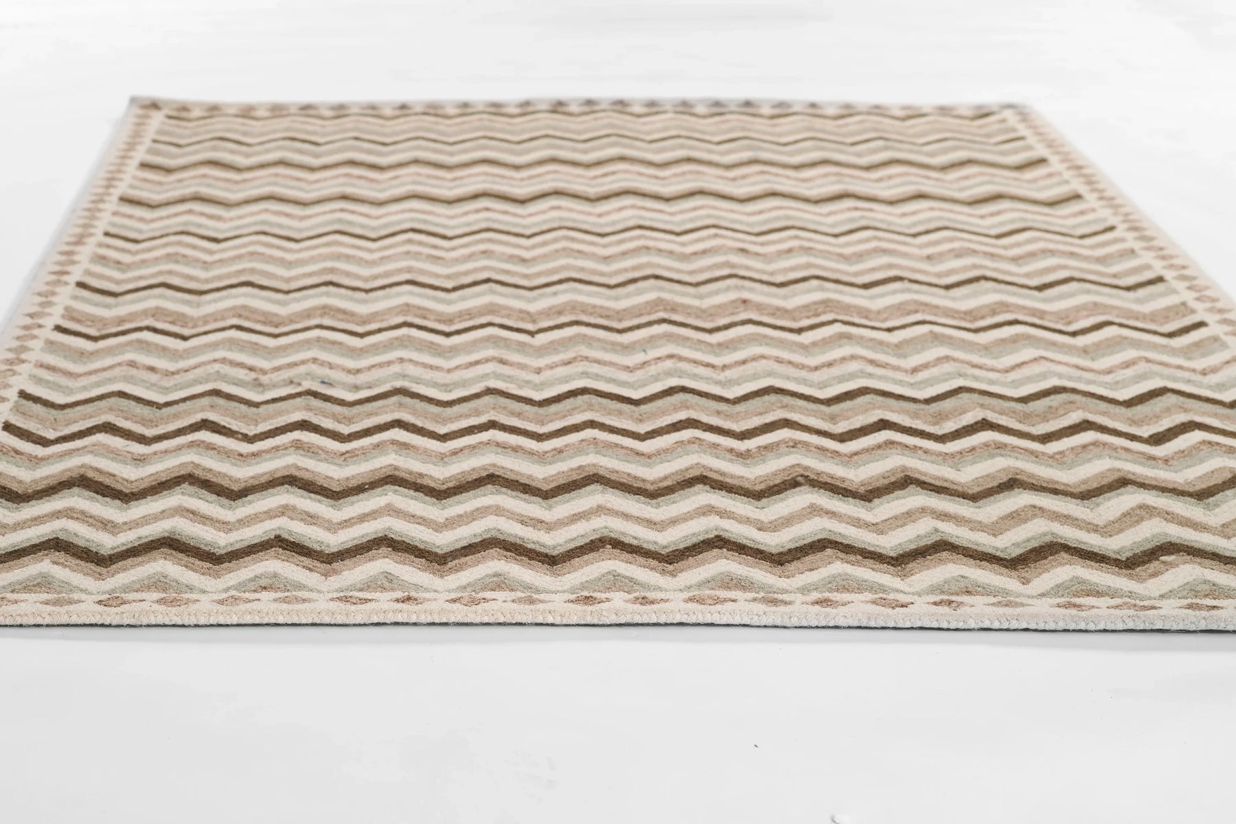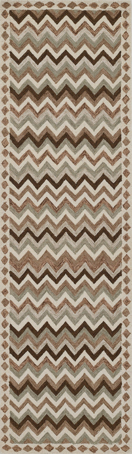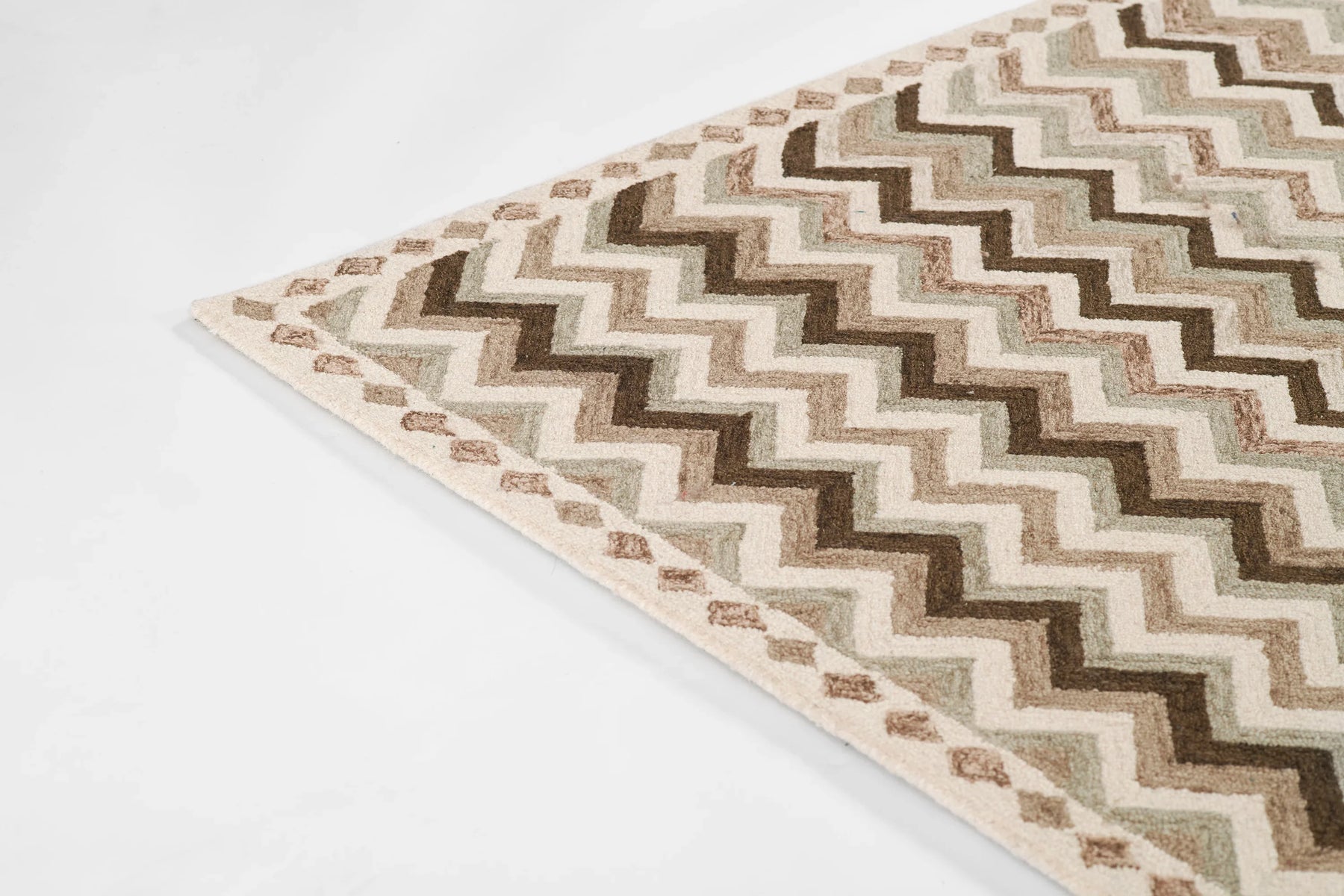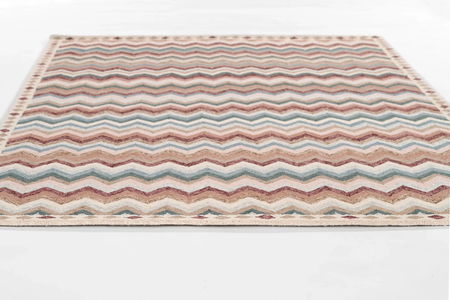 Infuse your space with vibrant heritage and modern flair with this multicolor blue geometric rug from the Abbot Collection. Inspired by the bold geometry of vintage Turkish Kilims, this rug features a dynamic chevron pattern in a curated palette of earthy greens, denim blues, warm taupes, and soft blush tones—blending tradition with a distinctly contemporary aesthetic. Crafted from 100% wool and hand-tufted by skilled artisans in India, this rug offers a soft, durable surface designed to resist shedding. The zigzag design introduces movement and texture to your space, while the clean symmetry keeps the overall look grounded and versatile. Perfect for living rooms, dining areas, or bedrooms, this rug is a statement piece that balances heritage patterning with modern color sensibility.