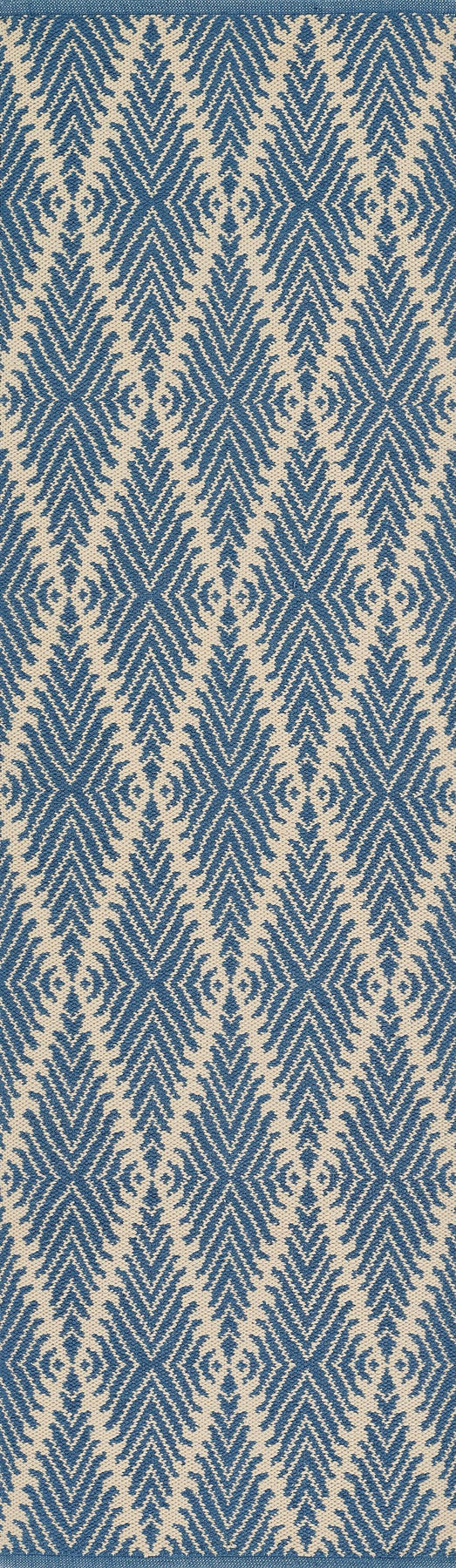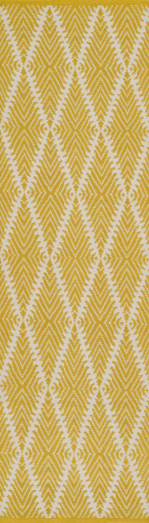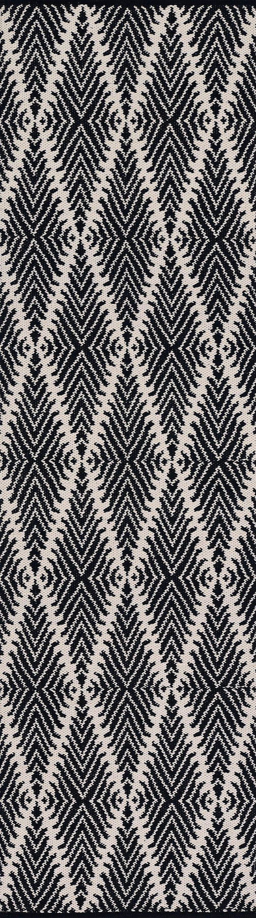 Traditional patterns take new form in the tribal design of this decorative area rug. Each rug is defined by an elongated diamond trellis pattern, filled with stripes in bold shades of black, blue, yellow and orange. Synthetic fibers make each hand-woven floorcovering suitable for well-travelled floors throughout the home.