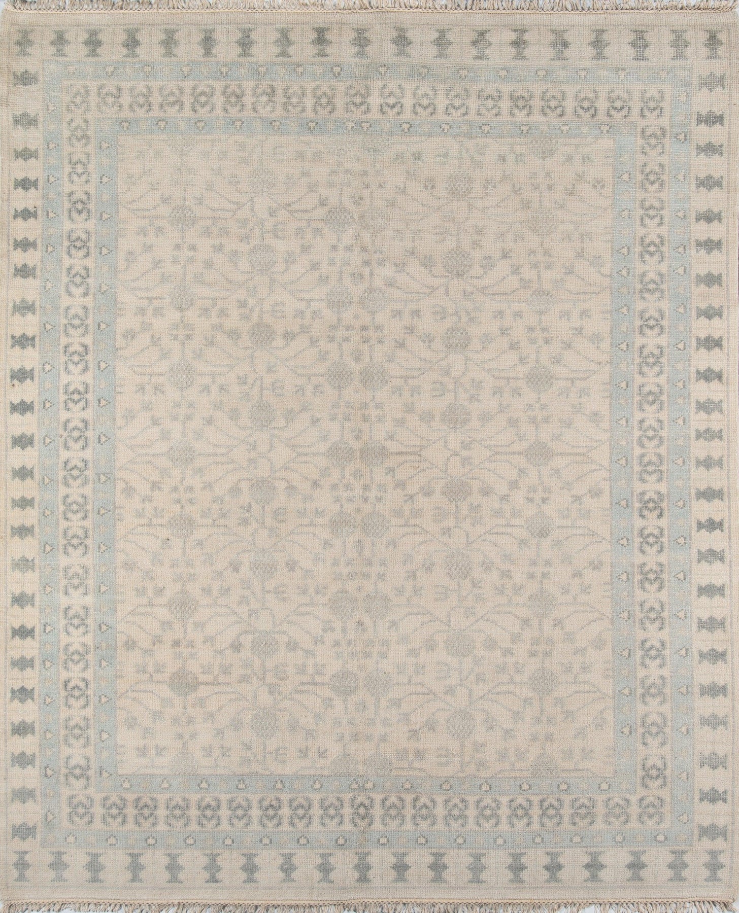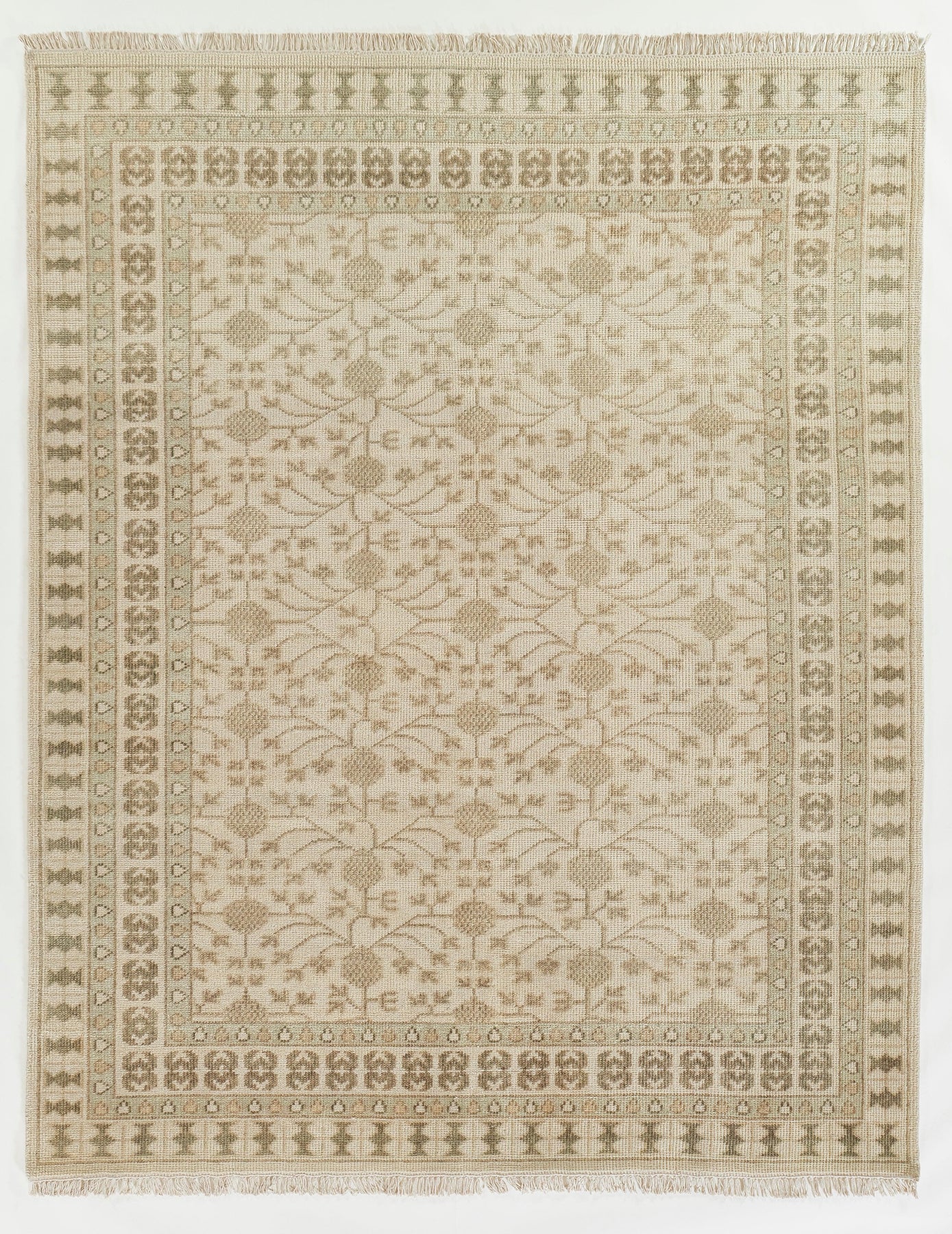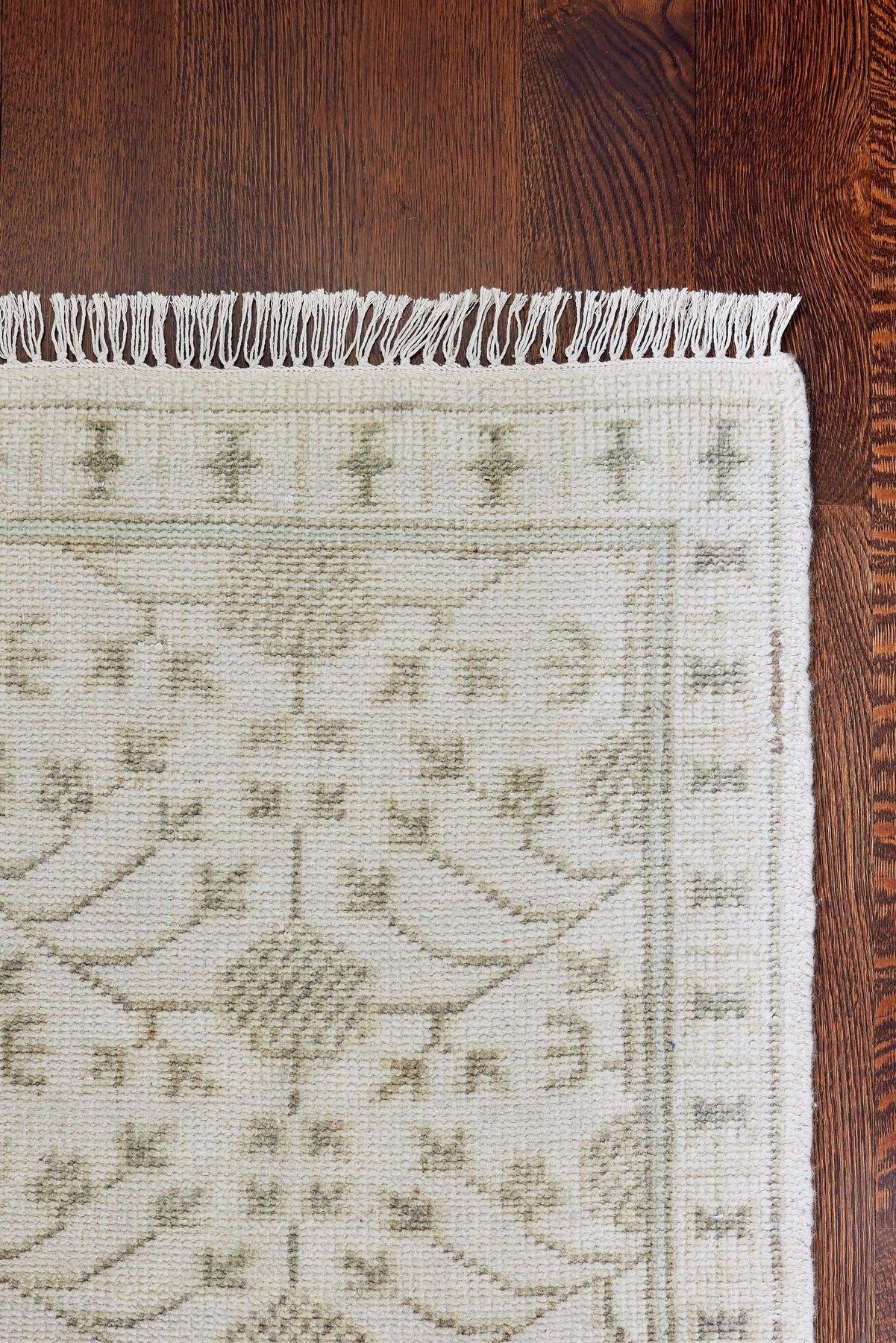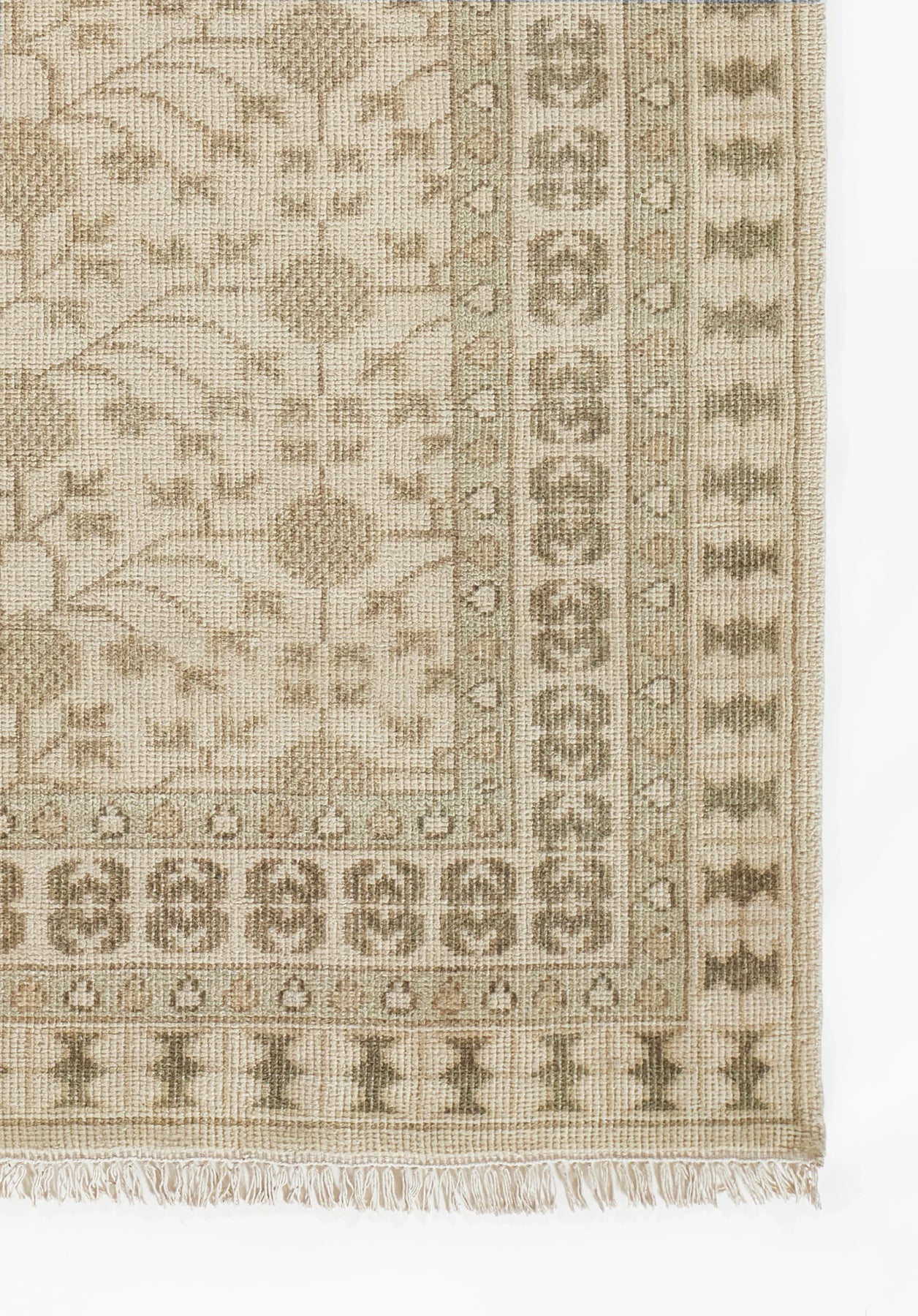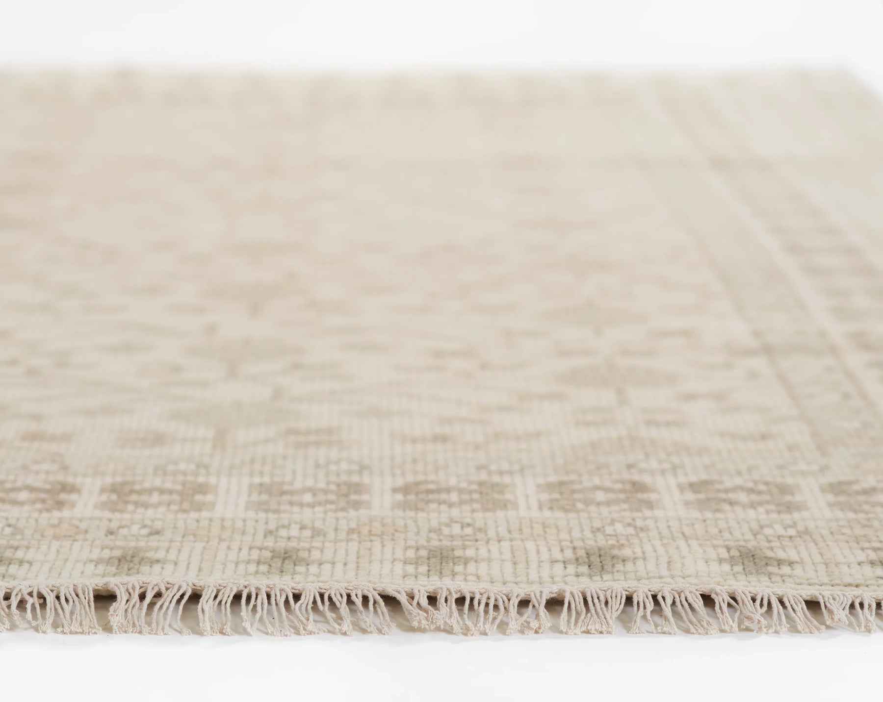 Rich in both history and quality, this hand knotted rug is made with natural wool fibers in beautiful neutral shades. Adorned with Persian and Moroccan motifs, its washed color palette lends a vintage look with the durability of new fibers and construction. It’s an ideal addition for the modern bohemian’s living space.
