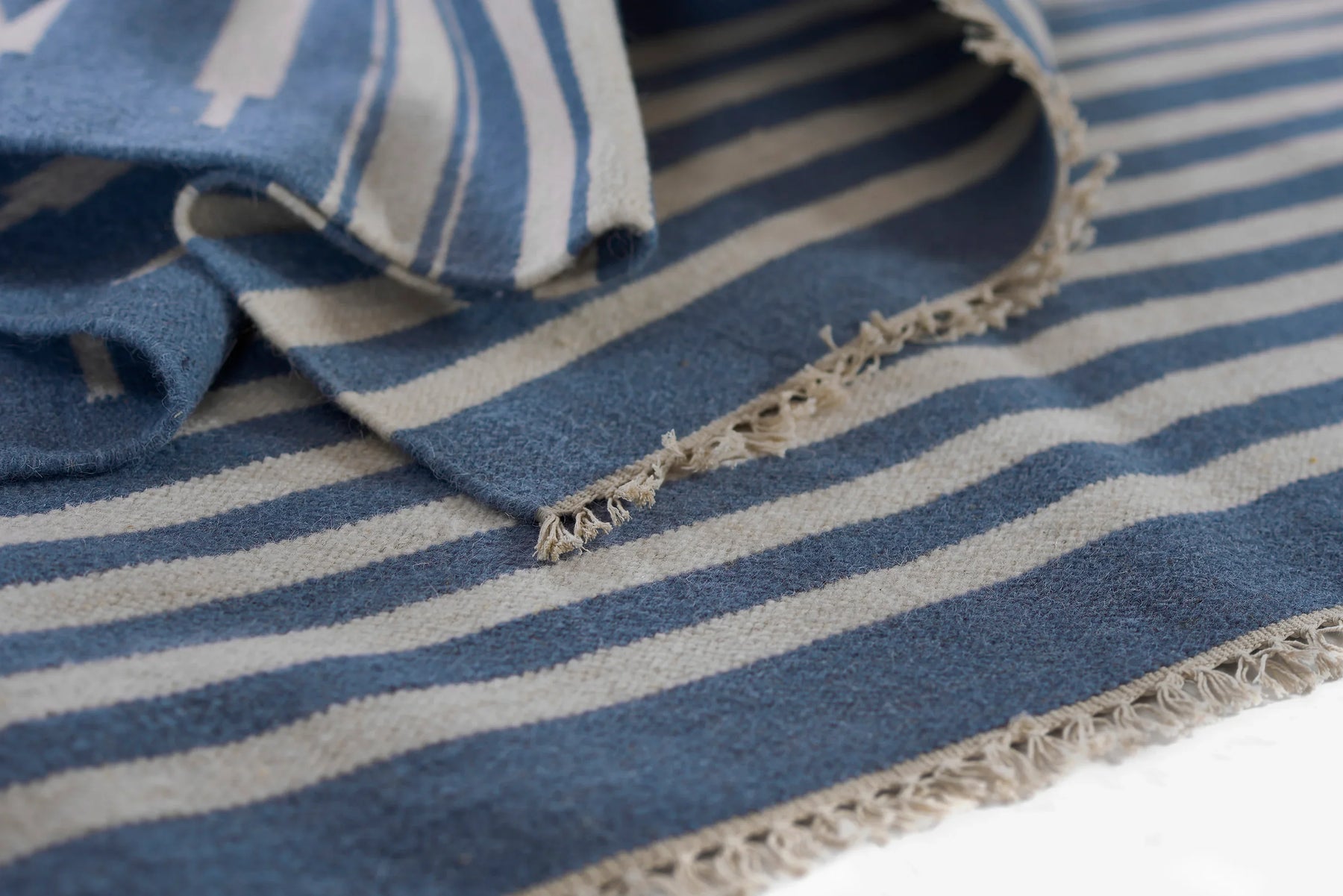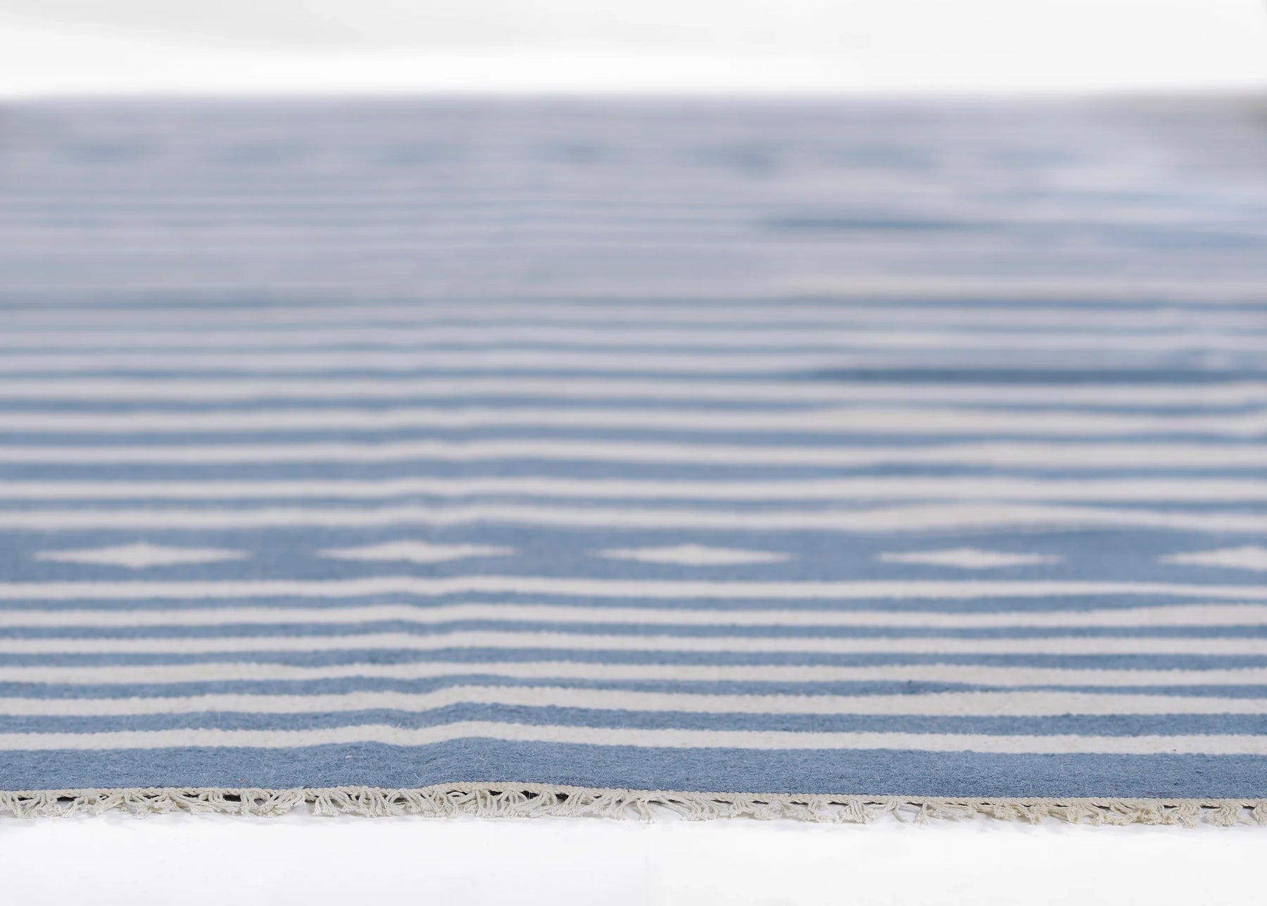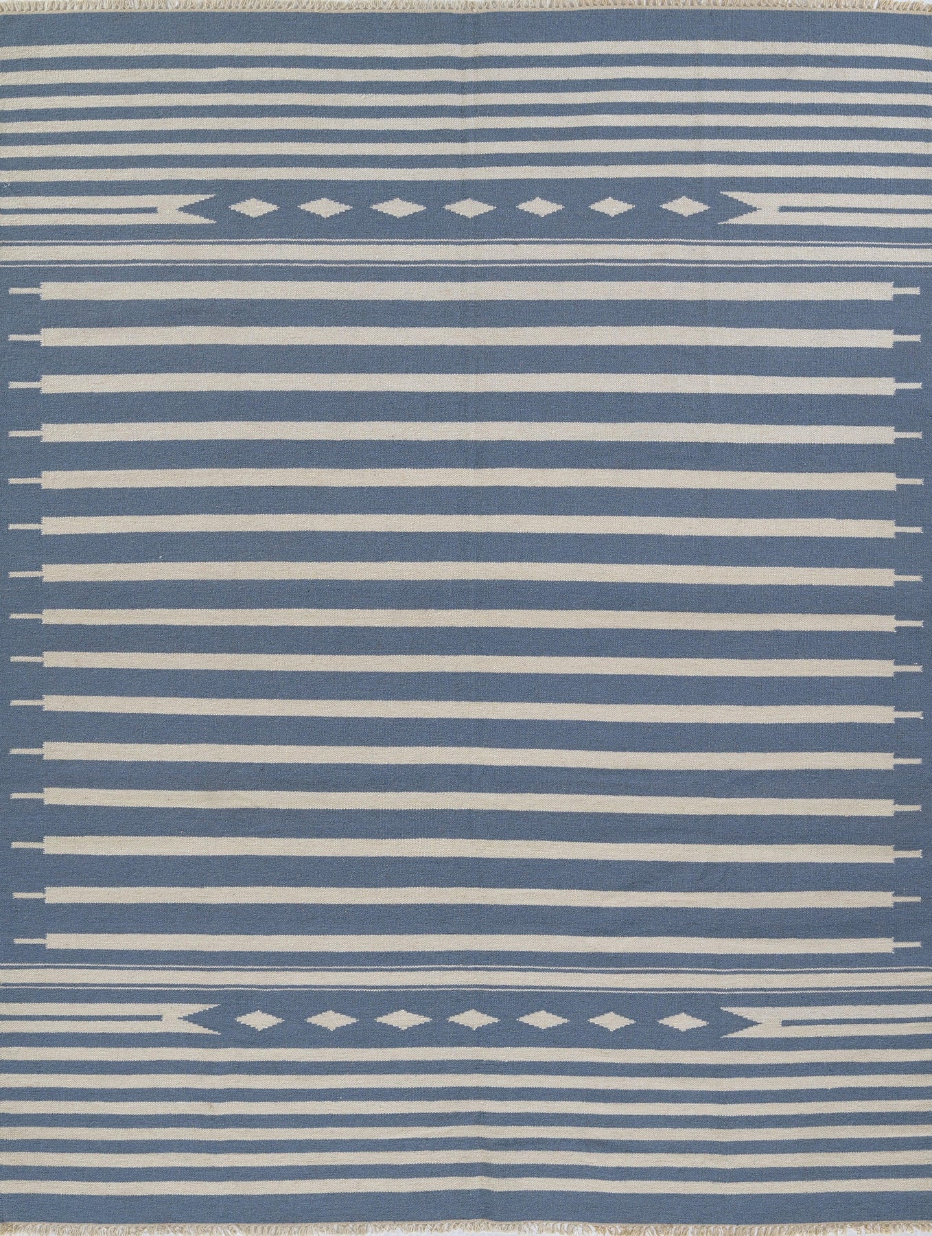 Timeless hand woven carpet techniques enhance the artisanal quality of this decorative area rug. Captured in colors ranging from pastel pink and ivory to denim blue and dove gray, fringed edges feel utterly bohemian beside bold geometric patterns and tribal motifs. Renown for its superior wear and stain resistance, 100% natural wool fibers make each decorative floorcovering a true statement piece with sustainable beauty.
