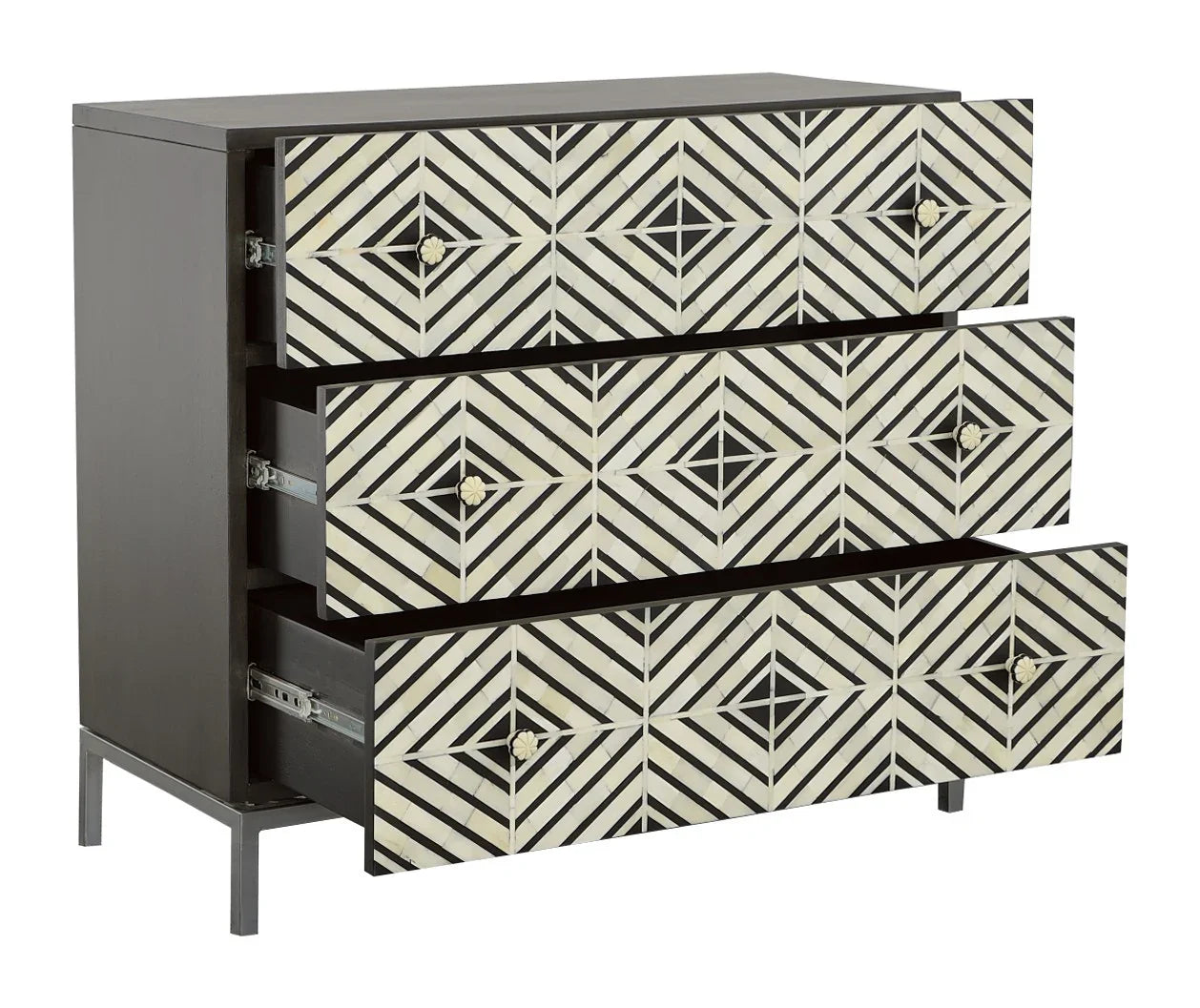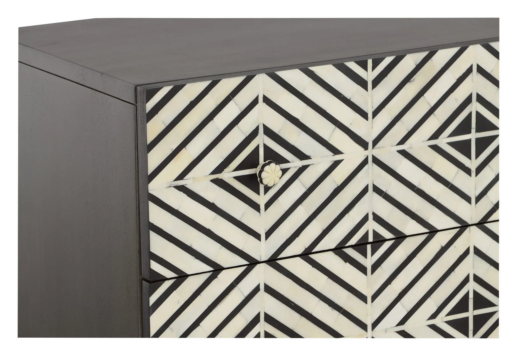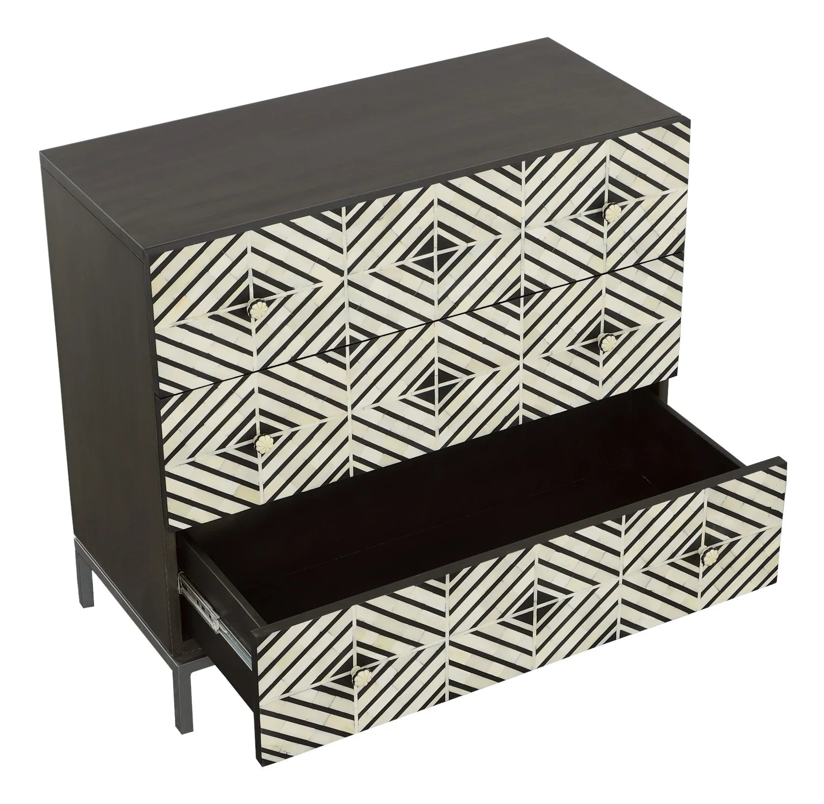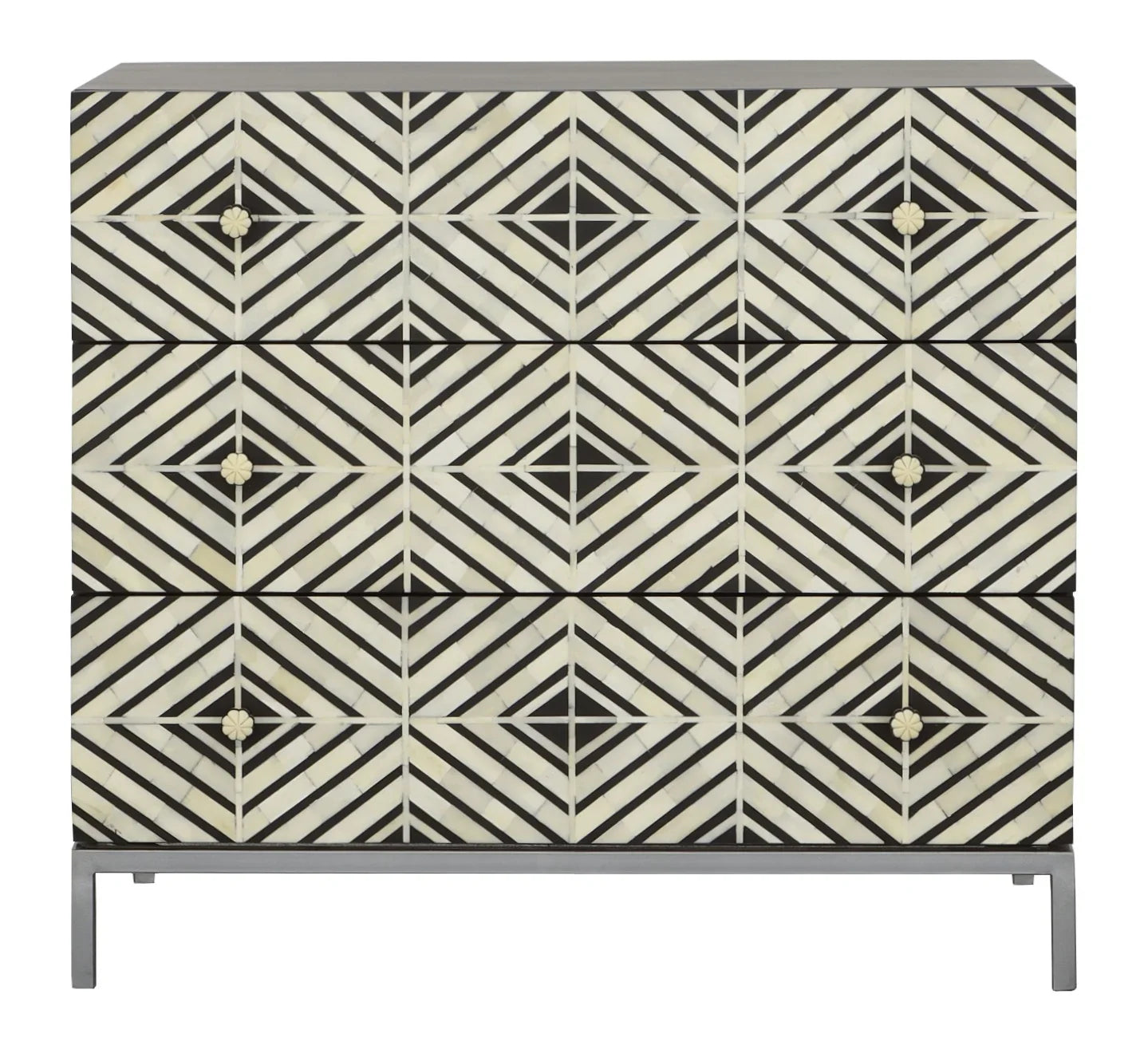 Mango solid case featuring decorative bone inlay creating a geometric design. Metal base accents this decorative chest.