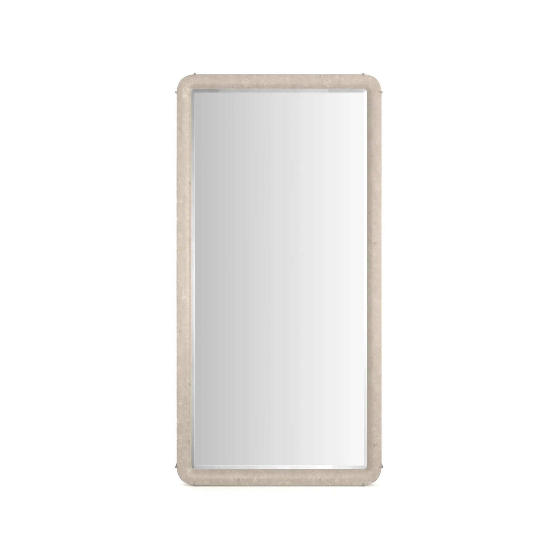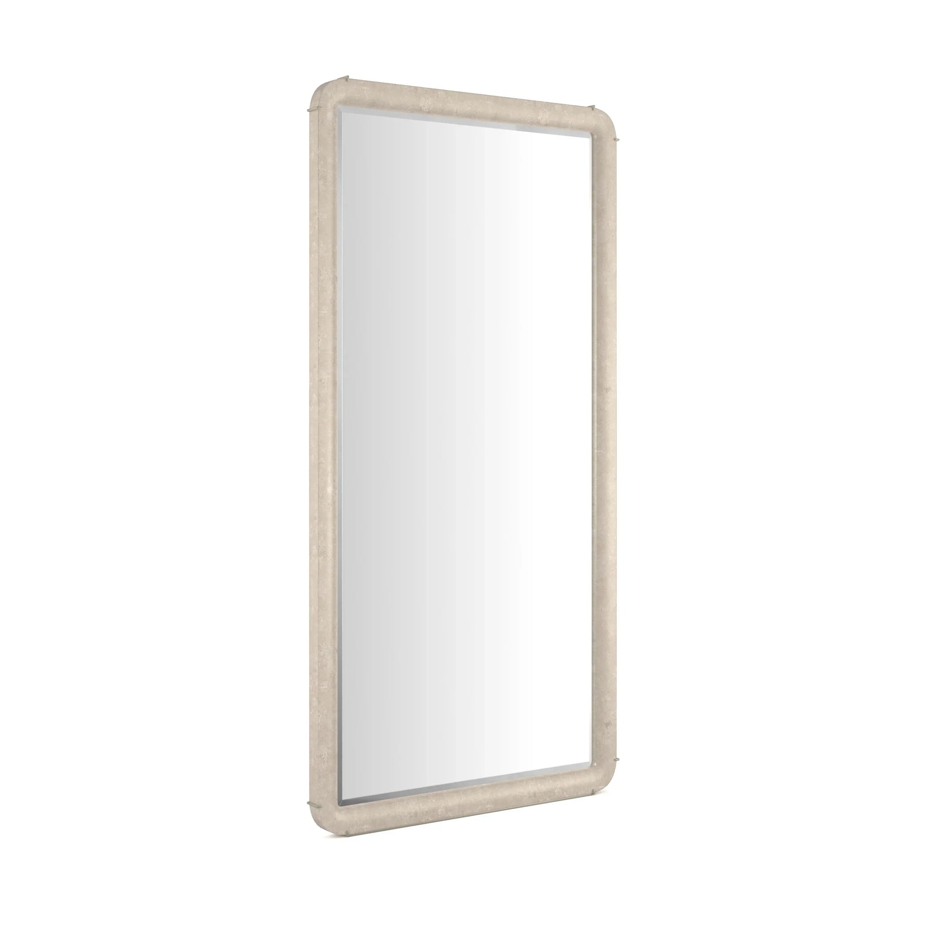 Inspired by the classic, silver serving tray with the same name, this beveled floor mirror is designed to stand or hang vertically. The subtly curved, poplar wood frame is finished in a glinting Oracle Silver Leaf with metal corner details in Polished Silver paint. Consult professional installer for wall mounting.