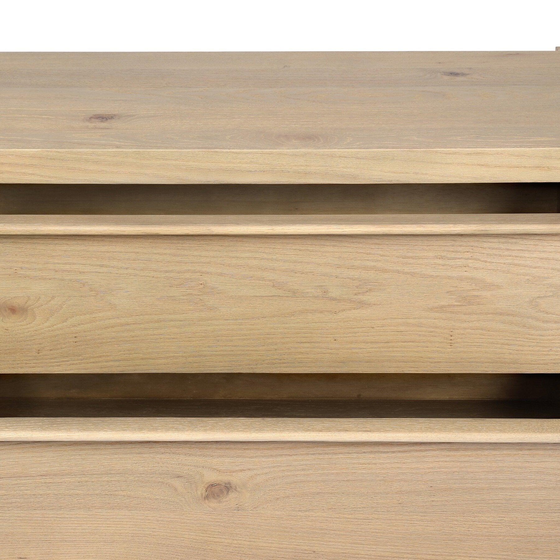 A Scandinavian-inspired nightstand features a pull-through stretcher at the base and understated wooden drawer pulls. Made from oak and finished in a light dry sand with natural knots and graining.