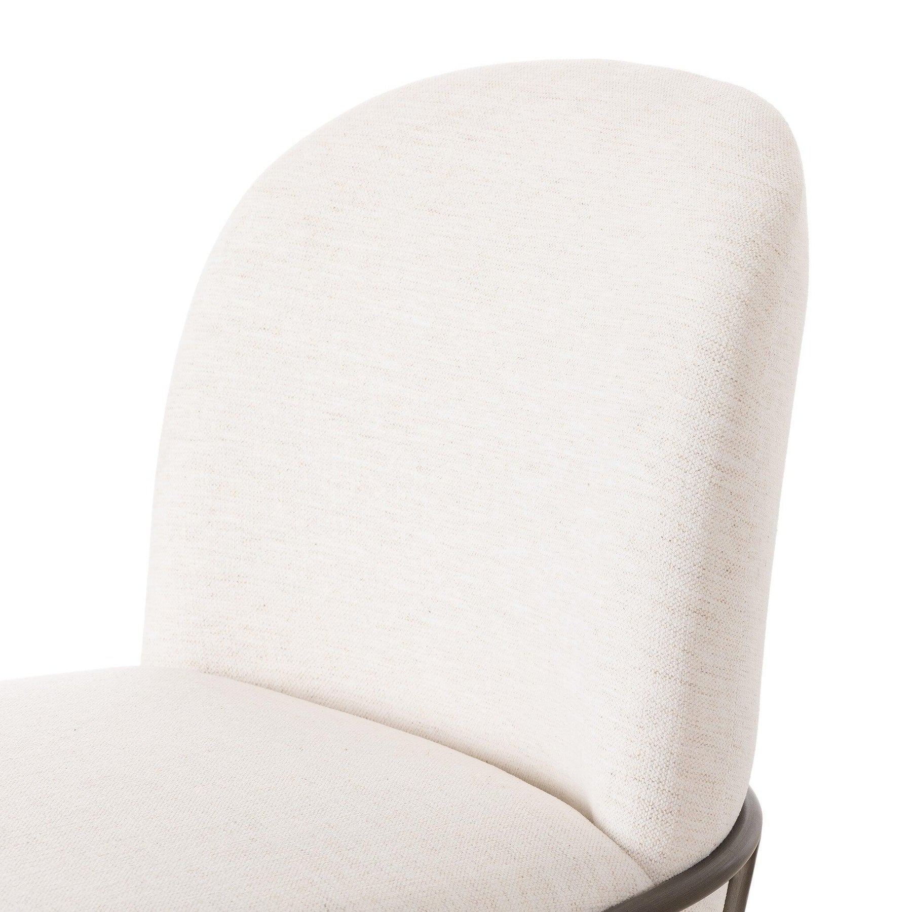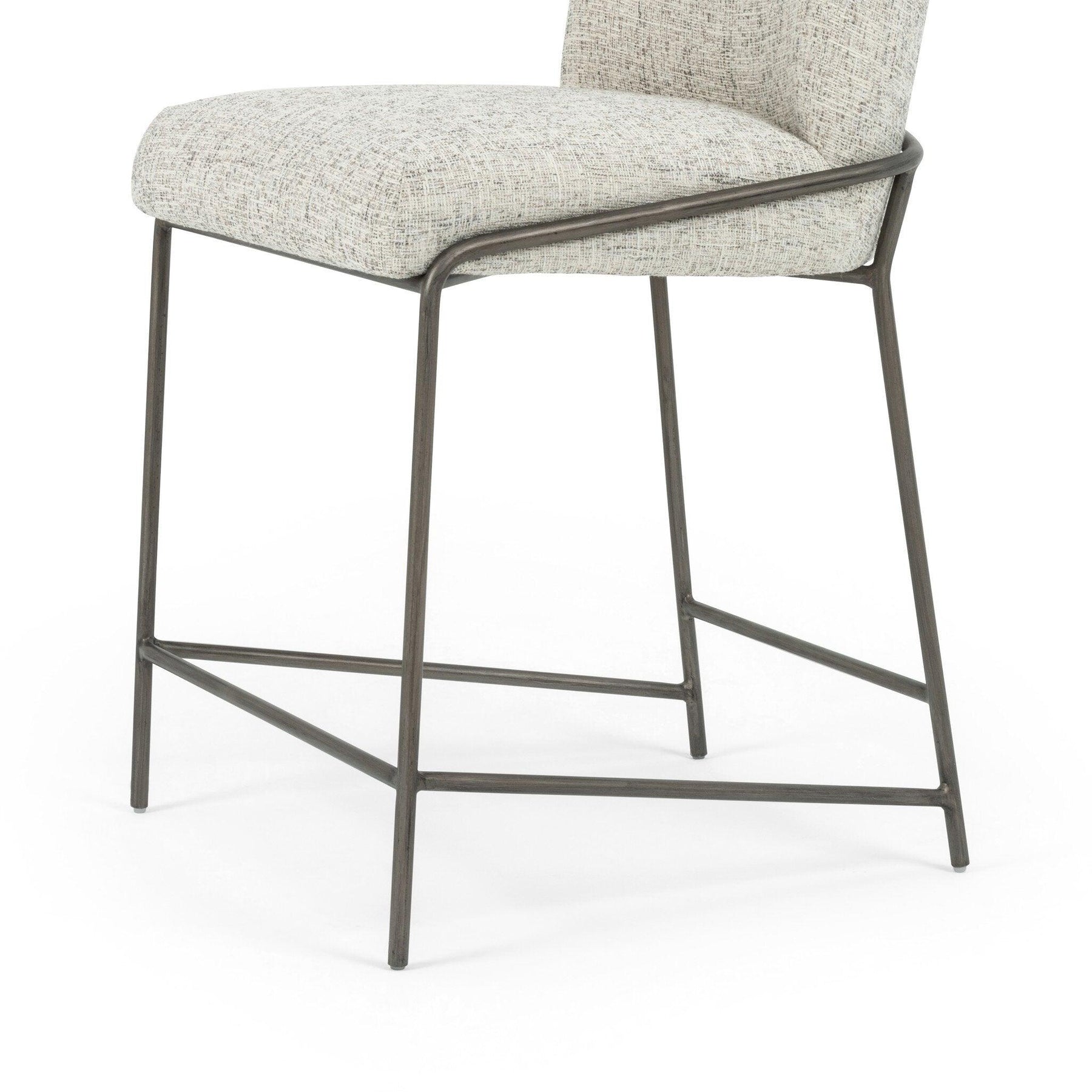An Art Deco dream. A sculpted scalloped-back counter stool upholstered in soft durable stain-resistant Crypton fabric. Paired with slim iron tube framing finished in a brushed slate for a smooth fashion-forward feel.