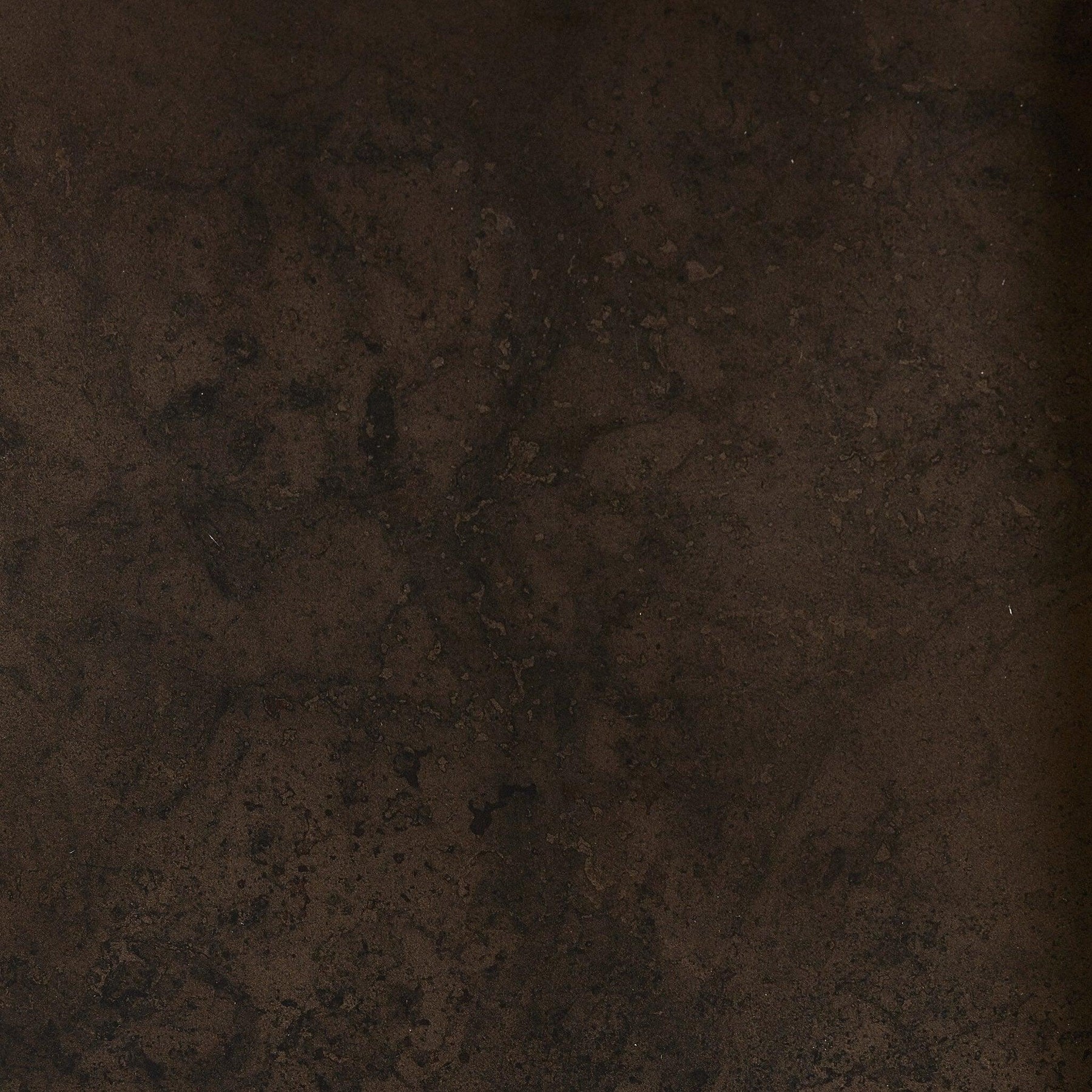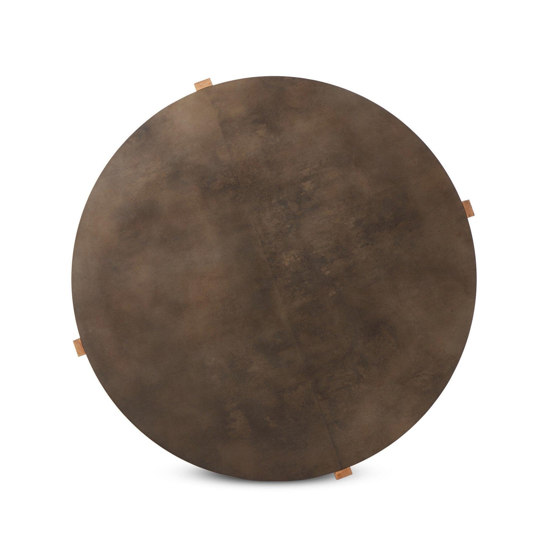 An organic-spirited statement piece. A drum-style coffee table of distressed iron rests within a sculptural cradle base of rustic oak with beautiful highs and lows.