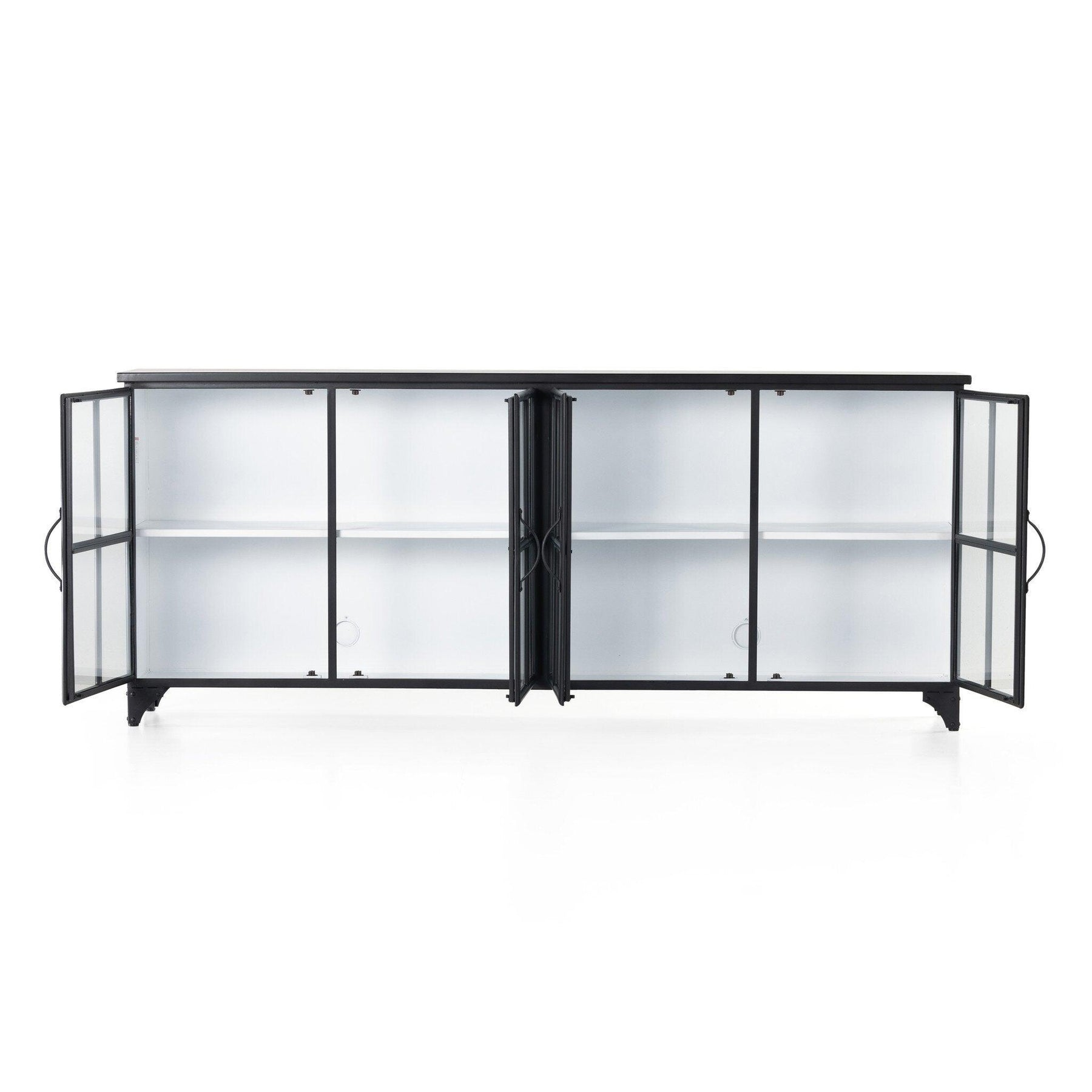 A distressed black iron frame contrasts a clean white interior for an updated take on the traditional media console. Windowpane doors and ample interior shelving maximize storage and display options. Variation from piece to piece is to be expected and speaks to the natural allure of industrial iron.