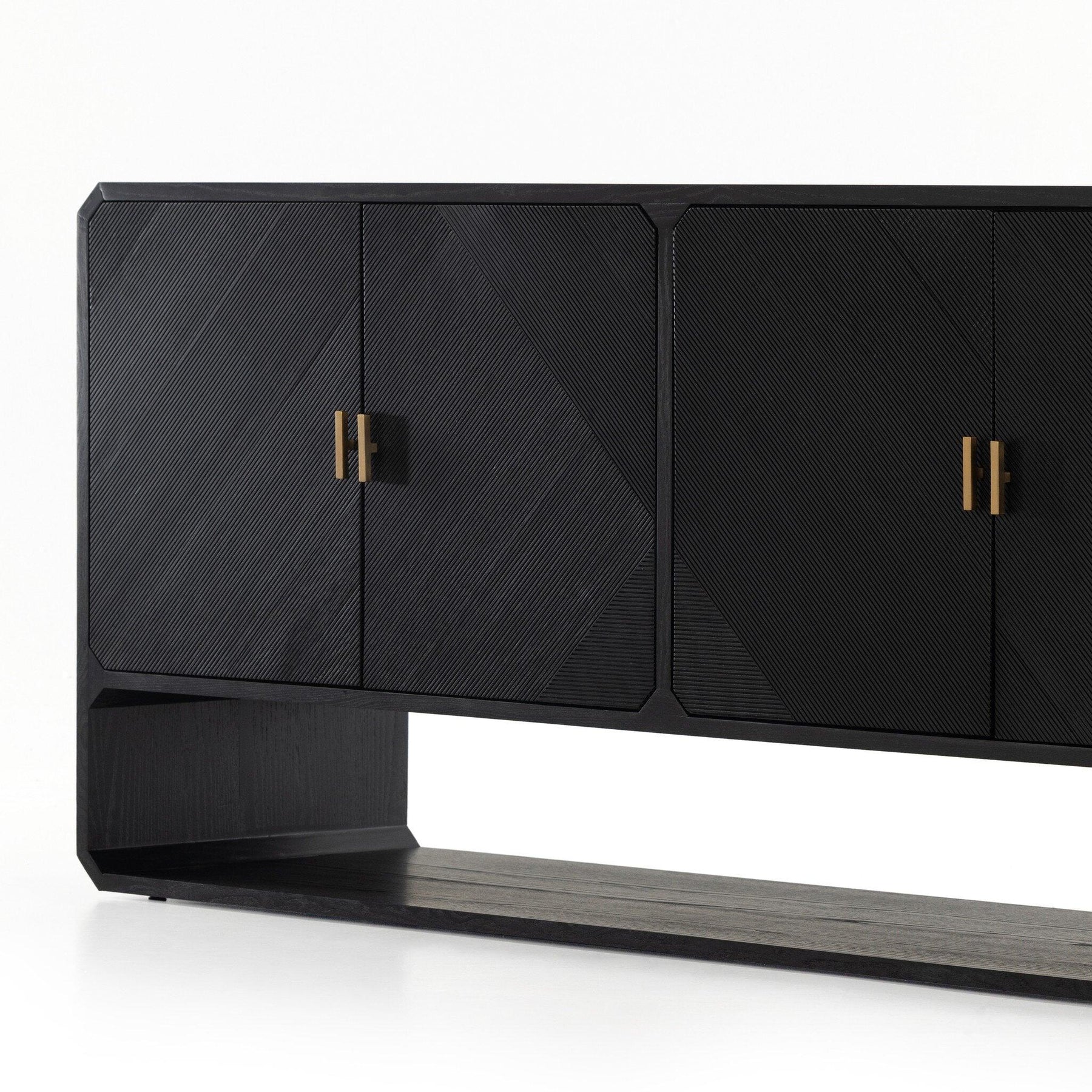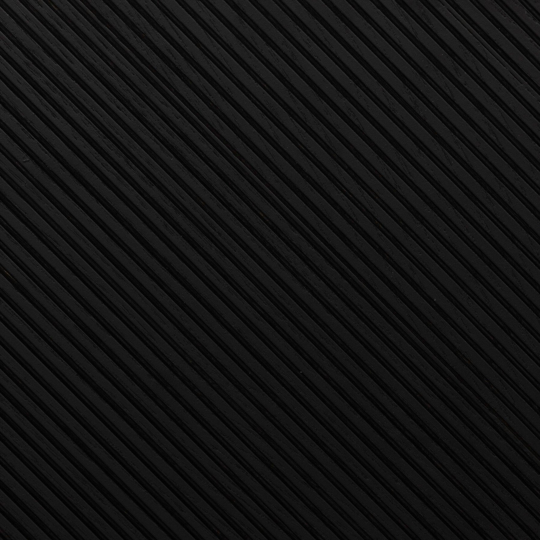 Channeling inspiration from the Seventies a sideboard of black ash adopts petite reeding for linear pattern with chamfered edging and an extended base for an open look with bonus storage.