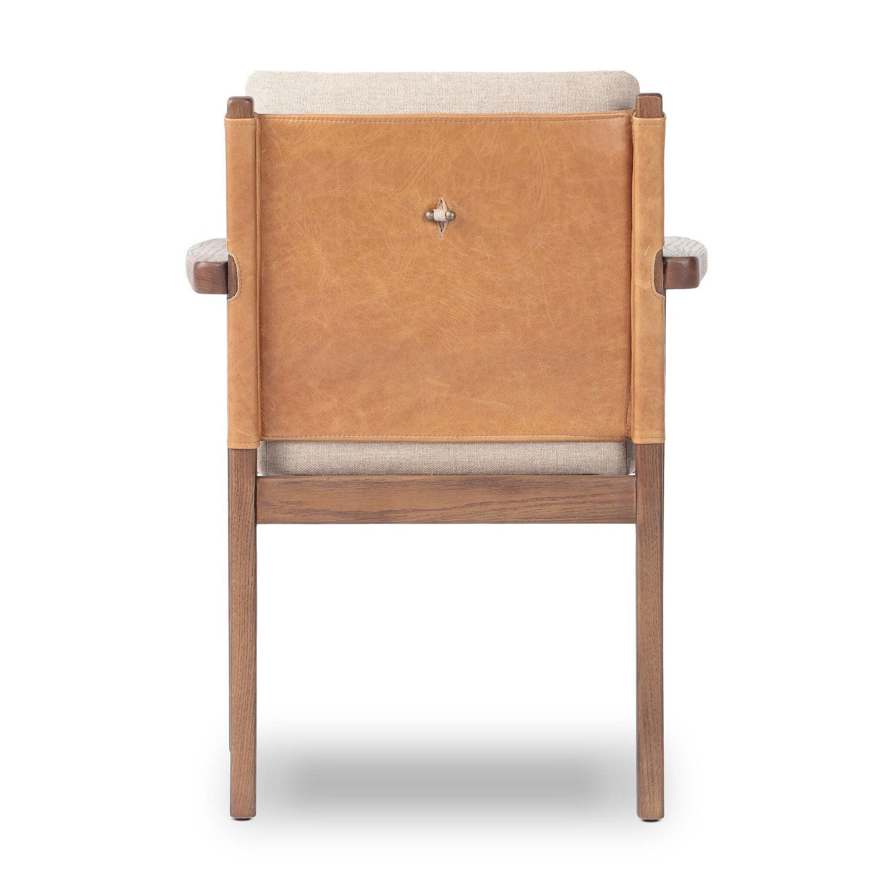 Elevate your dining space with a mixed-material armchair of solid oak top-grain leather and high-performance fabric. On the back small iron hardware adds an intriguing finishing touch.