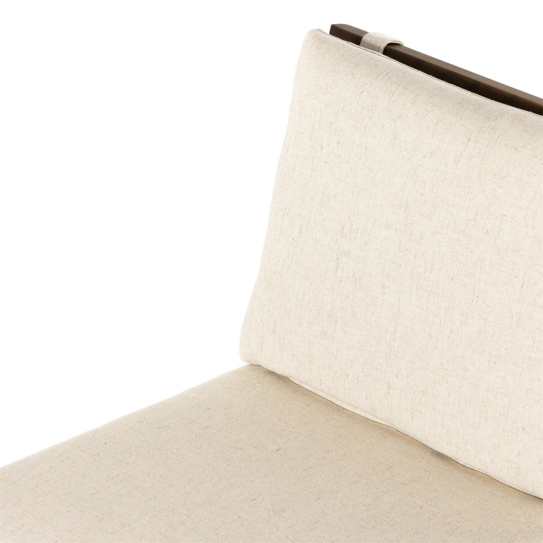 Crisp and clean with natural panache. Slim black-finished iron frames a floating ladderback of amber-finished oak with linen-blend high-performance seating in an inviting cream. Rear handle detail adds a fashionable finishing touch.