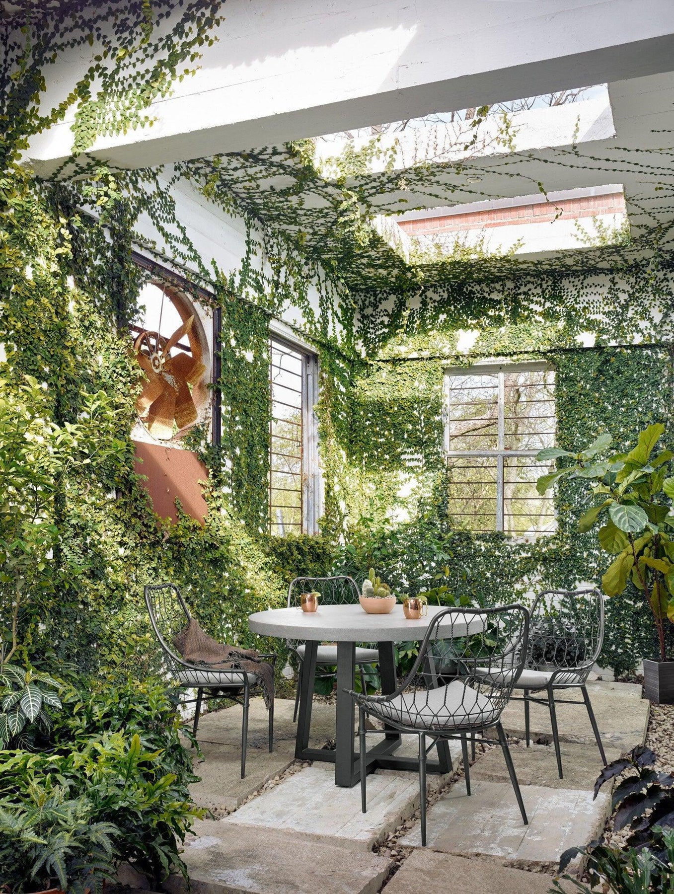A strikingly simple poly-resin top derived from river sand is polished to a smooth sheen. An angled matte black iron base adds architectural appeal to this large-scale dining table. Slight color variance is to be expected and speaks to lava stone's organic nature. Cover or store indoors during inclement weather and when not in use.
