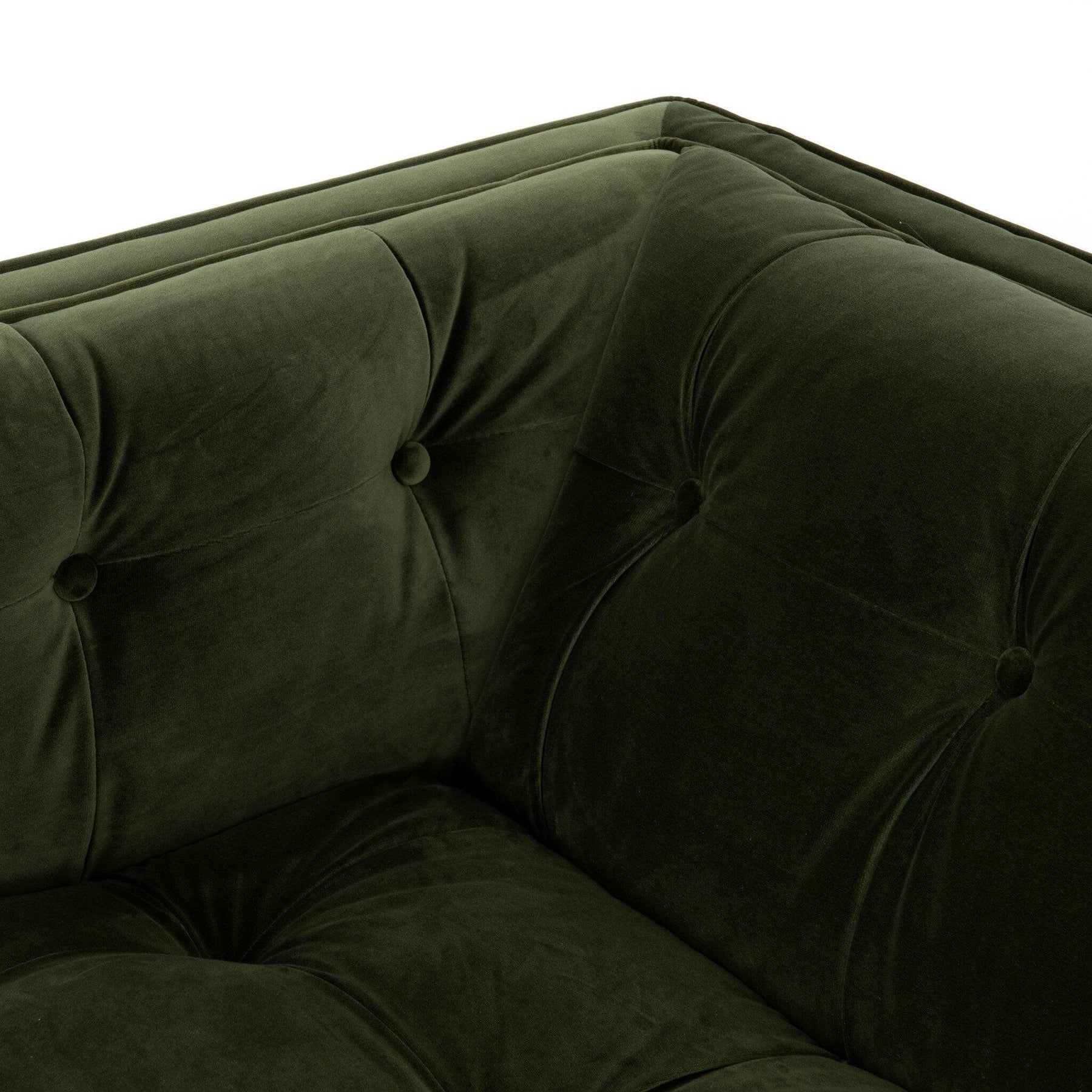 A low spacious mid-century chaise silhouette is covered in velvety upholstery in an intriguing sapphire olive with blind tufting.