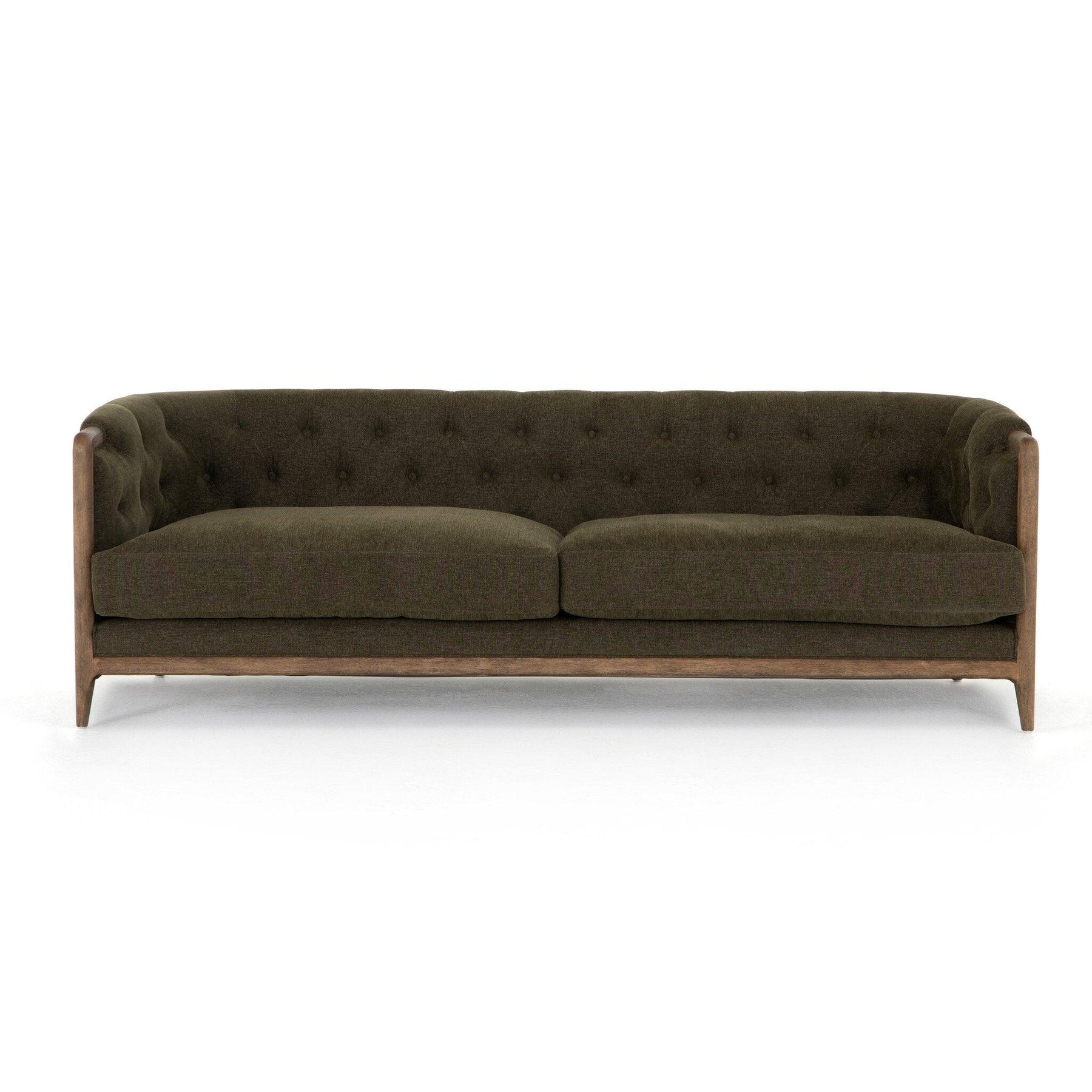 Dress the room with Parisian vibes. With traditional button tufting and classic rolled arms feather-blend seating is upholstered in a deep earthy olive performance fabric for a warm regal look with exposed parawood framing for a natural touch.