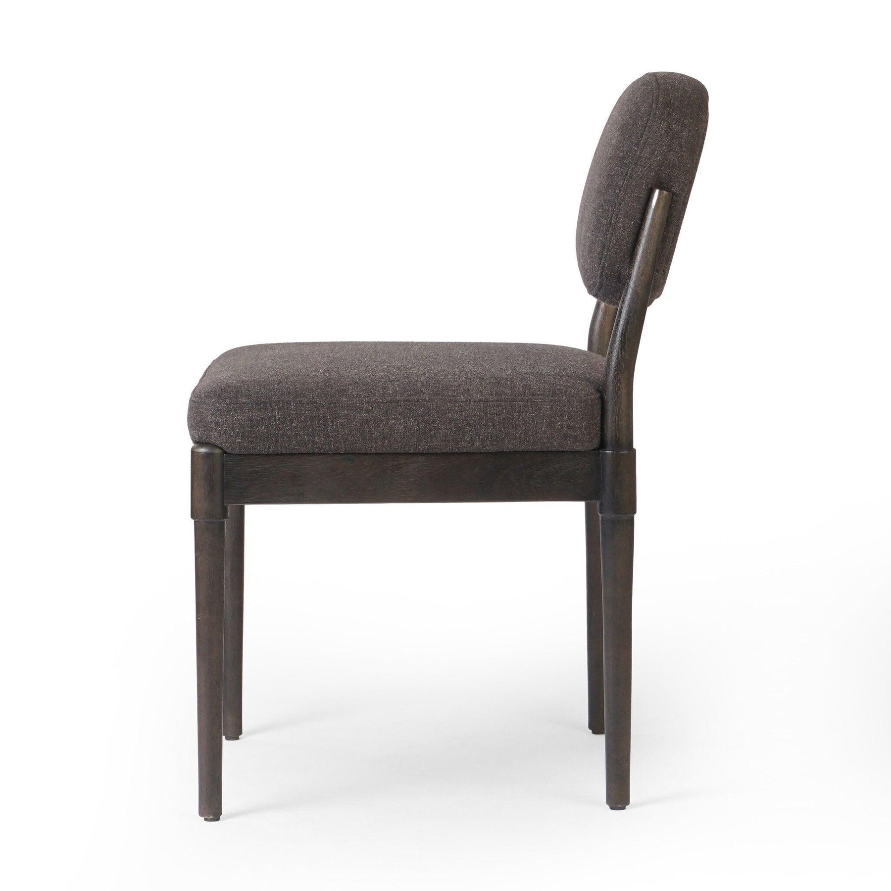 Modern materials place an updated twist on the traditional armless dining chair. Linen/cotton blend cushioning upholstered in high-performance fabric perfect for everyday dining. Simply framed by burnt oak. Performance fabrics are specially created to withstand spills stains high traffic and wear ensuring long-term comfort and unmatched durability.