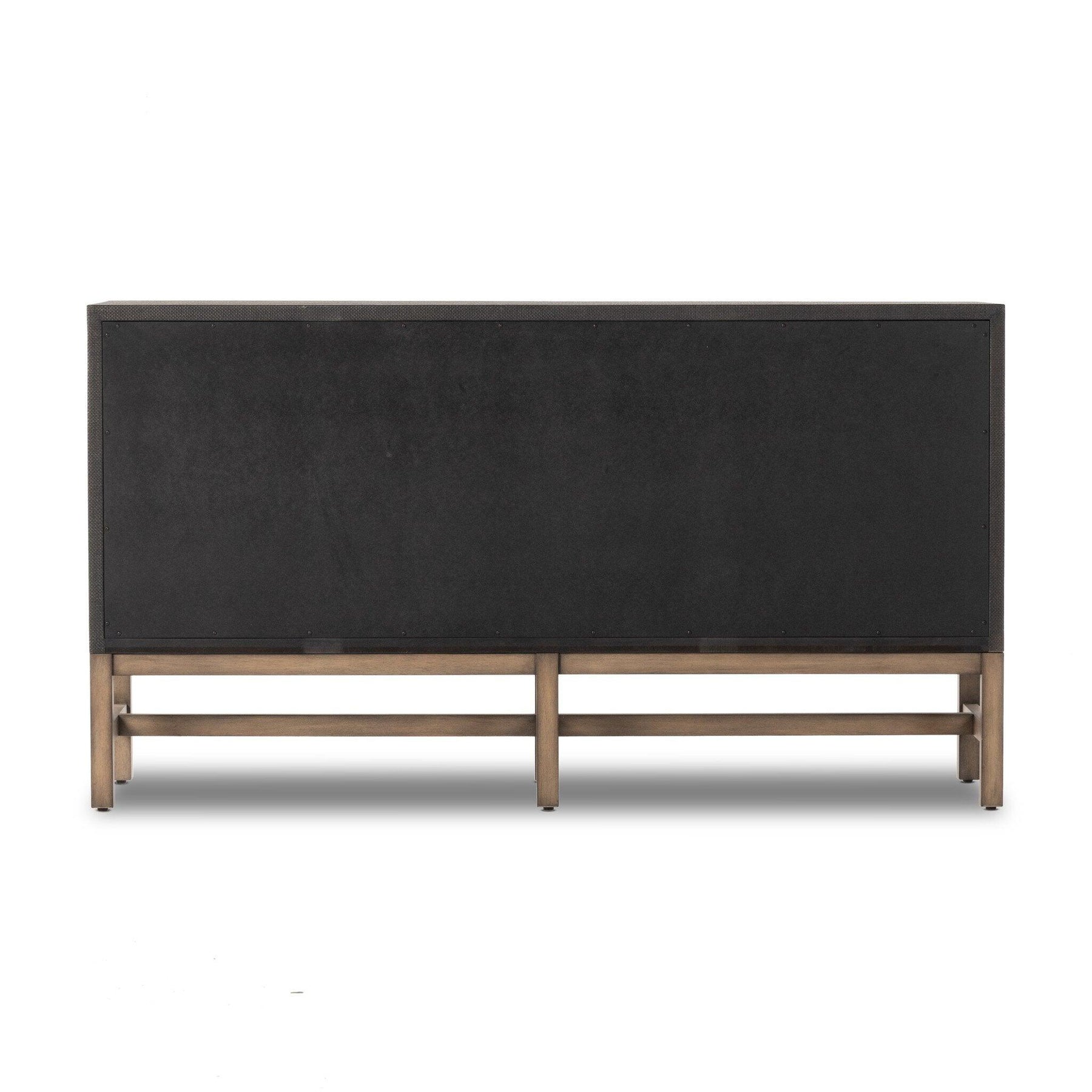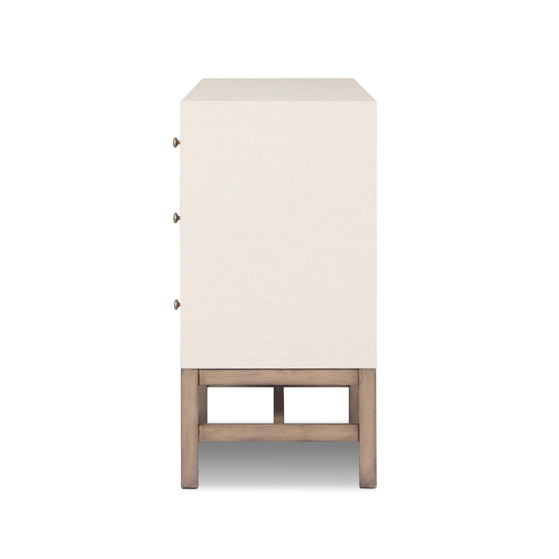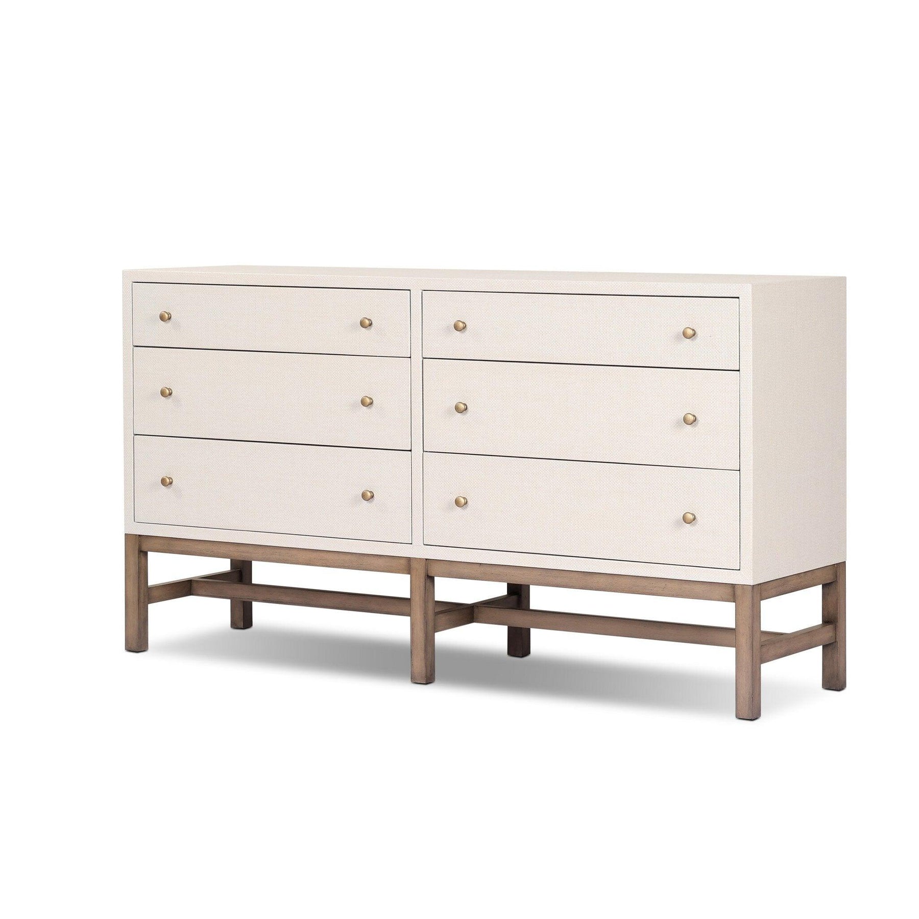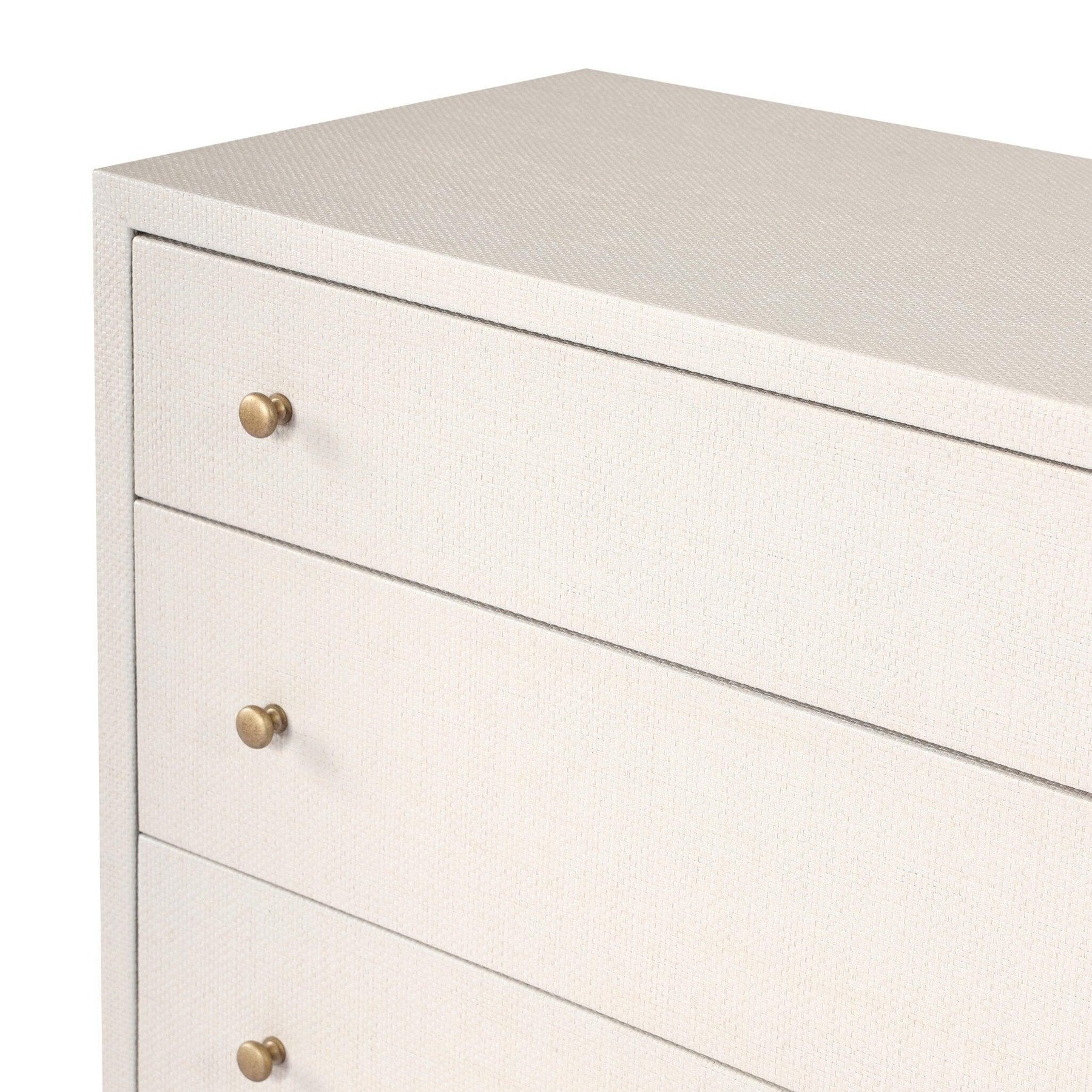 Woven black raffia offers a texture-driven take on bedroom storage. Antique brass-finished iron hardware adorns six spacious drawers all supported by a solid mahogany base. This item has been modified to comply with the STURDY Act. See a full list of modified products and data changes in the “STURDY Act” file in the Downloads section below.