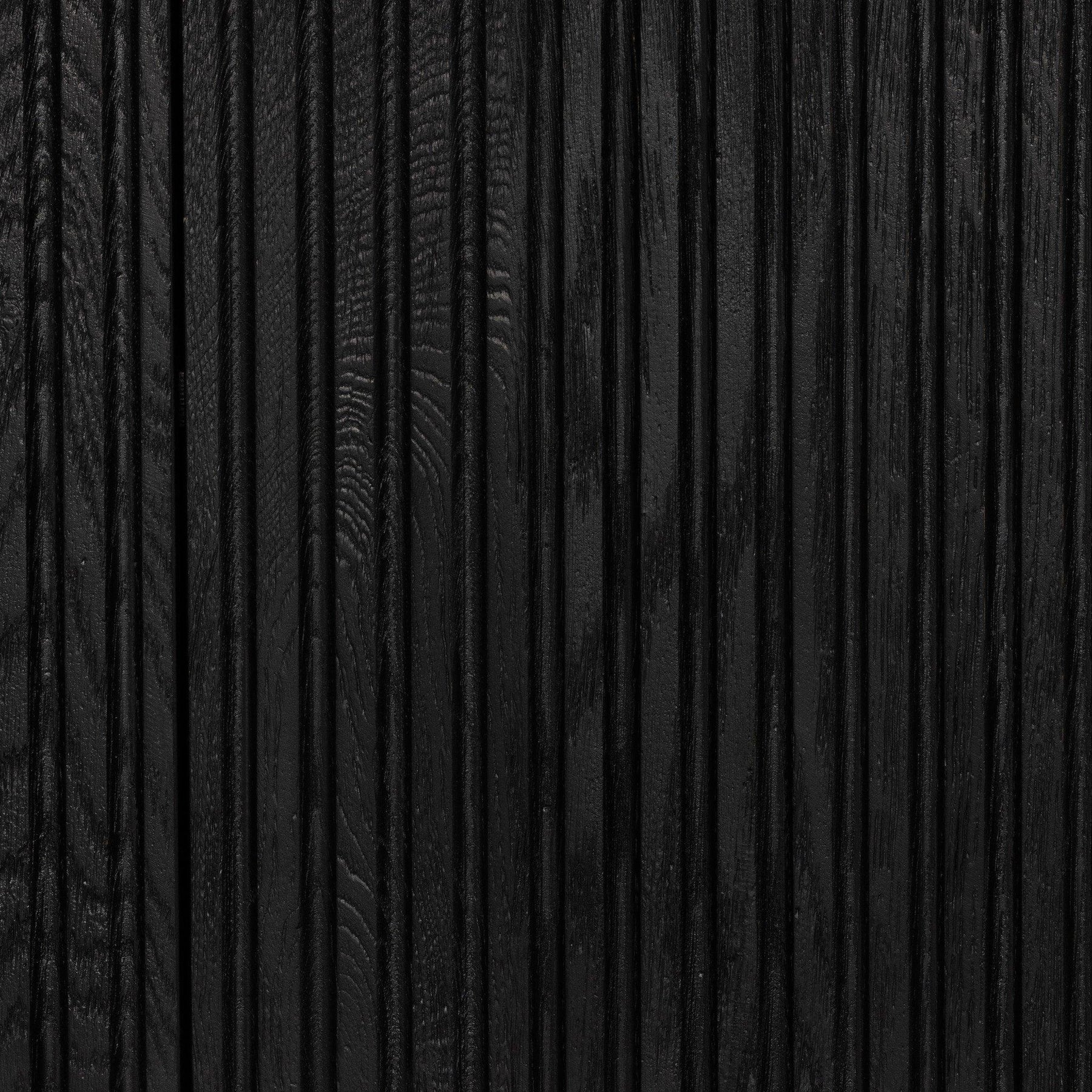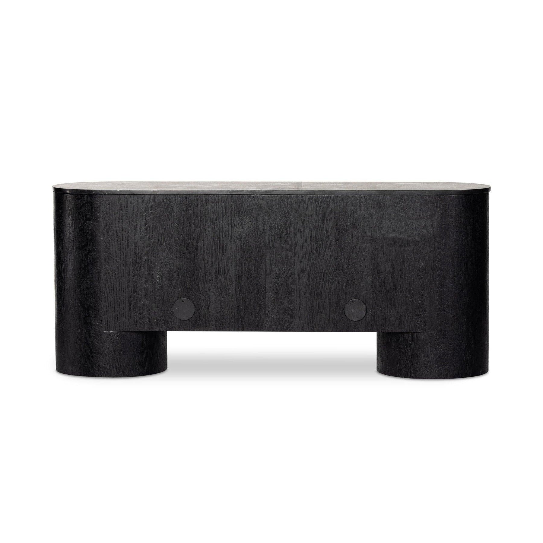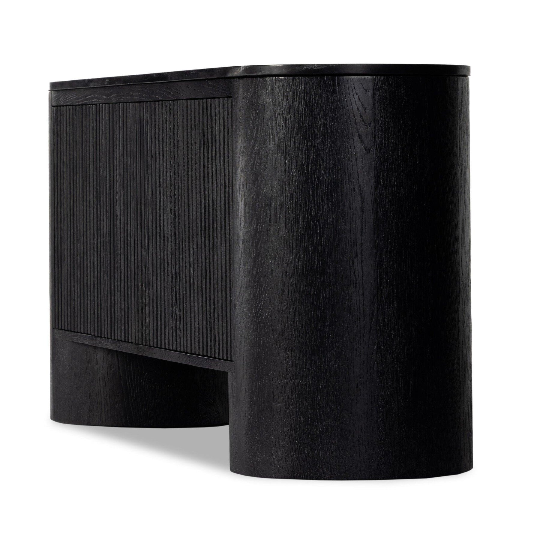 Classic materials modern styling. A rounded overscale base supports oak veneer casing finished in a classic black with fluted ribbing for texture on doors. A black marble top features white veining bringing a hint of movement to this unique piece.