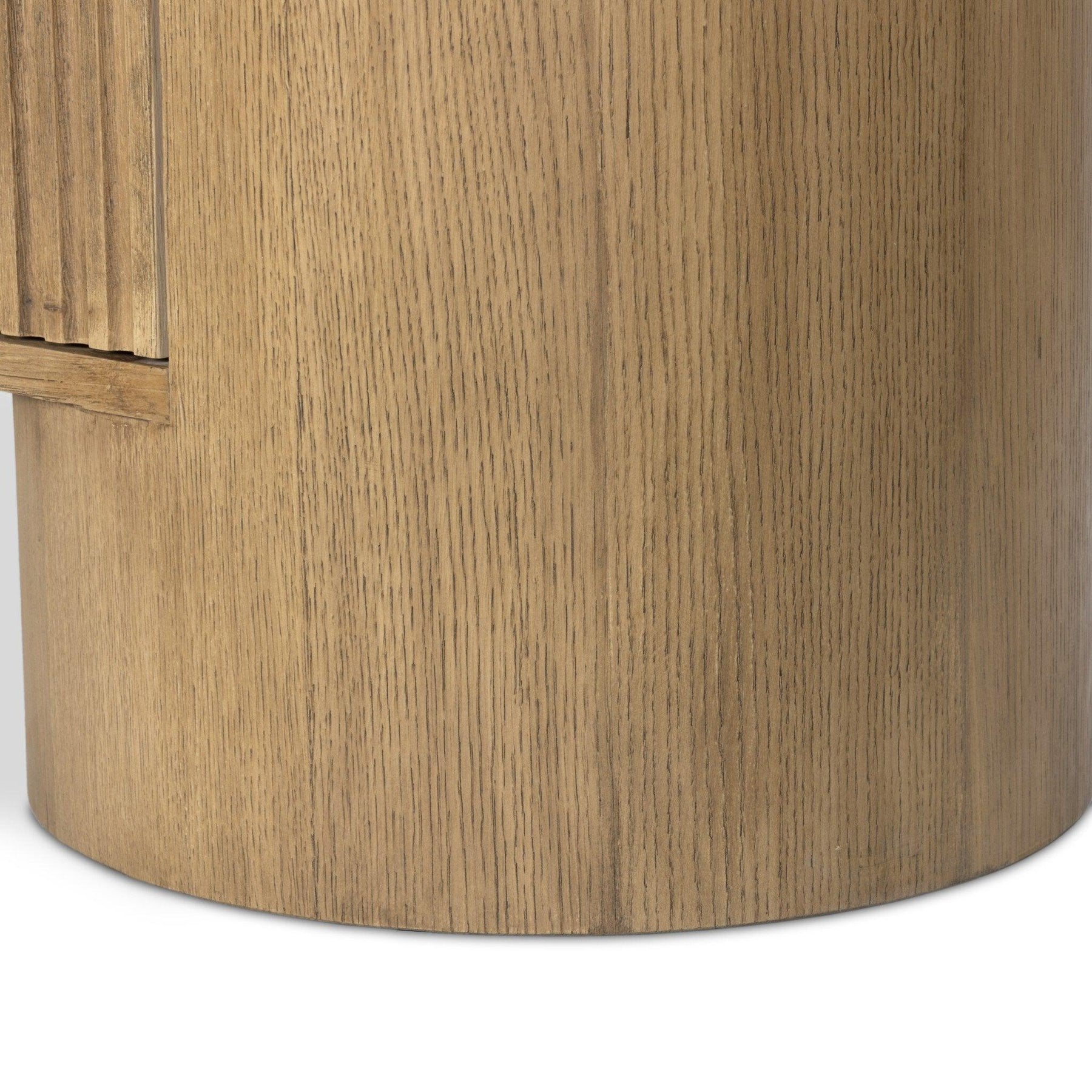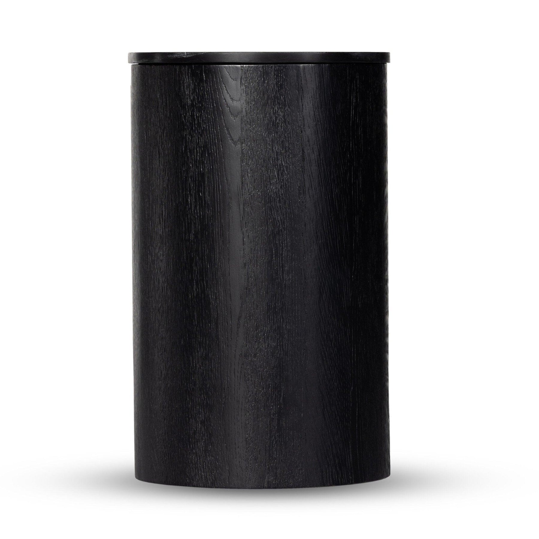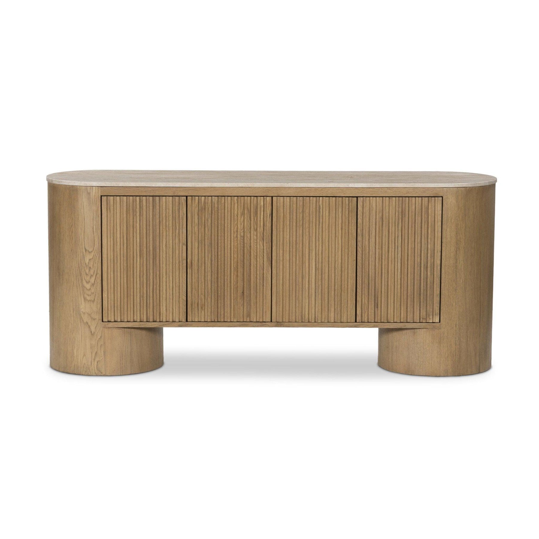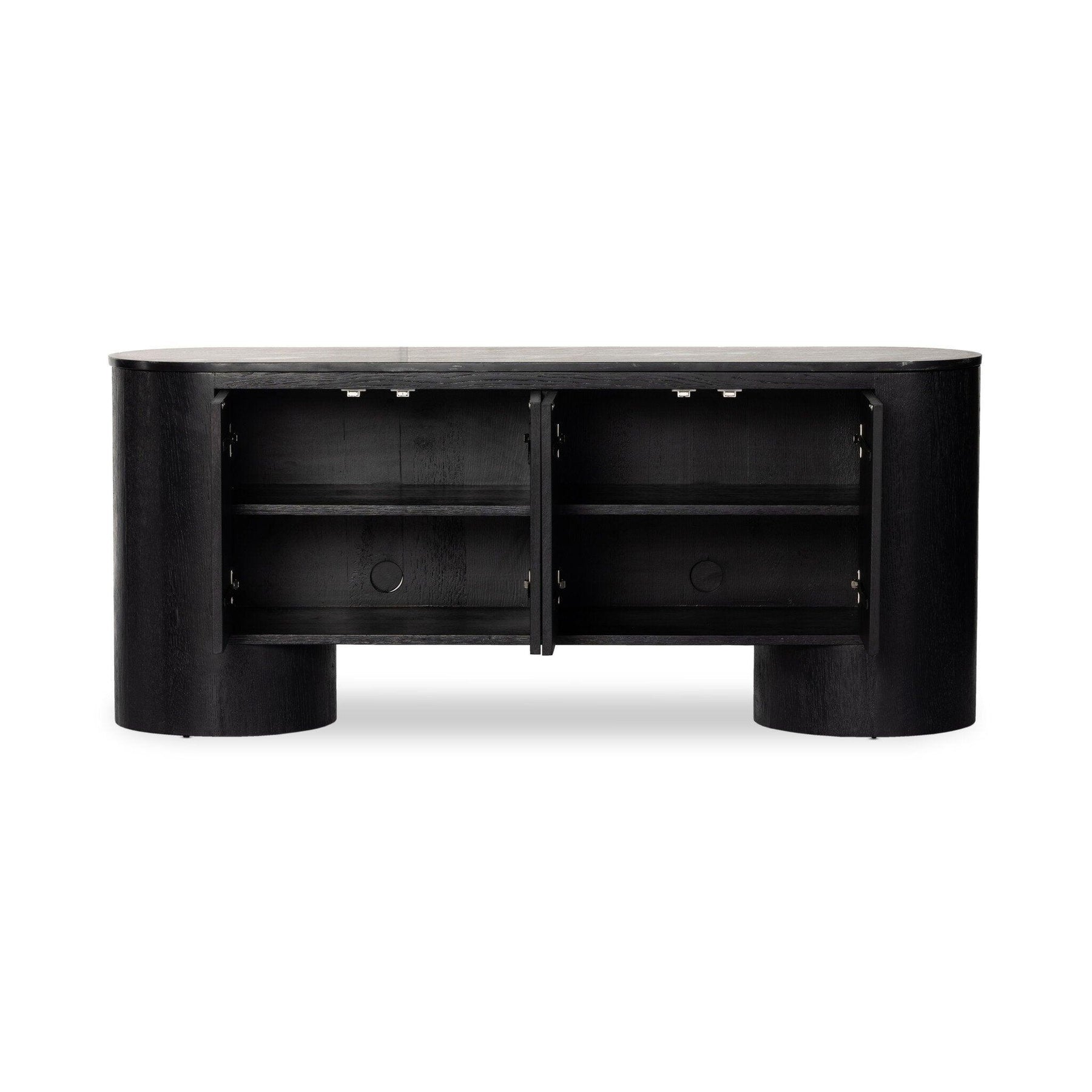 Classic materials modern styling. A rounded overscale base supports oak veneer casing finished in a classic black with fluted ribbing for texture on doors. A black marble top features white veining bringing a hint of movement to this unique piece.