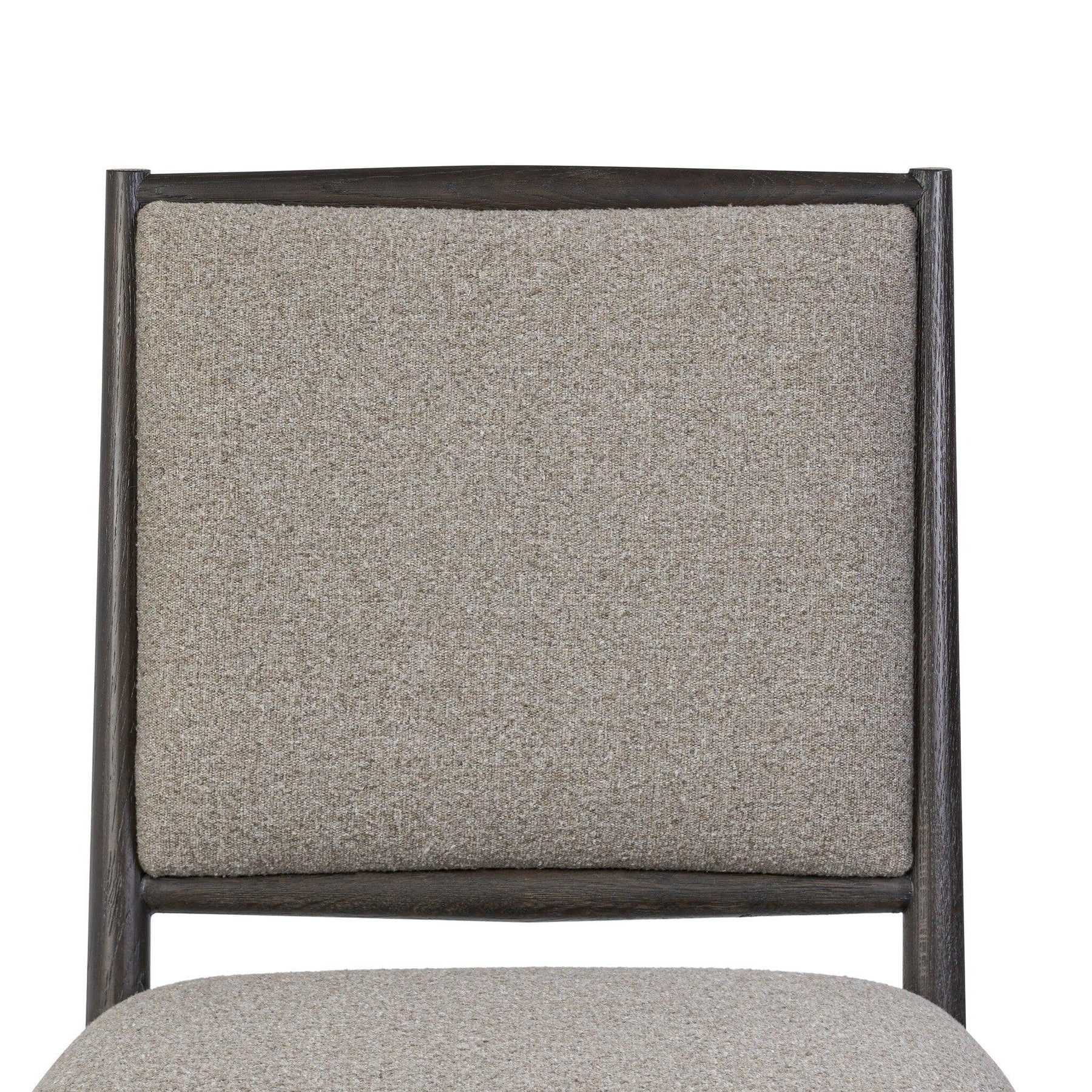 Weathered oak and light linen-like upholstery fuse for a new take on traditional. Tapered spindle framework complements the clean lines of this dining chair.