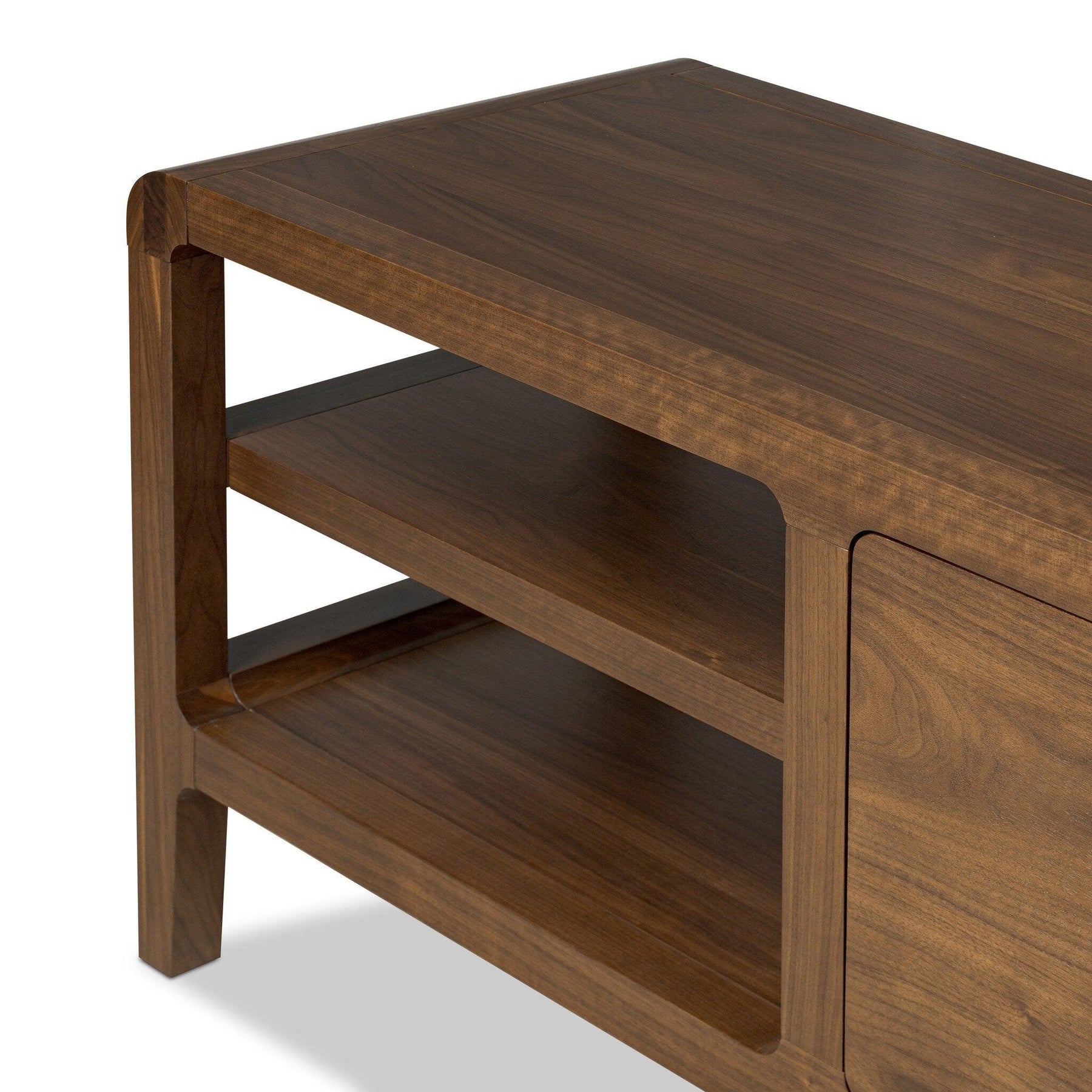 Soft curves flow through the legs shelves and corners of this rich media console of dark walnut. A mix of open shelving and closed cabinetry creates endless possibilities for your media storage and display. A rich walnut finish works into any space while crafting a sense of warmth.