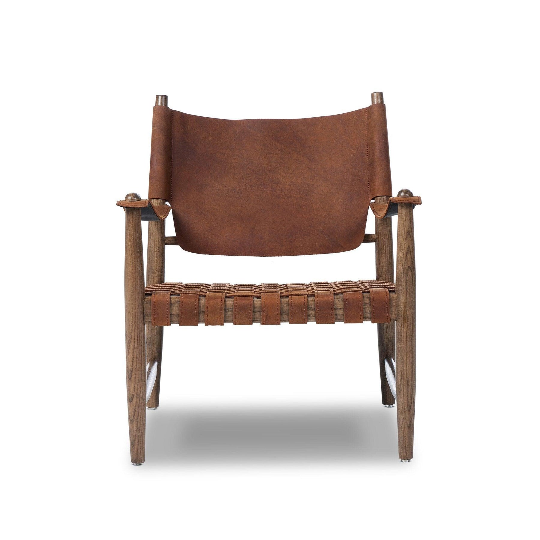 Reviving a vintage-inspired frame this leather sling chair meets retro character with laid-back comfort. The tan leather sling back shaped like a shield adds bold style while the woven seat provides a supportive unique seating experience. Crafted from an ash wood frame with dowel construction the chair?s arms create a subtle peekaboo effect with the leather. The thick saddle leather expertly tanned brings warmth and a found aged look.