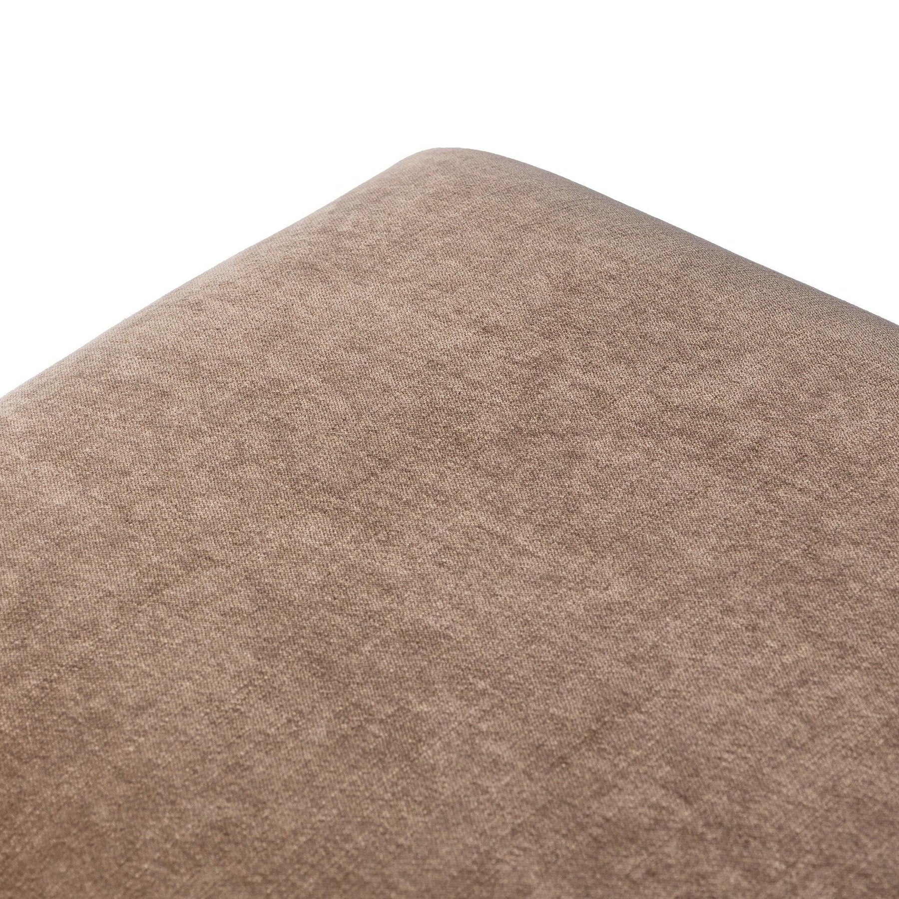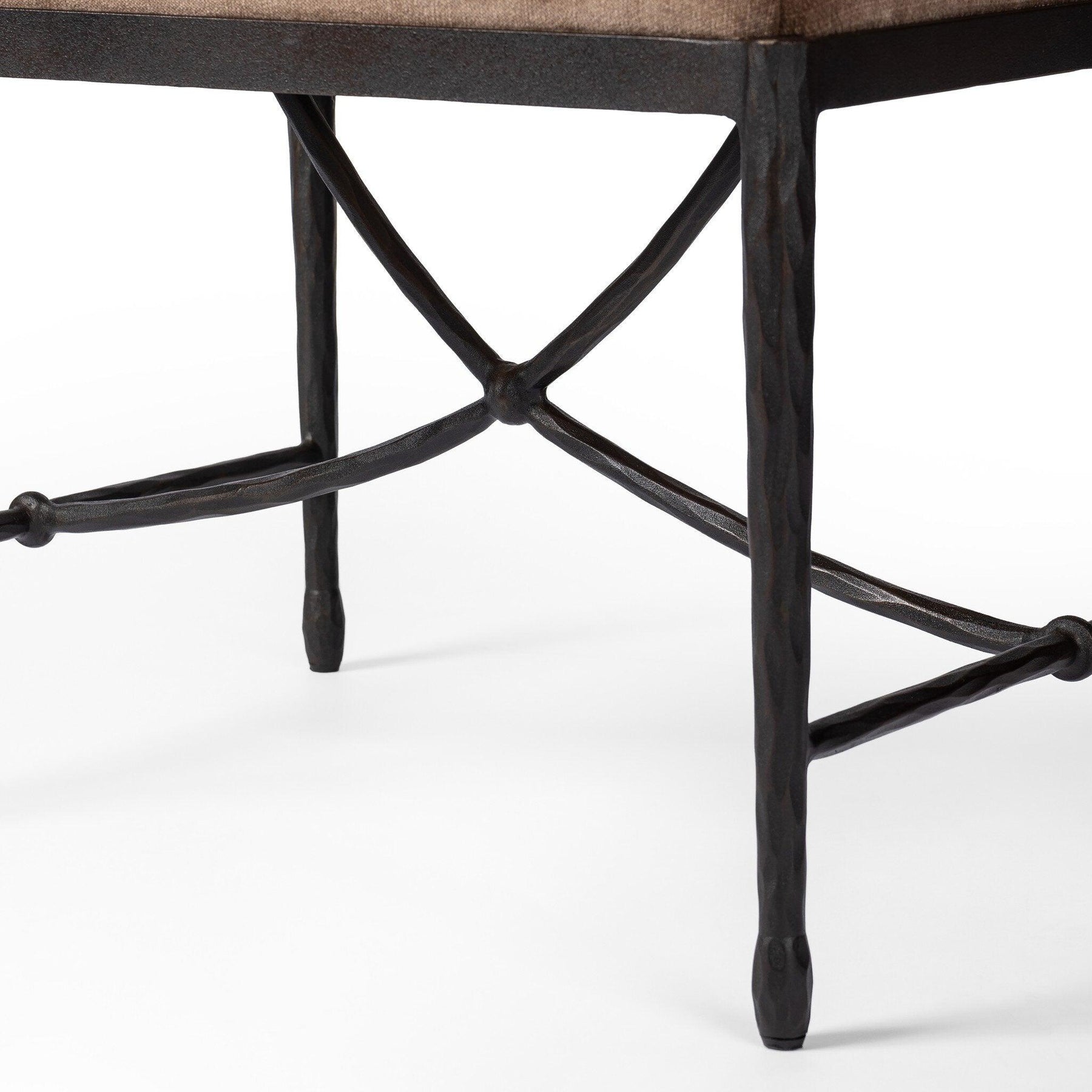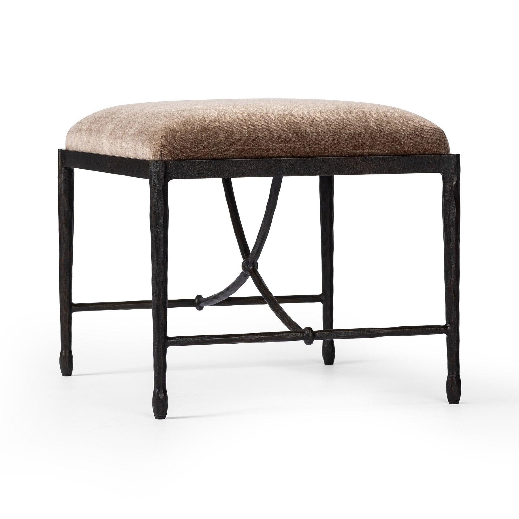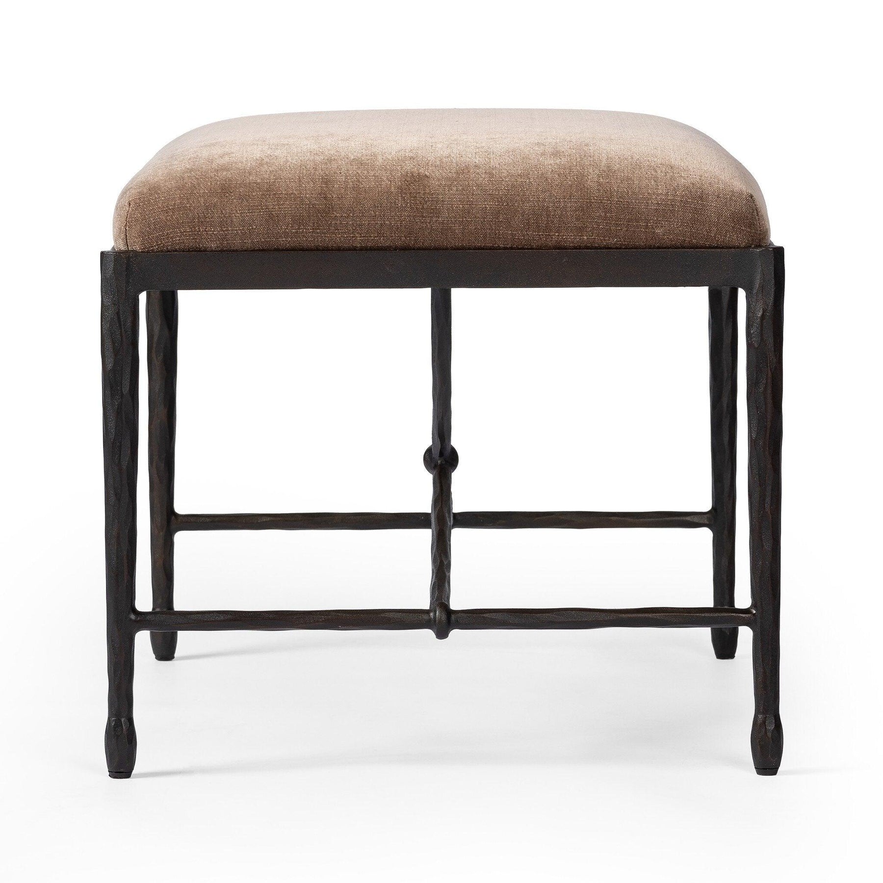 Channel Art Deco with a curved stretcher base of bronzed hammered iron and a velvety seat in a versatile earth tone. Style just about anywhere to create an extra surface or seat.