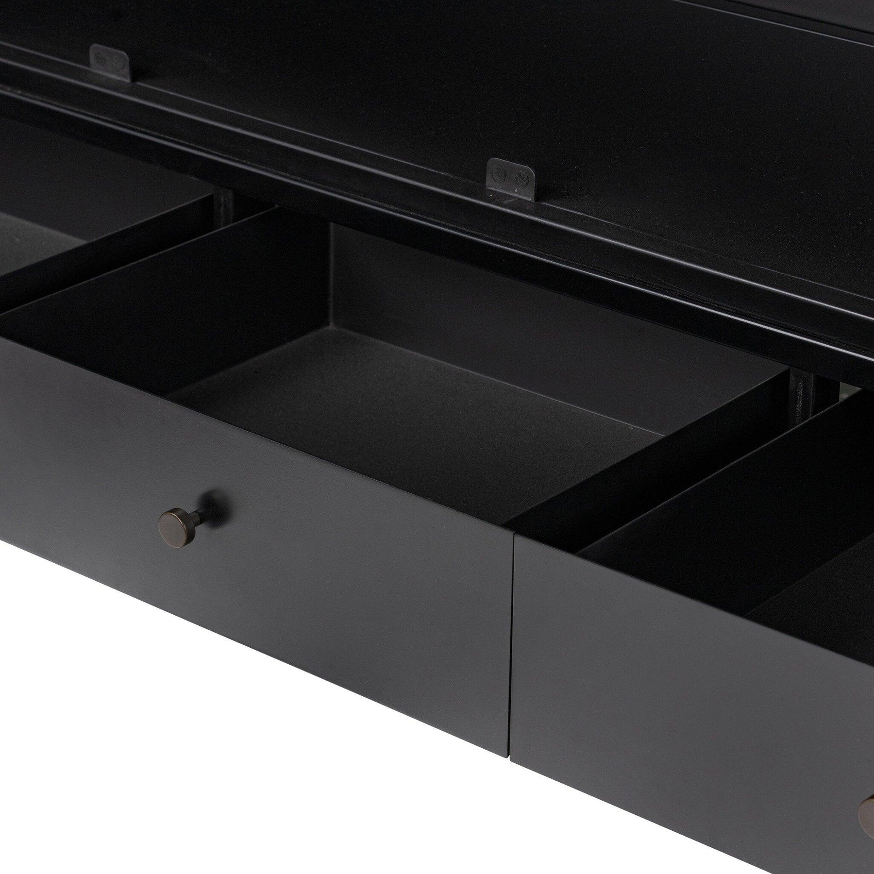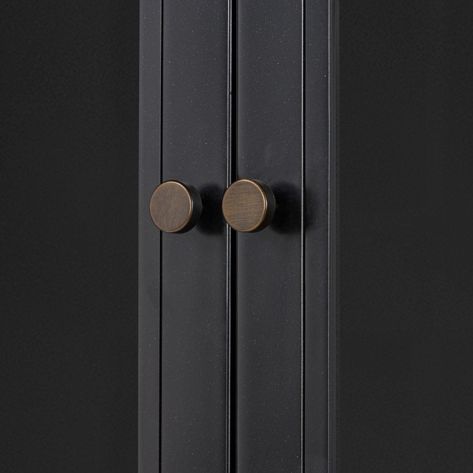 Storage-driven cabinetry inspired by angular geometry. Rich with monochromatic presence a black-finished metal cabinet pairs with an airy iron base for a balance in scale. Three drawers bring even more storage with bi-fold glass doors for display options. Minimalist bronzed hardware completes the look.