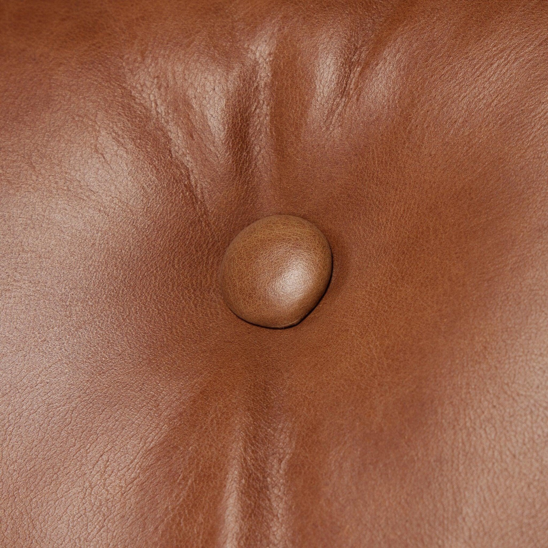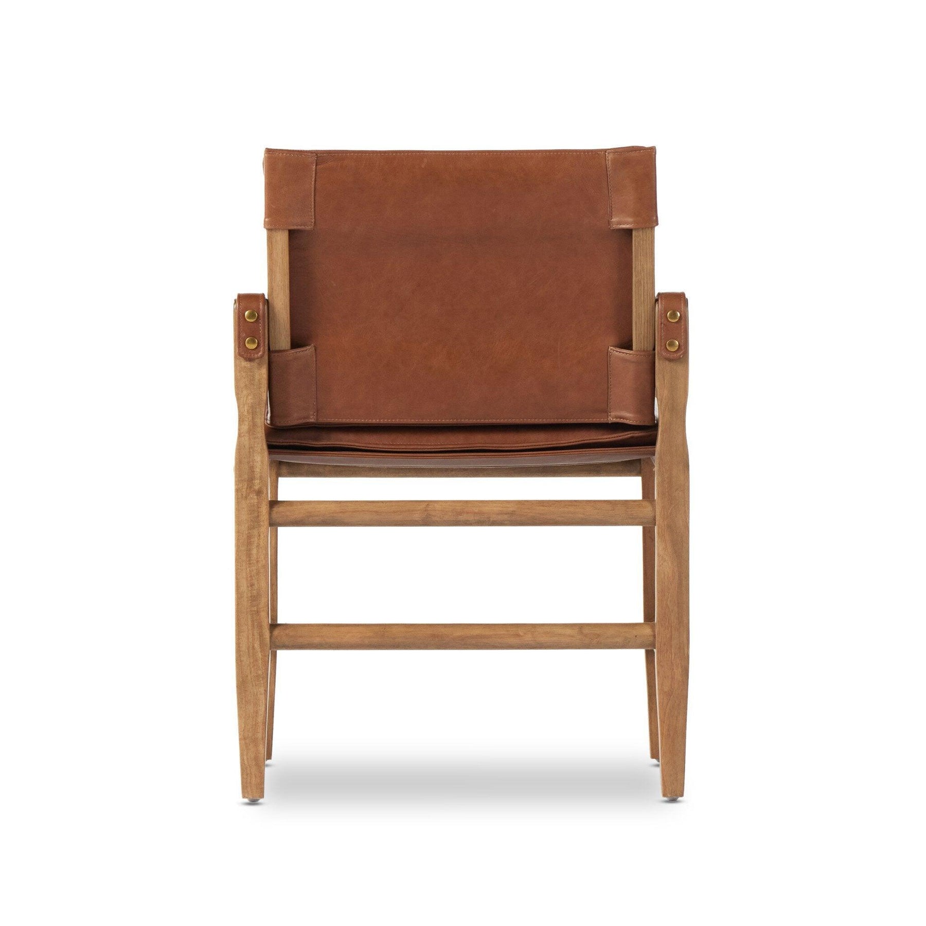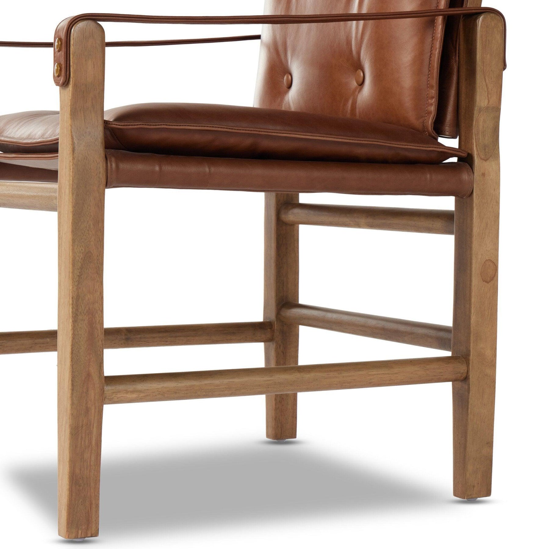 Inspired by a vintage safari-style frame this dining chair is defined by the fluid strap arms. Semi-attached cushions in rich chestnut leather finished with button tufting details. Parawood frame and brass details add warmth and texture.