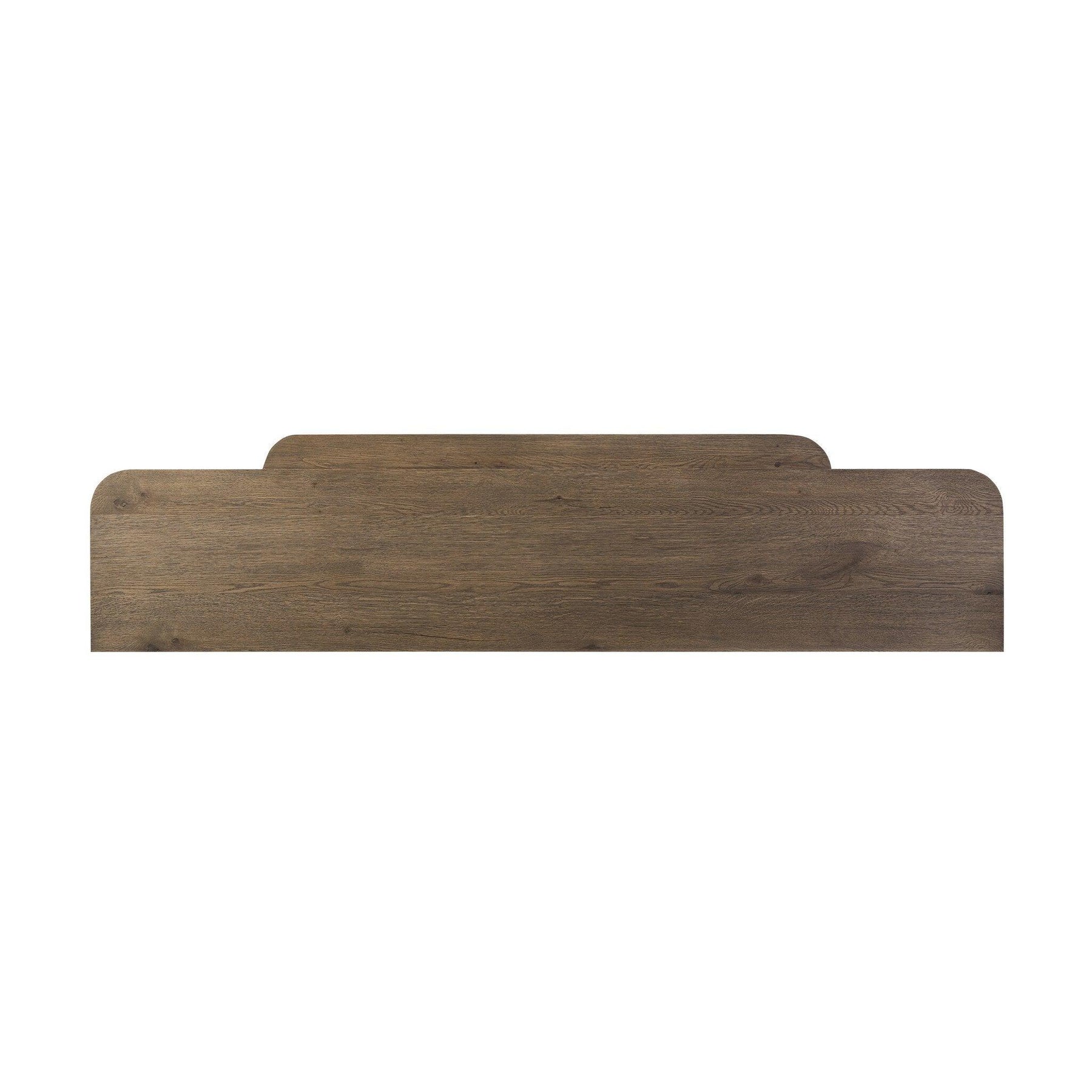 A break-front sideboard of weathered oak shapes a rounded profile for a natural and polished look. Simple aged bronzed hardware adds an understated touch to the wide cabinet doors while a simple plinth emphasizes the dramatic scale of the stacked storage space.