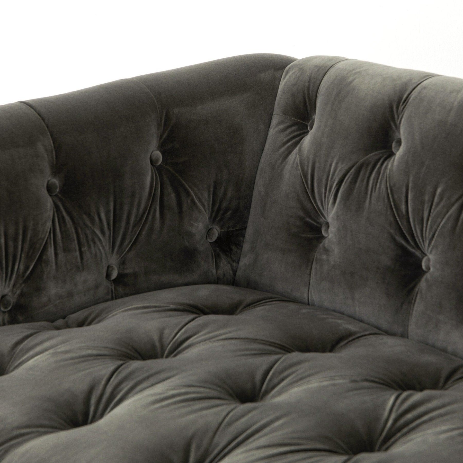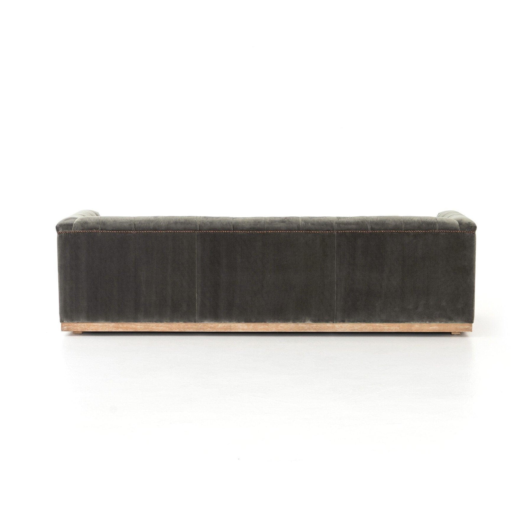 A modern take on the classic library sofa. Covered in black top-grain leather and finished with a specially designed formula that creates intentional cracking and distressing for a naturally aged look. Mounted on a weathered oak base and finished with aged bronze nailheads.
