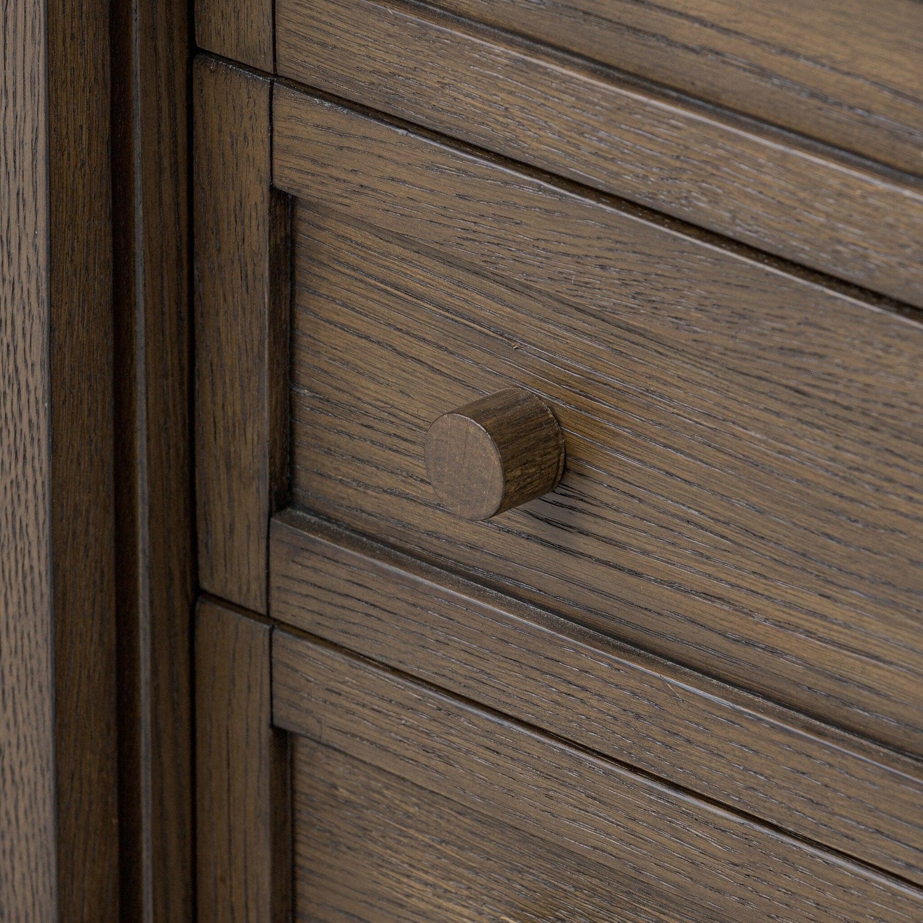 Bring Americana vibes to your space with a large storage-driven bookcase made from warm oak and oak veneer. Plenty of interior space for media storage with a slide door-front center compartment. Rear cutouts for cord management.