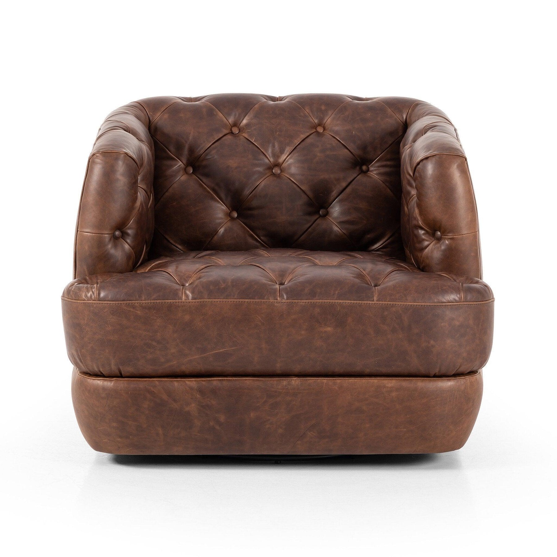 Old English-inspired top-grain leather is finished with a soft hand for a vintage lived-in look on this traditionally inspired chair. Handcrafted in Italy the richness of this distinctive full-bodied leather develops an even-richer patina over time. Button tufting texturizes a comfortably curved back and sides while a 360-degree swivel modernizes the whole look.