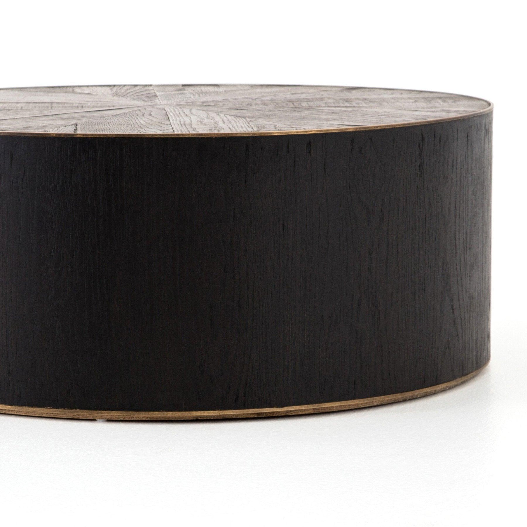 Bring on the drama. A deep brown oak top is cut in a starburst texture framed by deep ebony sides and encircled by bright brass rings.