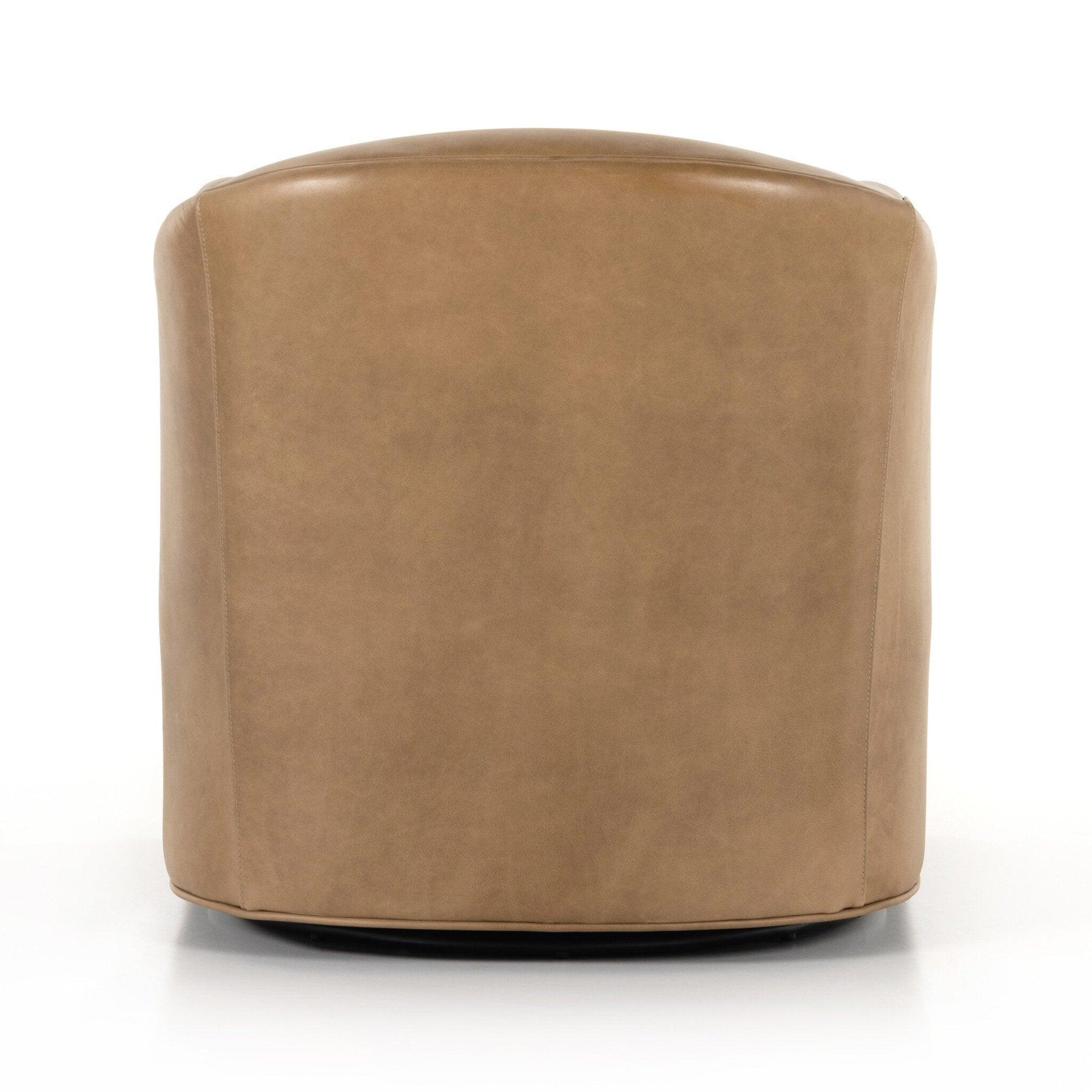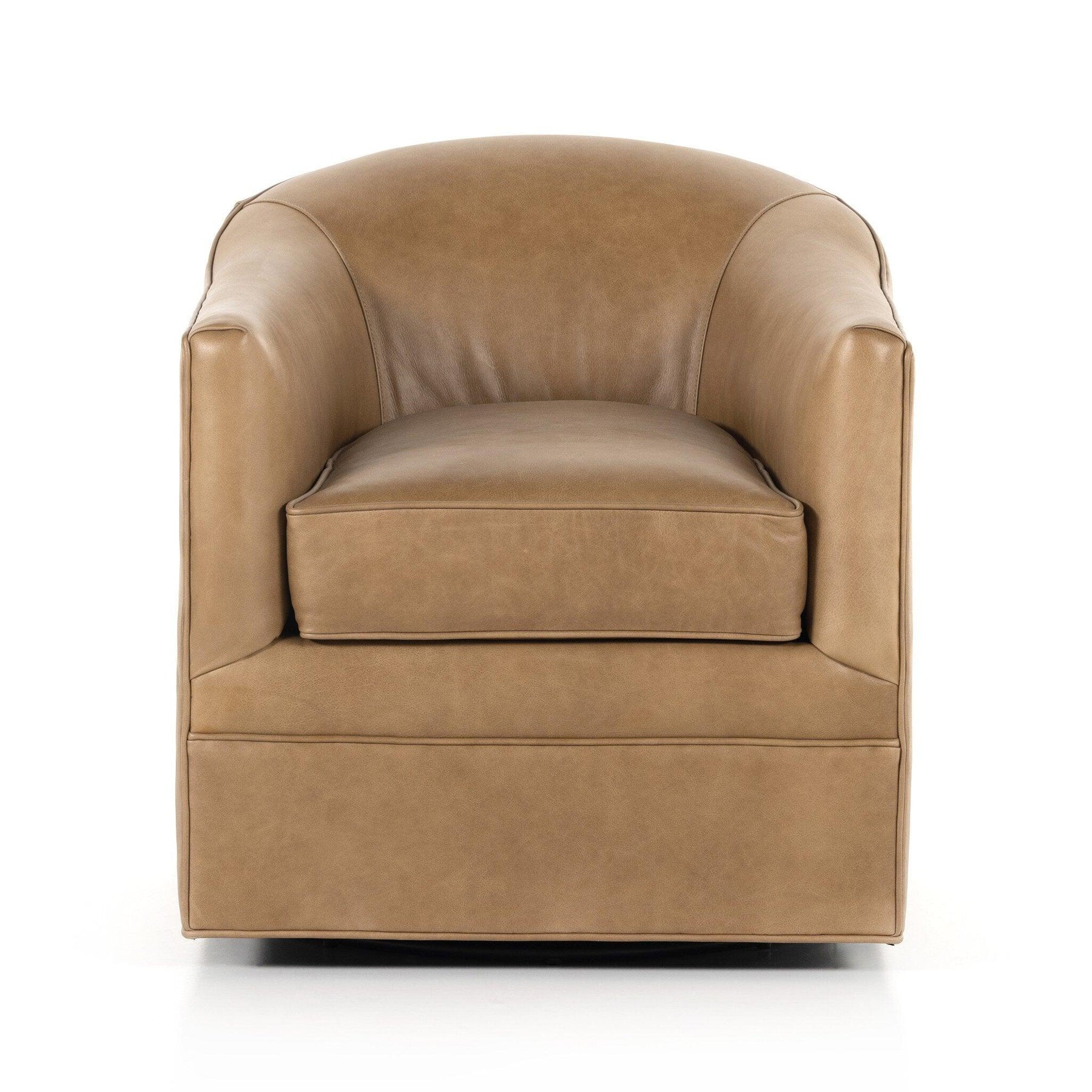 Taupe top-grain leather covers transitional barrel-shaped seating with a 360-degree swivel. Leather is intentionally finished for a casual lived-in look.