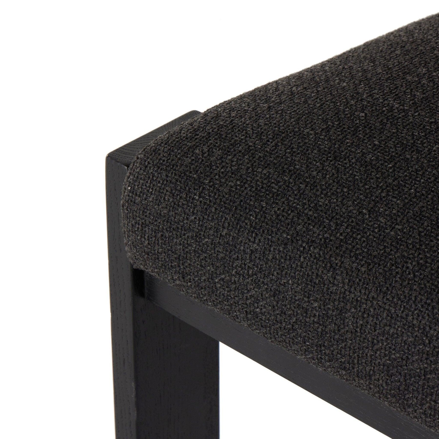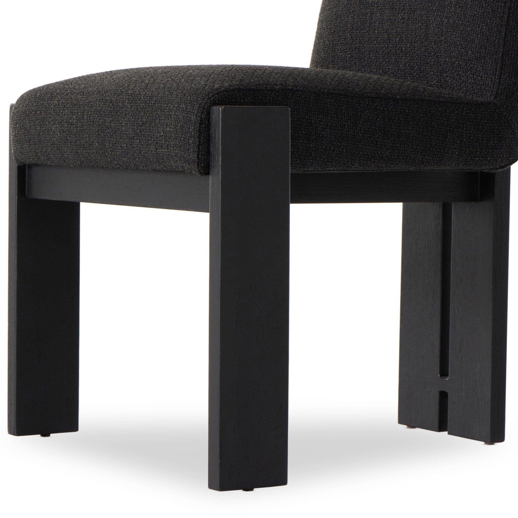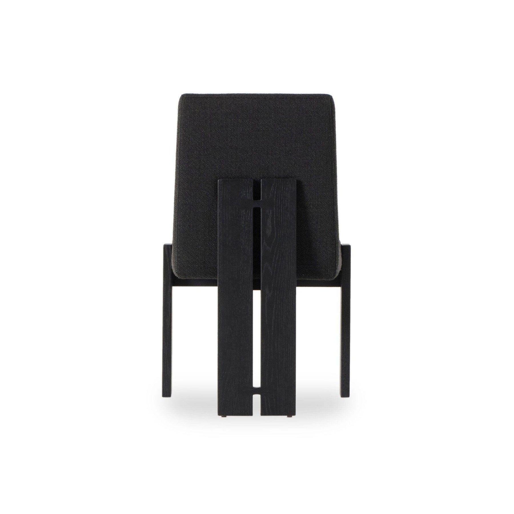 Unique in shape with a dark monochromatic look. Black-brushed parawood forms an angular frame featuring butterfly joints between the back legs. Black high-performance fabric is the smart choice for everyday dining. Performance fabrics are specially created to withstand spills stains high traffic and wear ensuring long-term comfort and unmatched durability.