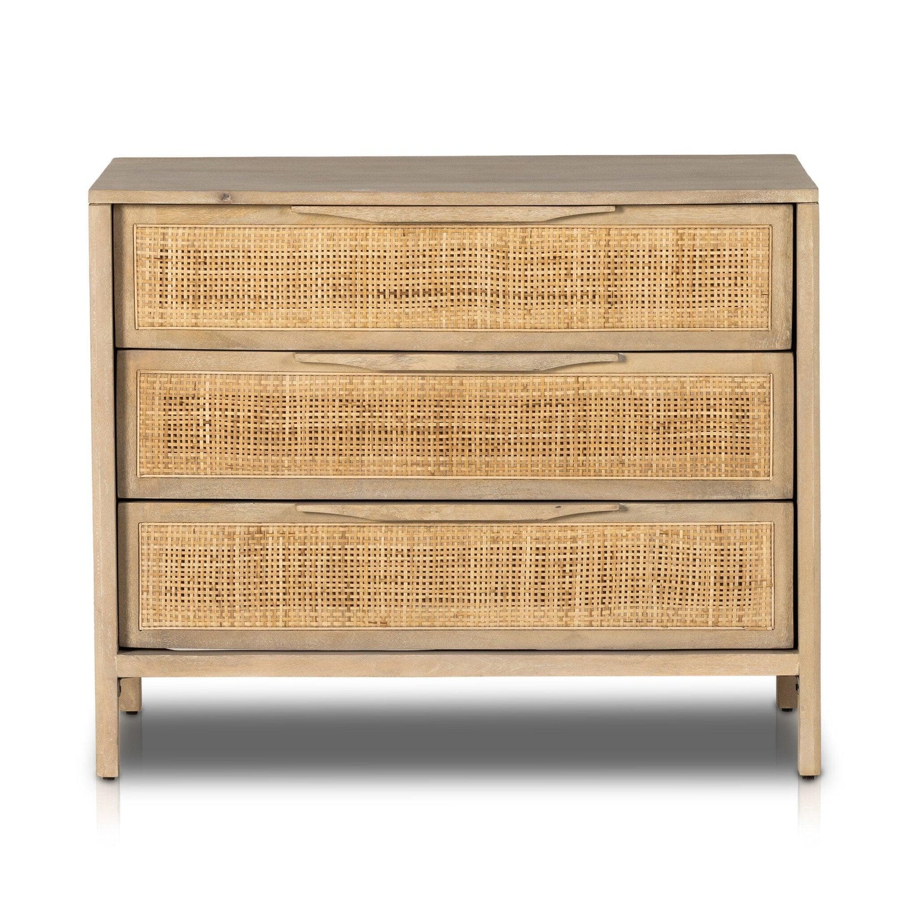 Natural mango frames inset woven cane for a light textural look with organic allure. Three spacious drawers provide plenty of closed storage.