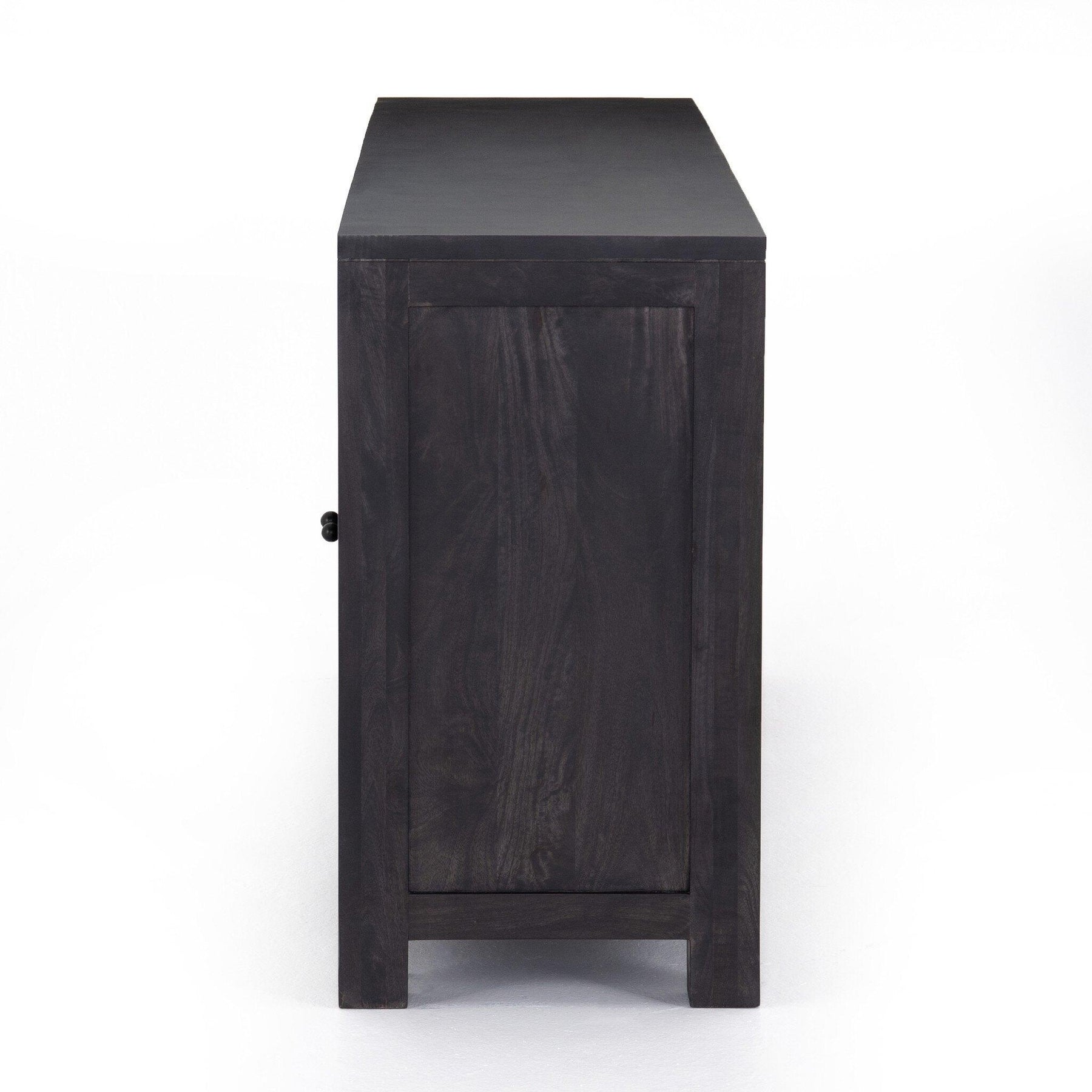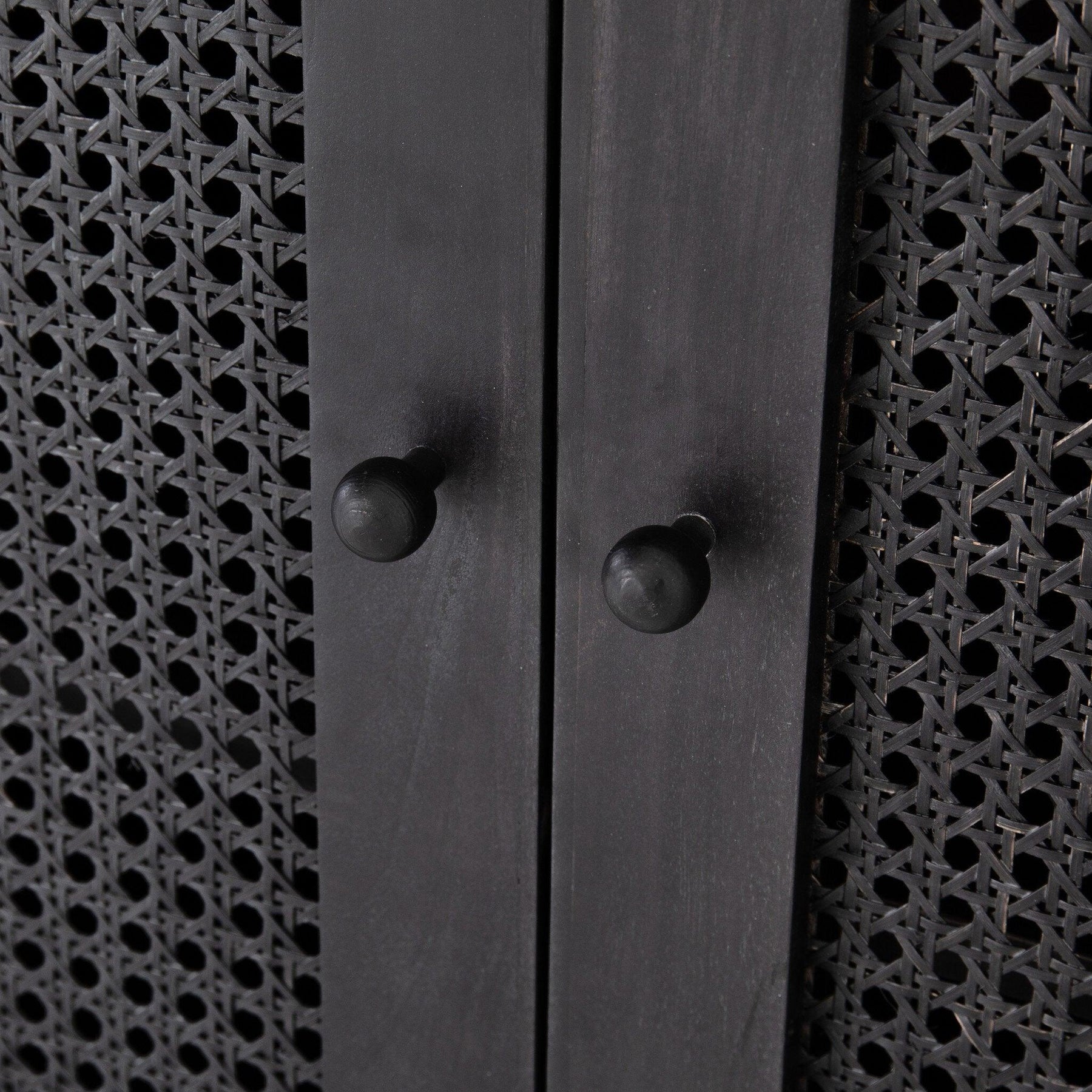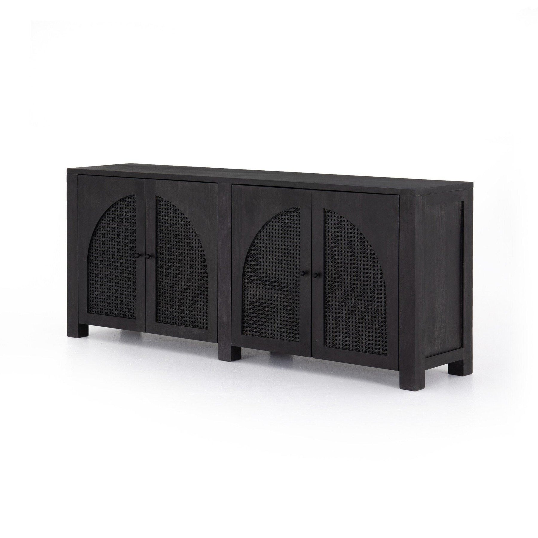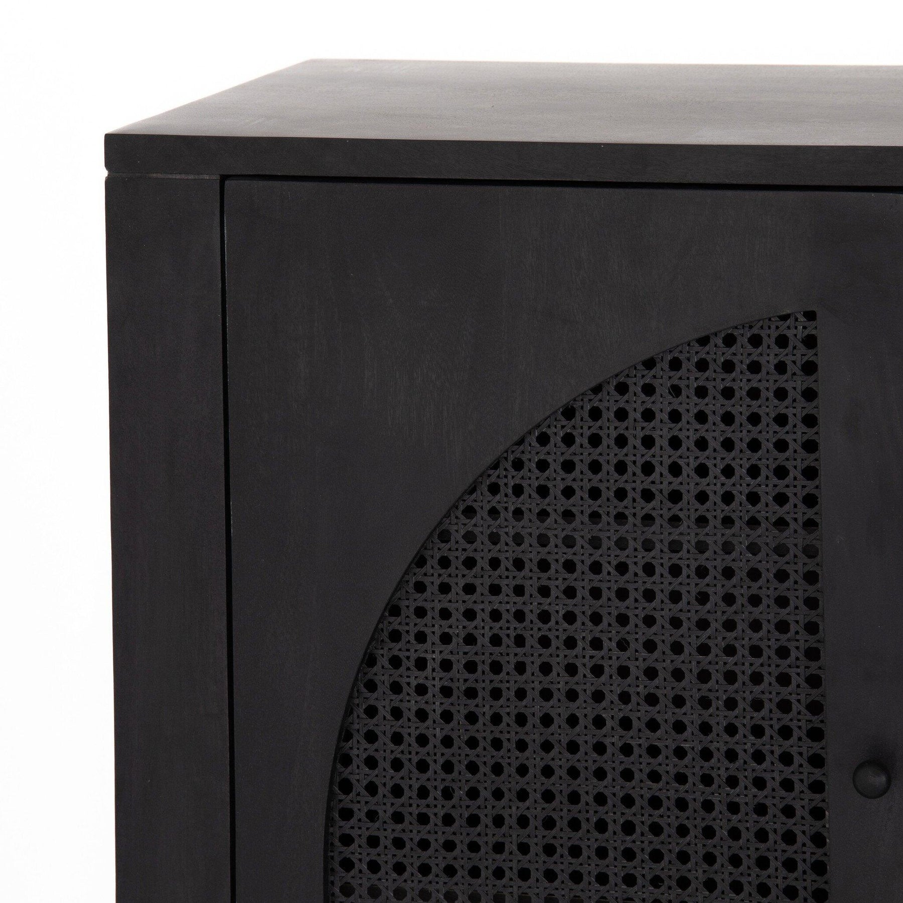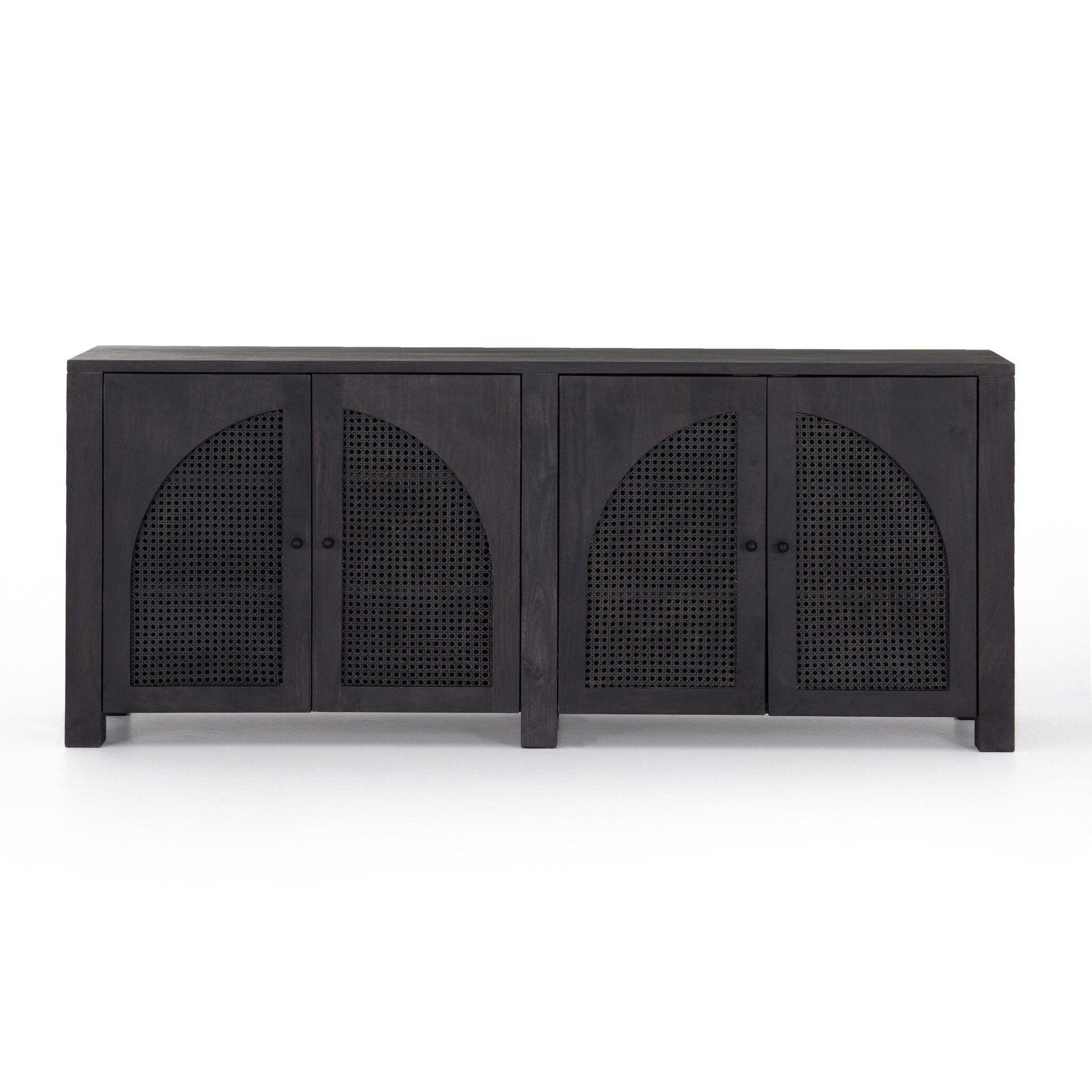 Grand in scale and presence. Black-washed mango encases arched cane door panels featuring black-finished iron hardware meeting a forward-thinking material mix with monochromatic vibes.