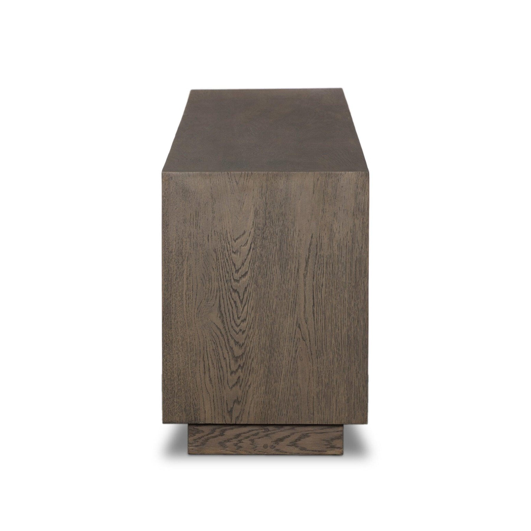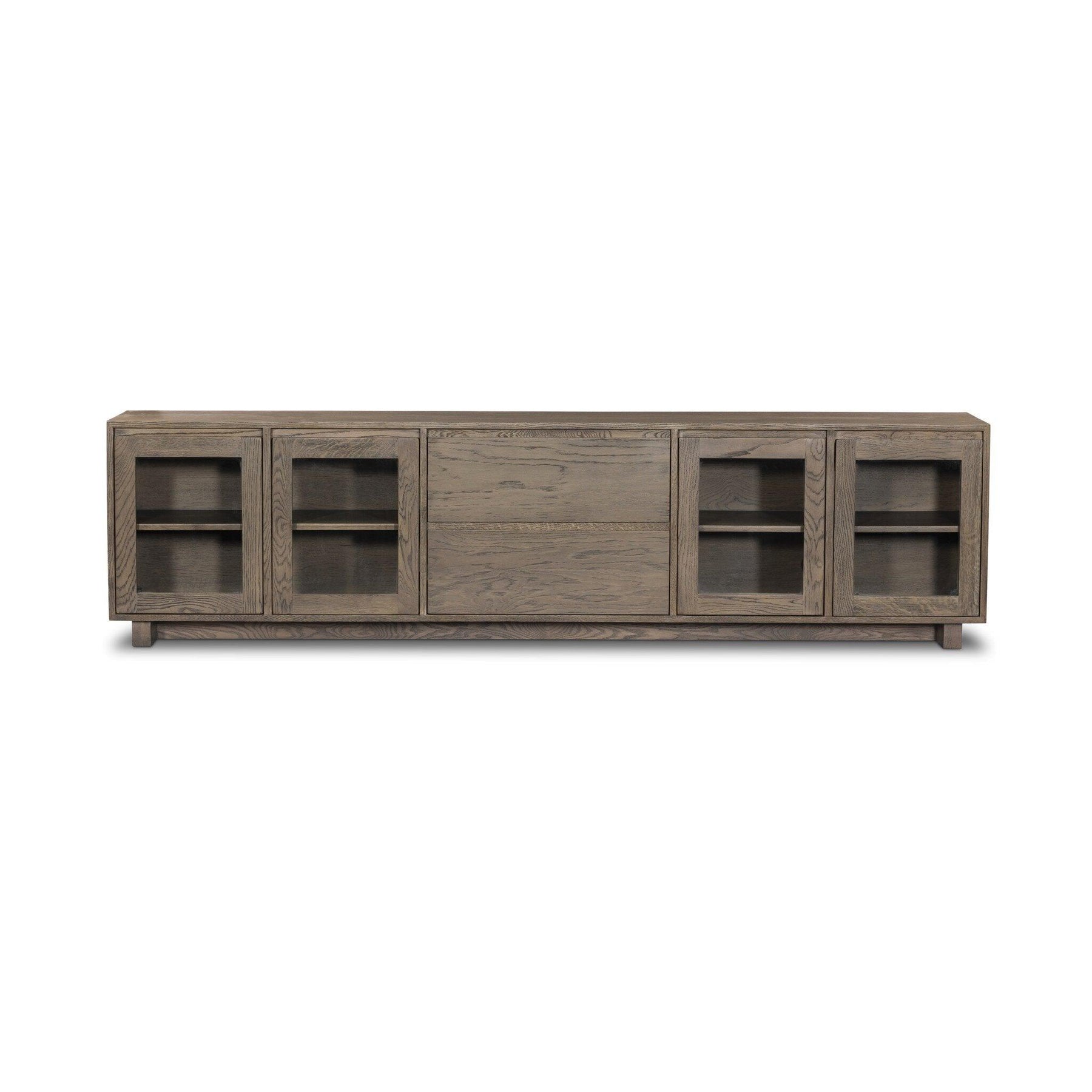 Grand-scale with a wide low profile. Glass doors bookend central wood drawers balancing display and concealed storage. Worn oak finish highlights clean lines anchoring modern spaces with understated impact.