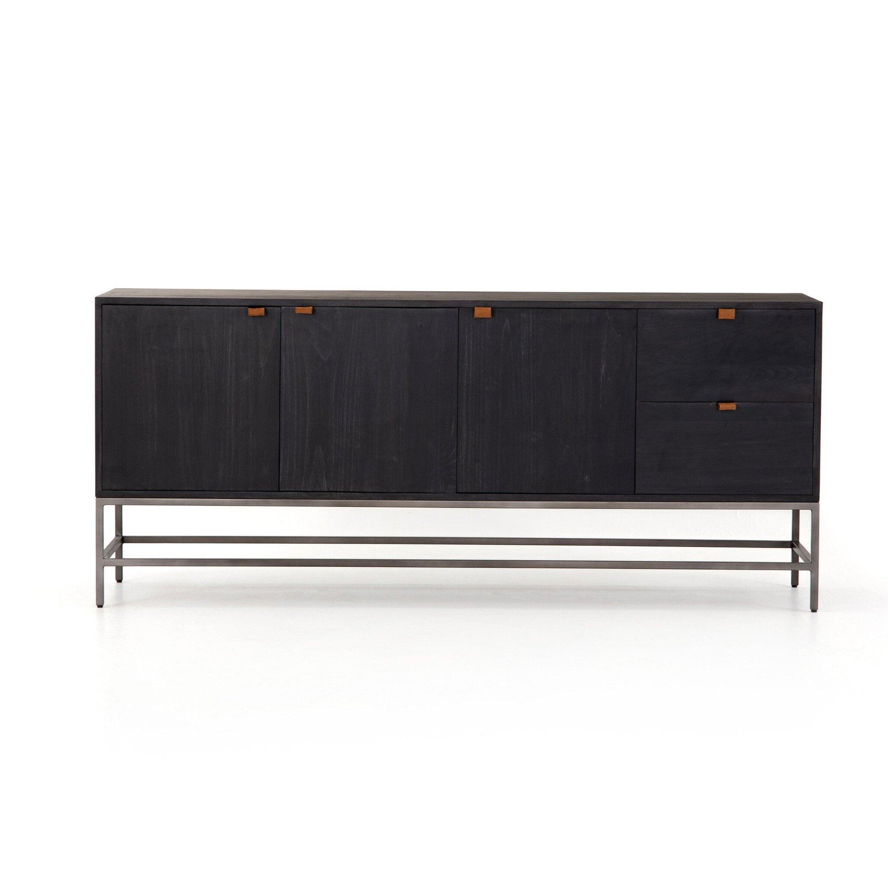 Inspired by clean mid-century design a stylish sideboard of auburn poplar offers plenty of storage space thanks to interior cabinetry and spacious dual drawers. Metal-secured leather pulls add a textural element of surprise.