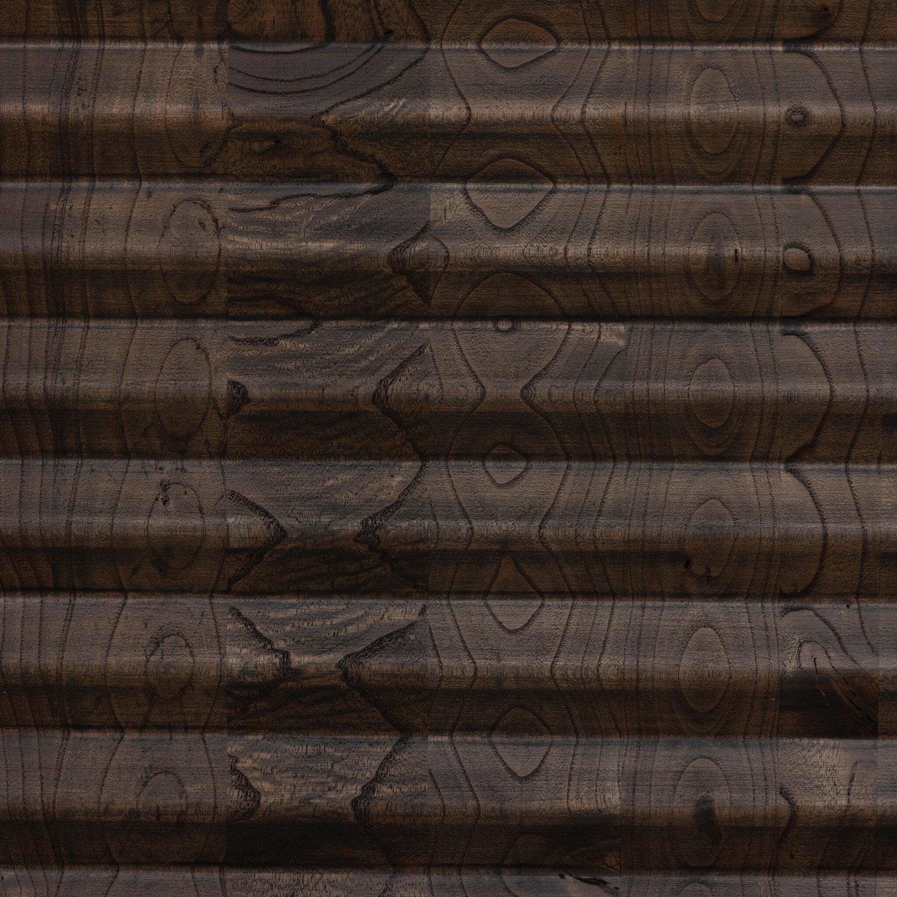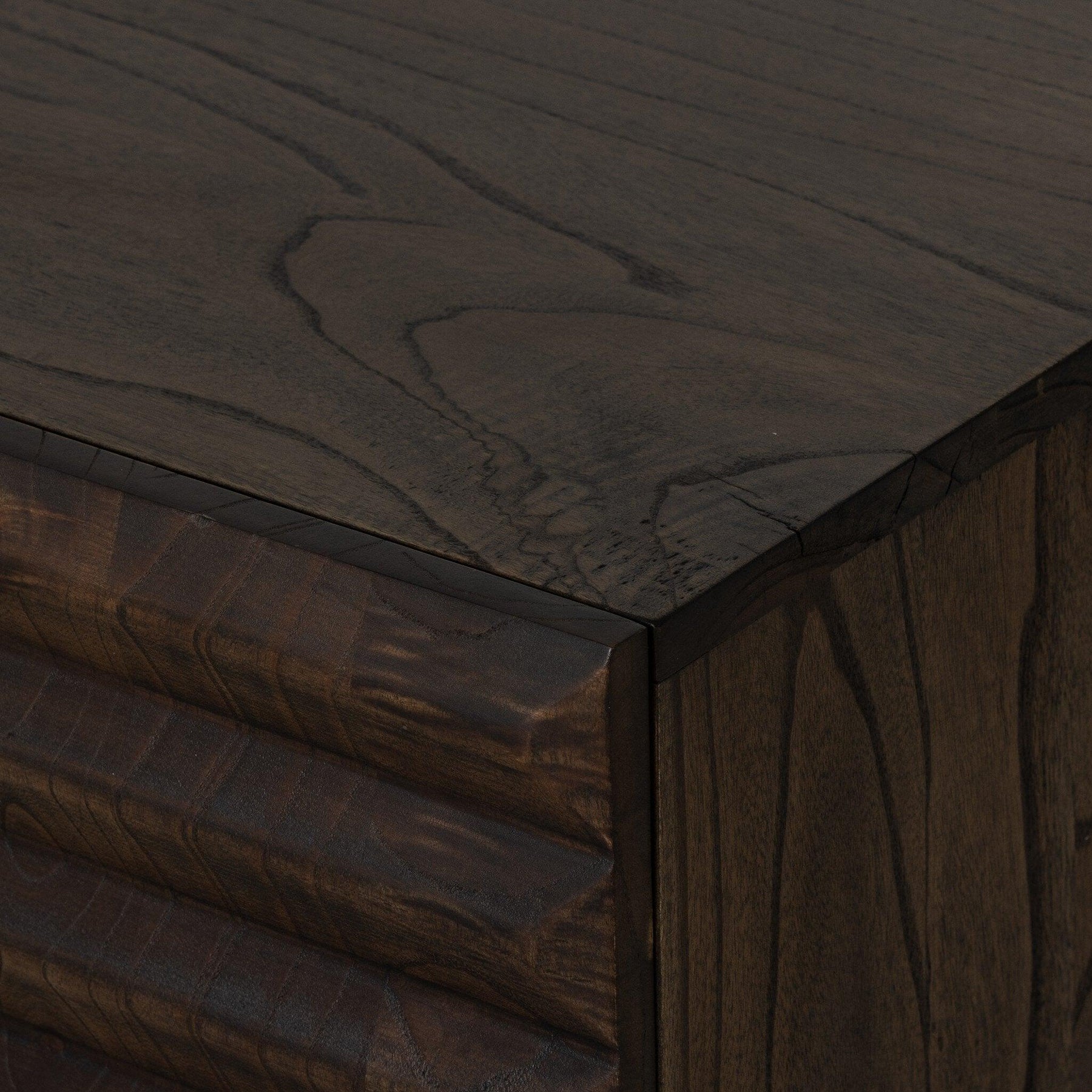 Made from dark-finished neem native to India Africa and other semi-tropical regions chamfer detailing brings a linear textured look to a storage-driven media console. Dual rear cutouts for cord management.