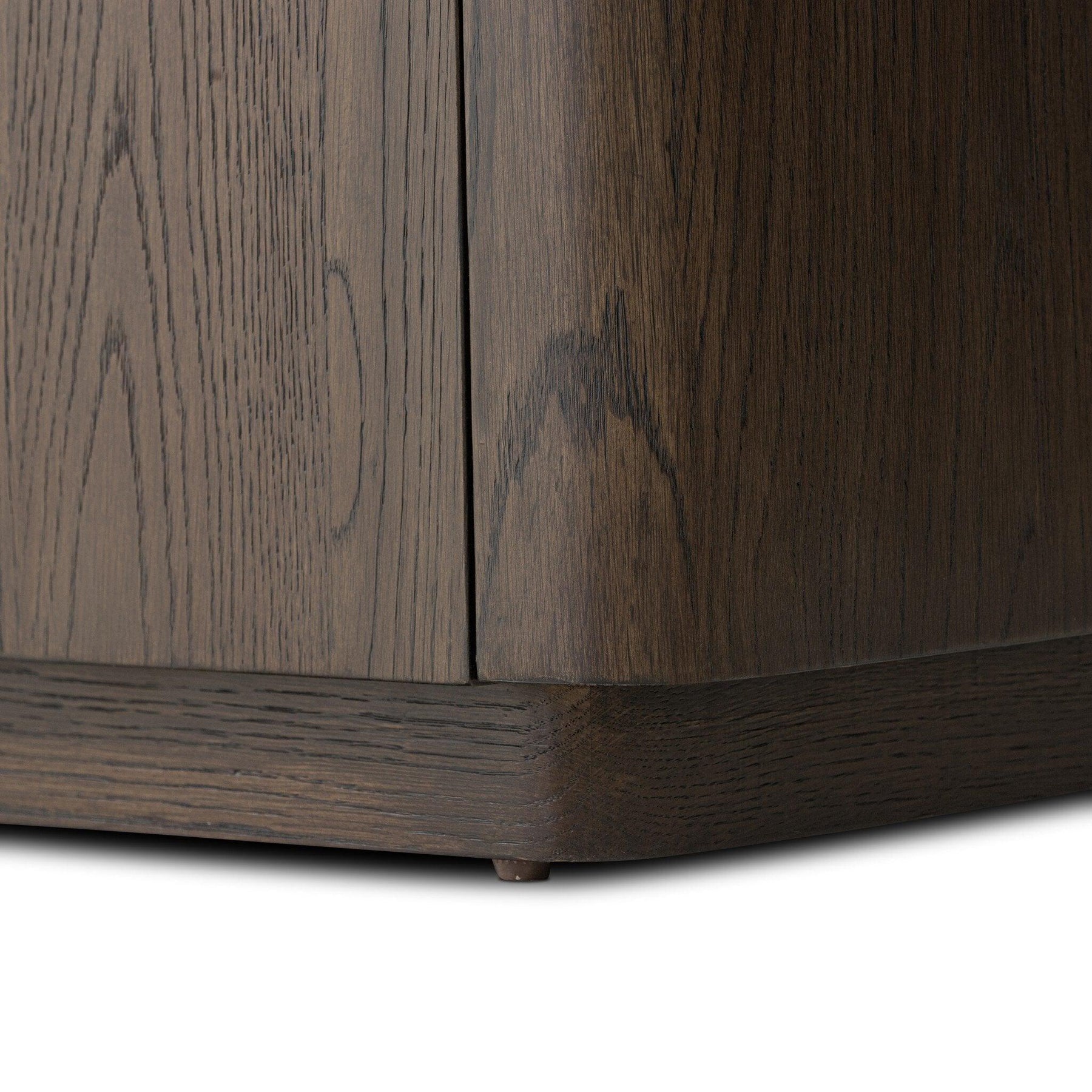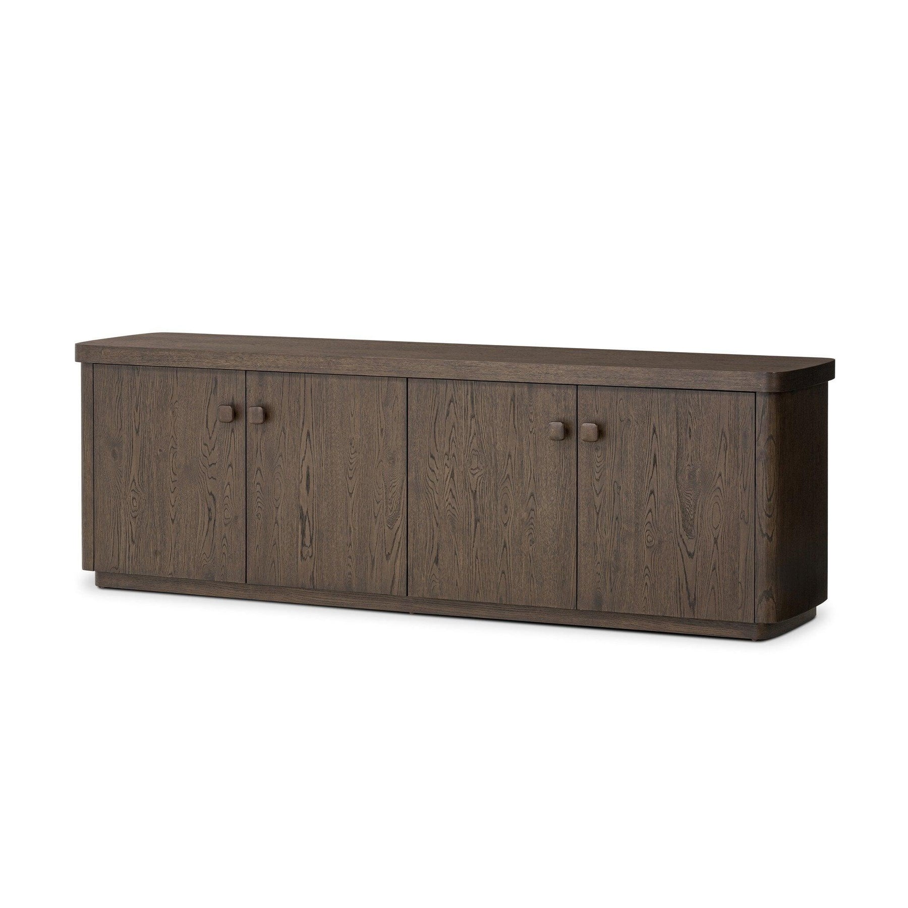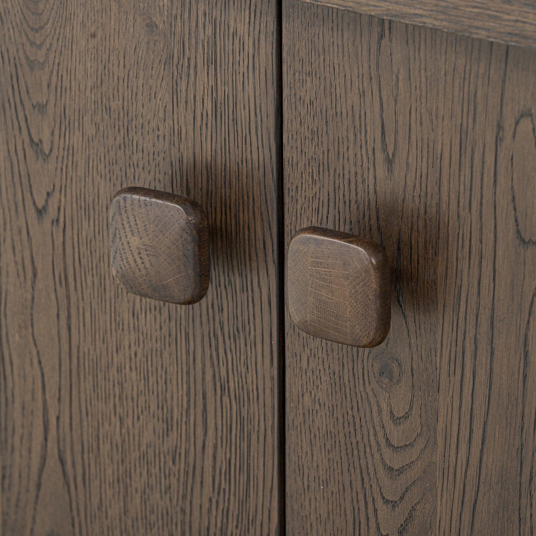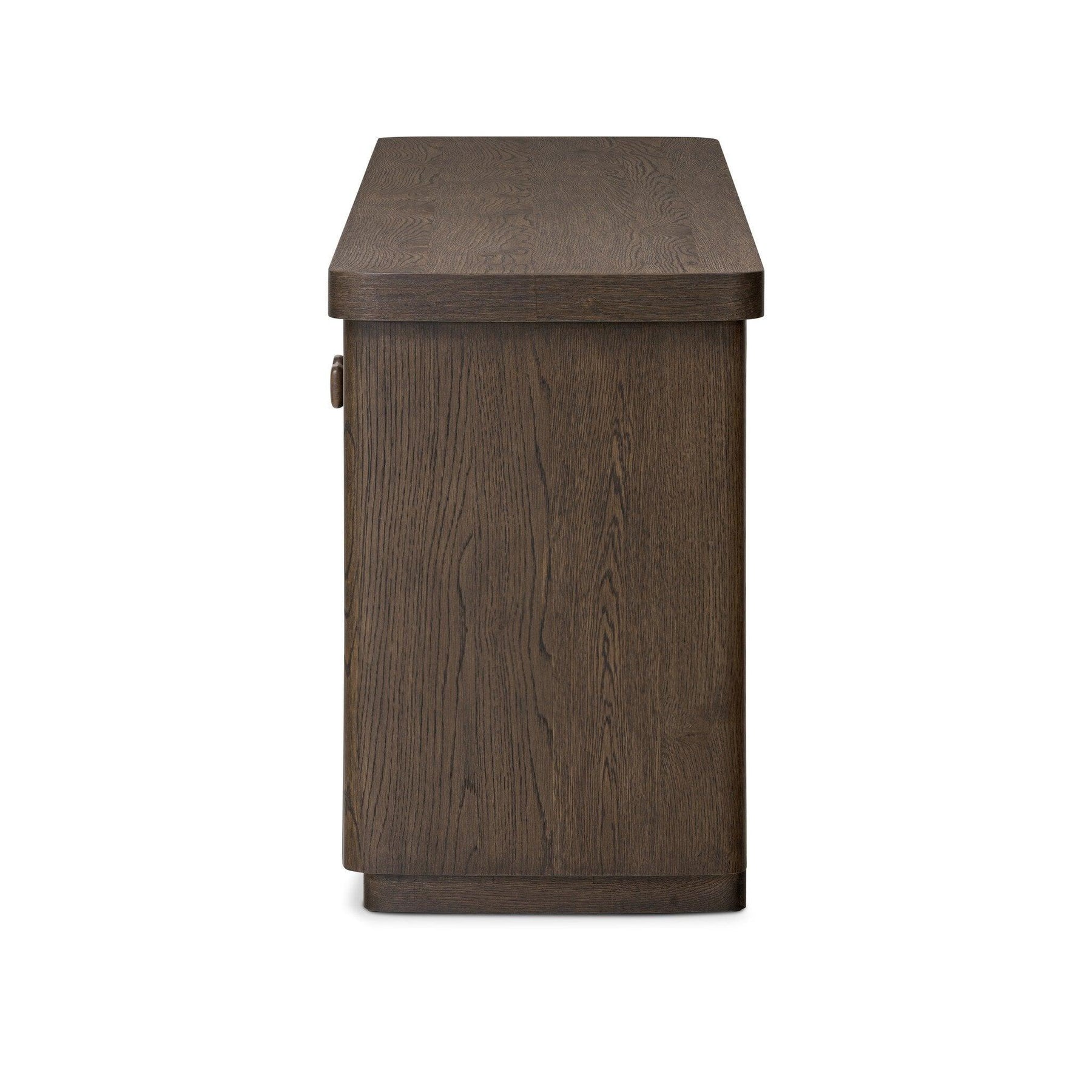 Made from rustic brown oak a spacious sideboard is streamlined while not short on presence with its thick top plinth base and oversized hardware.