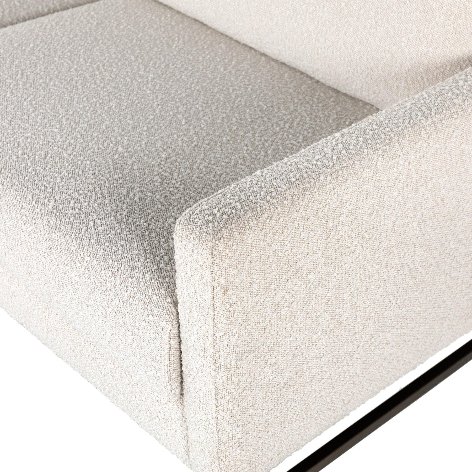 Plush and modern-minded. Atop an airy bronze-finished iron base thick boucle-like upholstery features clean angular track arms and comfy cushioning for the best of both worlds.