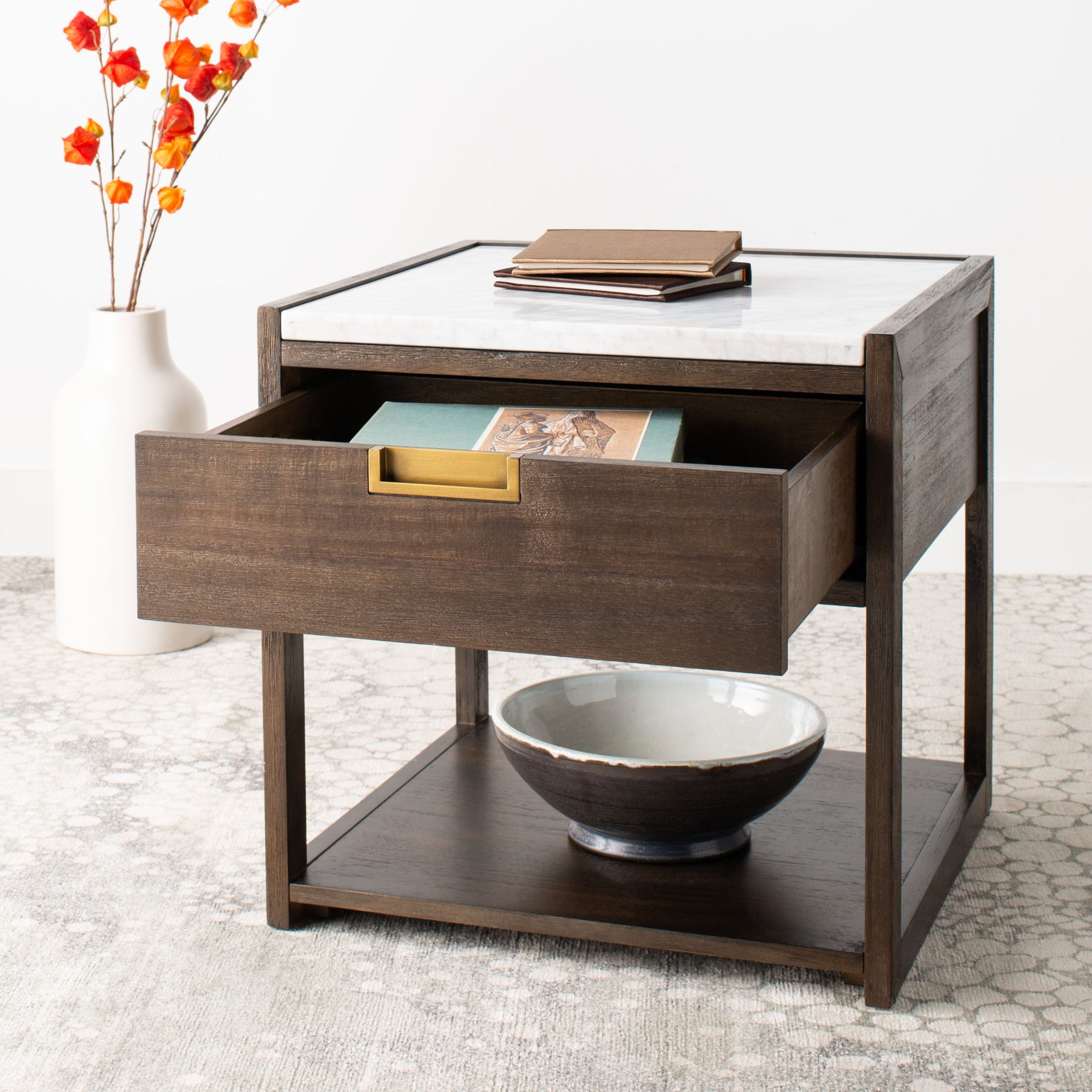 Constructed from marble and brass and solid wood, the Adeline 1 Drawer Nightstand reflects a dedication to materiality that elevates it beyond mere function into the realm of collectible design. Each component is carefully selected for its visual integrity and structural performance, ensuring that the piece maintains its beauty through years of daily use. Available in DARK CHOCOLATE, BLACK, it integrates seamlessly across diverse design palettes, from the strictly monochromatic to the boldly eclectic. The finish work is executed with a precision that speaks to the exacting standards applied at every stage of production.