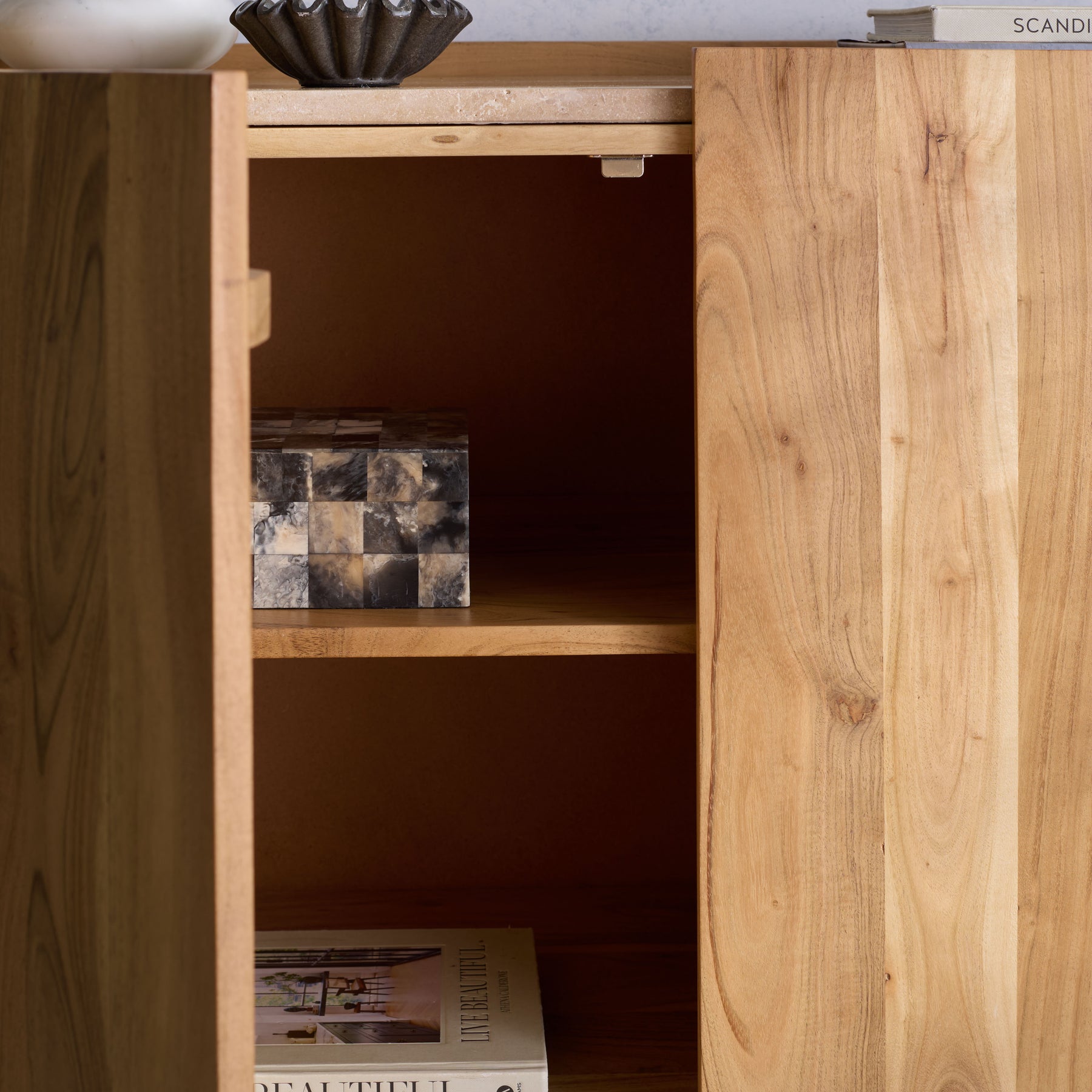 Introducing the Ashlietta Travertine Top Sideboard, a stunning addition that blends natural elegance with timeless design. Featuring a beautiful travertine surface, this piece exudes sophistication while serving as a functional storage solution. The natural hues of the travertine harmonize effortlessly with its wooden base, creating a versatile look that complements a variety of interior styles.