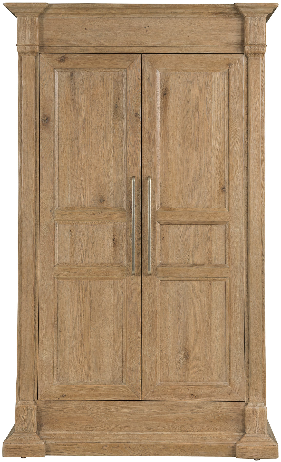 This wardrobe in Buckboard finish offers versatile storage with two full-length doors, two adjustable shelves, a removable clothing rod, and a tray drawer with a jewelry tray. A hidden lift-lid storage compartment adds convenience, while the soft-close hinges ensure smooth use.