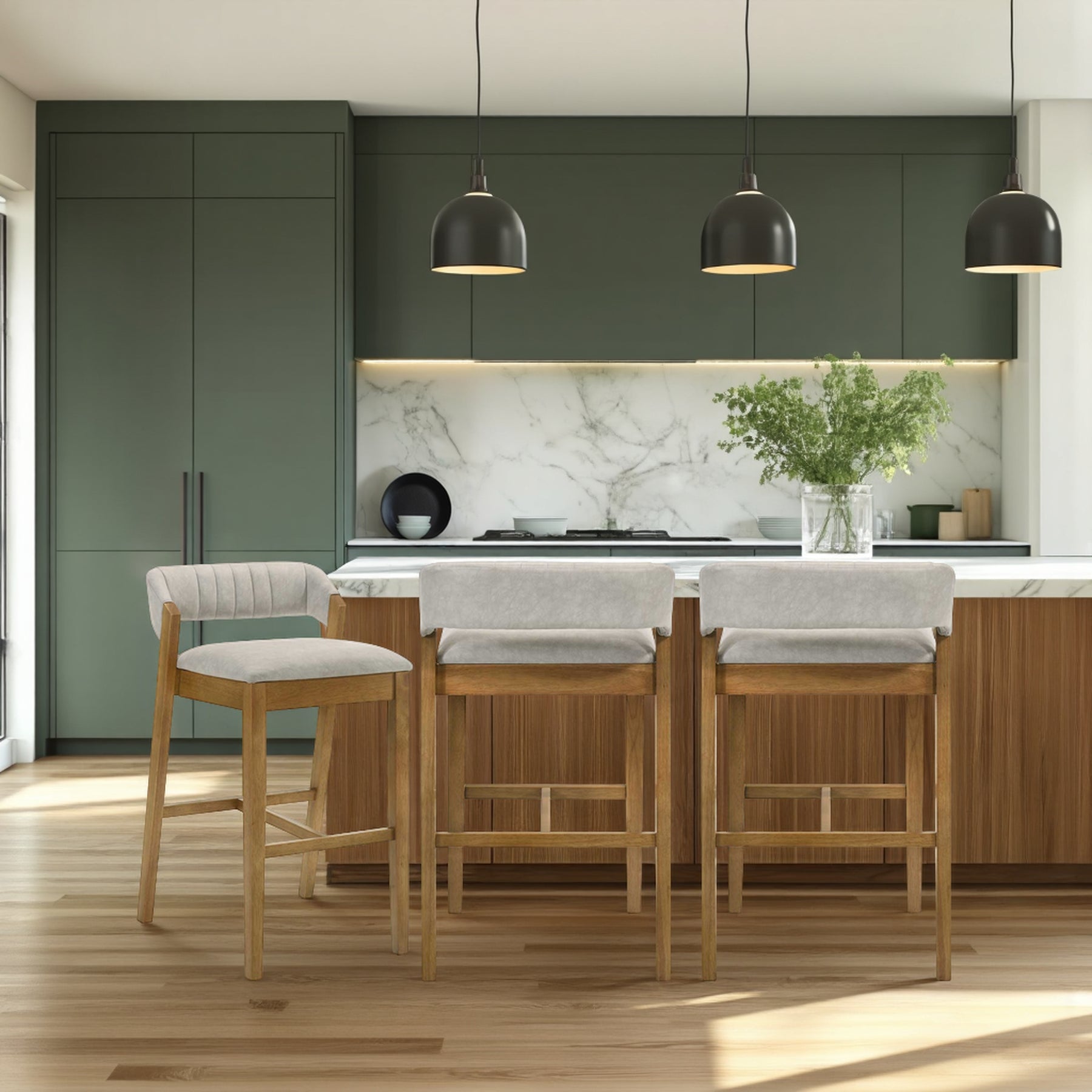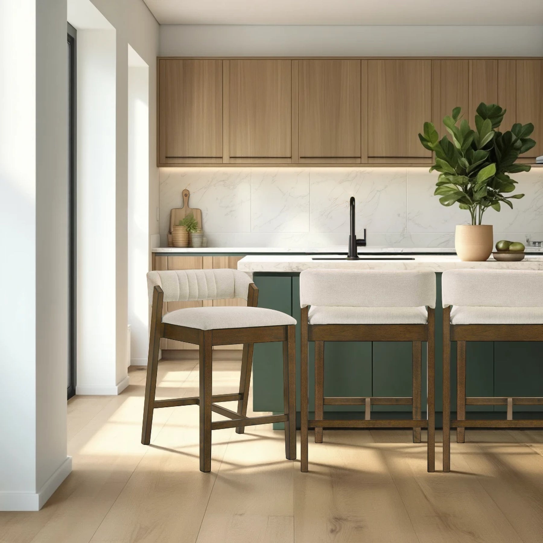 Sleek lines and cozy comfort come together in the Landyn Barstool Collection, a modern seating solution designed to elevate your kitchen, dining, or entertainment area. Featuring a spacious rectangular seat, these stools are available in both counter and bar heights to suit your setup. Upholstered in soft, textured fabric in shades like sophisticated gray or warm ecru, the seats offer a refined look with inviting comfort.