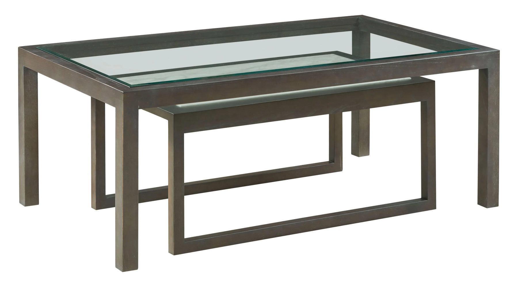 Sculptural wood frames finished in Dark Sable with glass and white Carrara stone tops. Gansett tables can nest parallel or perpendicular to one another.