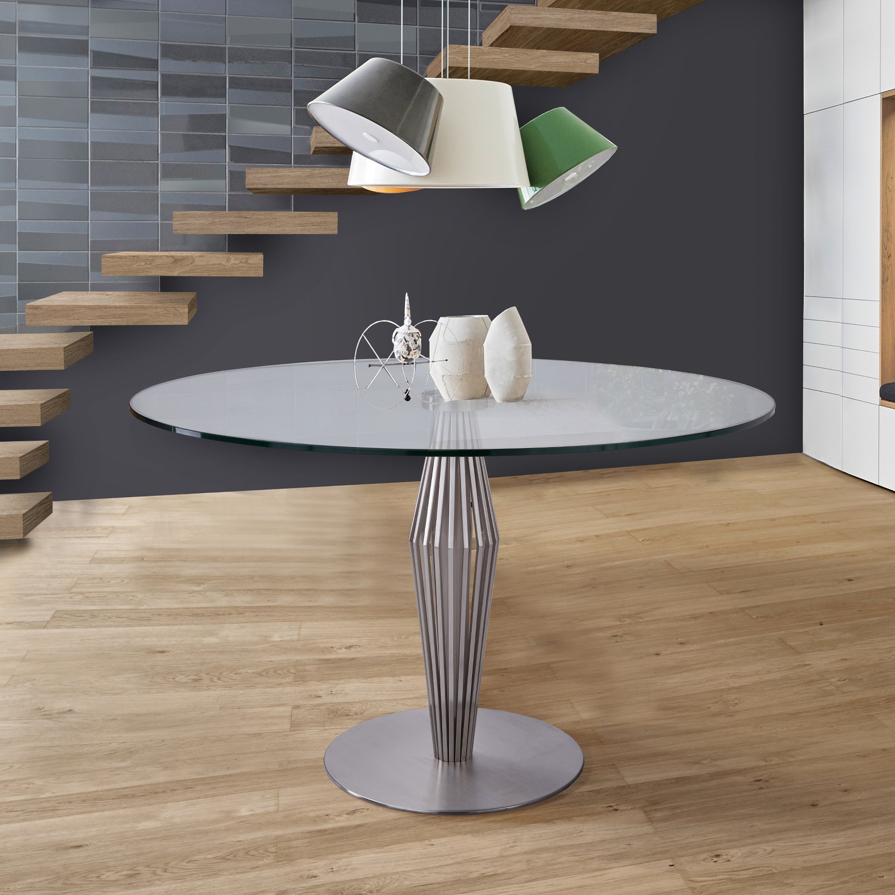 The Lindsey round dining table with 48" clear tempered glass top with stainless steel base is a beautifully made table that will add style and beauty to your dining area. The pedestal base of this dining table is beautifully constructed of stainless. It is sturdy, built to stun, and never makes for a boring dining experience. This table will absolutely grab attention at your next social gathering. This table seats up to five people, giving you ample tabletop space. The Lindsey adds a touch of sophistication and glamour to your home with this modern dining table. Classically styled, this timeless pedestal table perfectly complements a modern and contemporary home decor. This product ships in one box with an easy and quick set up. We stand by the quality, the craftsmanship, and the integrity of our product by offering a 1-year warranty for all our products. We want our customers to enjoy our product and we will always be there to help with our top-notch customer service support. Product Dimensions: 48"W x 48"D x 29. 5"H