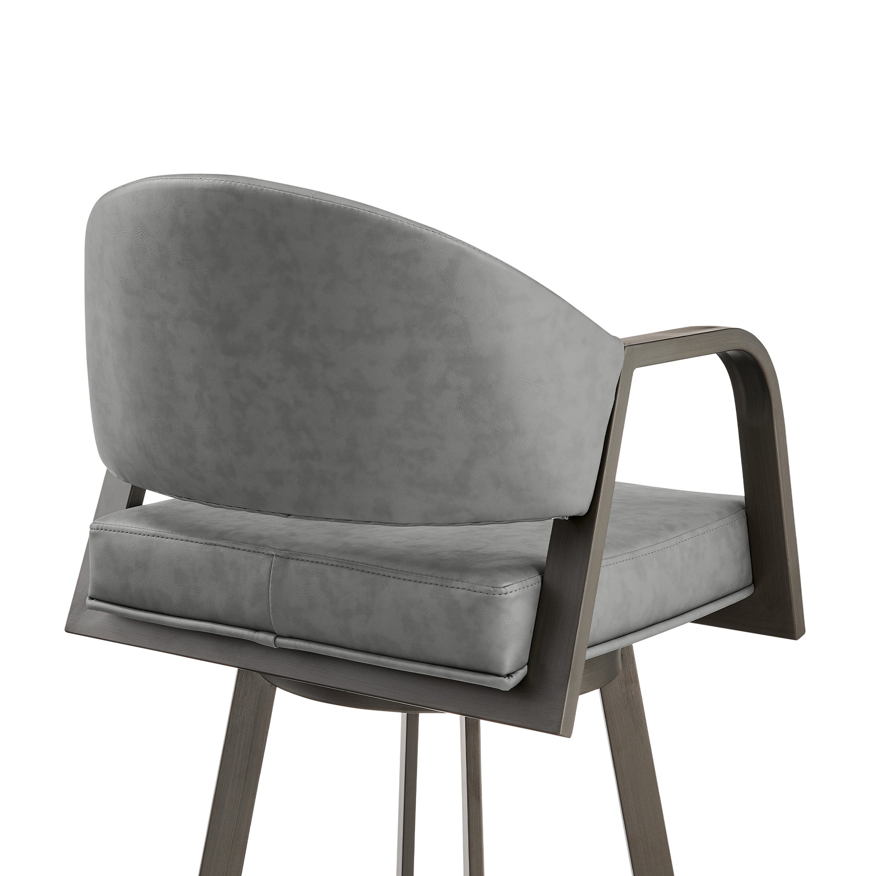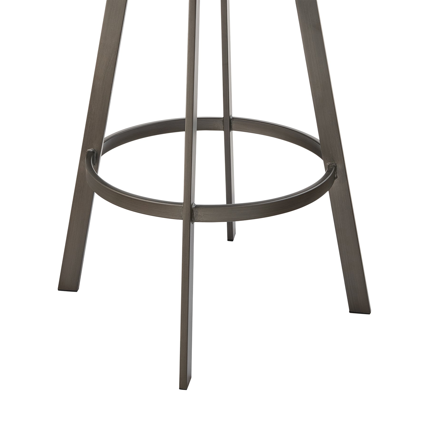 Give a sleek and stylish update to your home with the Marcie Swivel Counter or Bar Height Stool in Faux Leather and Metal by Armen Living. Combining modern and industrial notes, our barstool is ready to impress with its timeless charm and comfort. The sturdy, iron arms and built-in circular footrest demonstrate how this barstool was designed with your comfort in mind. The curved backrest provides support for a long, comfortable stay. The channeling detail and luxurious faux leather upholstery lend chic and modern appeal to the Marcie barstool. This polyurethane faux leather does not crack easily and is water, fade, and stain-resistant to offer easy maintenance and a longer lifespan for your new favorite piece of furniture. The seat is generously cushioned with 2.5 inches of high-density foam, and this stool features sturdy metal legs that can support up to 250 pounds. It serves as a stunning compliment to your kitchen island, pub table, home bar, or adjustable desk to add distinctive character and charm. This barstool includes a smooth 360-degree swivel function that allows you to engage with everyone around you while being able to navigate compact spaces. The Marcie Swivel Counter or Bar Height Stool is available in a Mineral Finish with Vintage Gray or Vintage Black Faux Leather to make a stunning statement in your home.