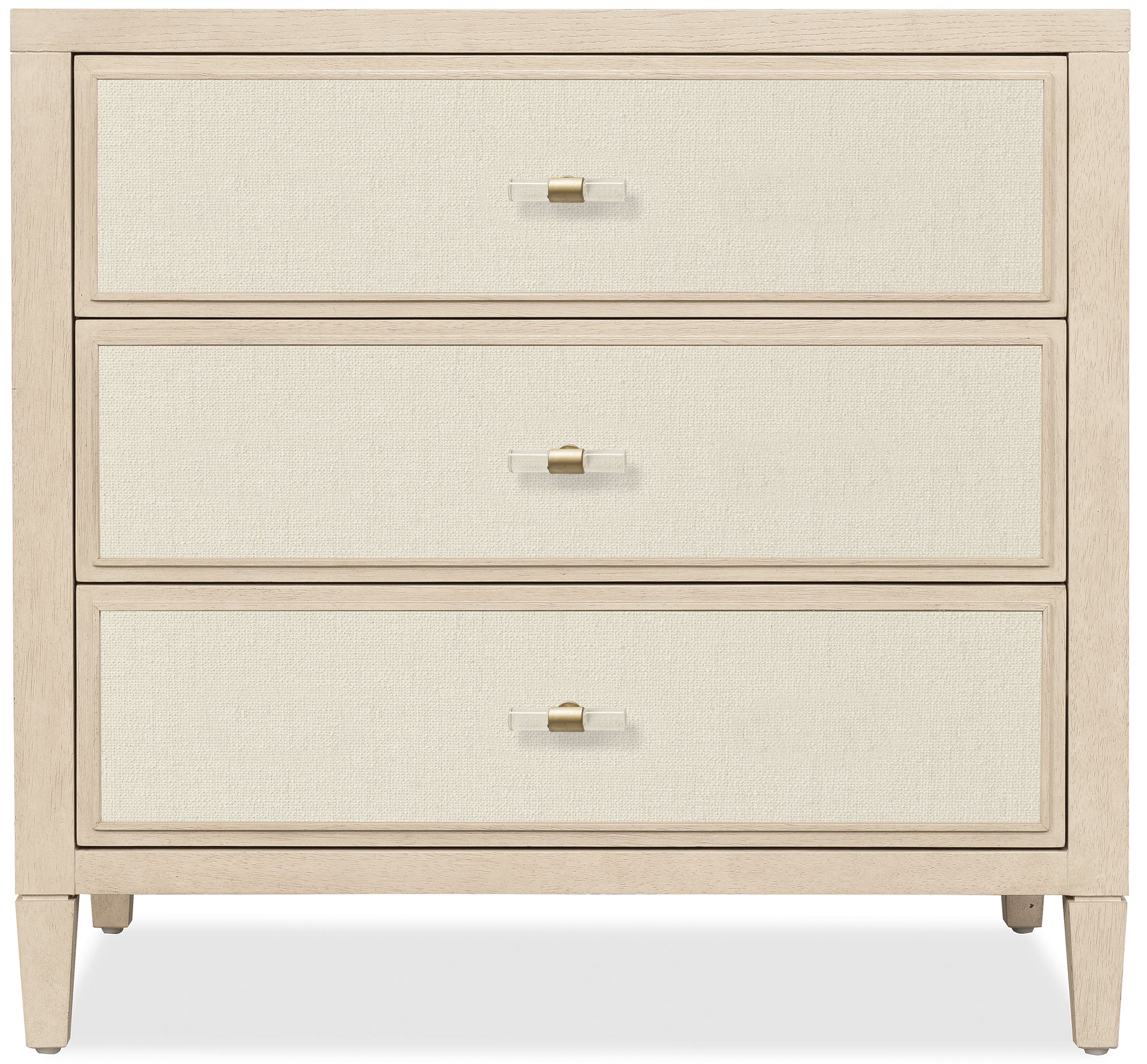 This three-drawer nightstand pairs tactile fabric fronts with tech-friendly functionality thanks to an integrated charging station. The soft oak finish and tapered legs bring quiet luxury to bedside living.